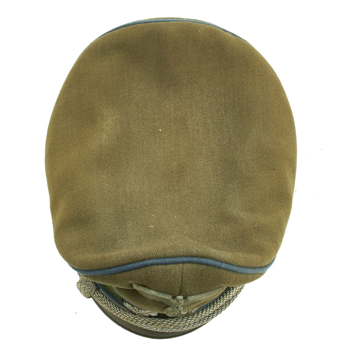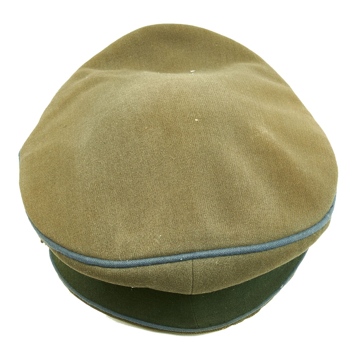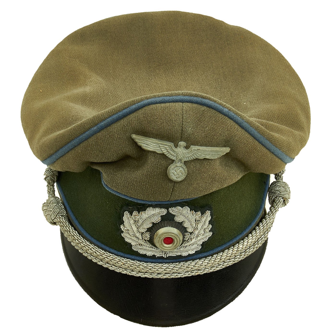 Original Item: Only One Available. This is a very good condition German WWII Military Administration Officer's Schirmmütze Visor Cap, with a lovely "Crushed" shape. This "saddle-form" shape is highly desirable, and is only achieved on caps with a lot of wear and service. The cap shows high quality fabrication, made with typical Heer army feldgrau (Field Gray) green / gray wool with a forest green band and a traditional high front, with matching Blau (Blue) piping along the top edge and flanking either side of the band, the Waffenfarbe (Corps Color) for Vehicle troops (Kraftfahrparktruppen) and the Supply troop (Nachschubtruppe).