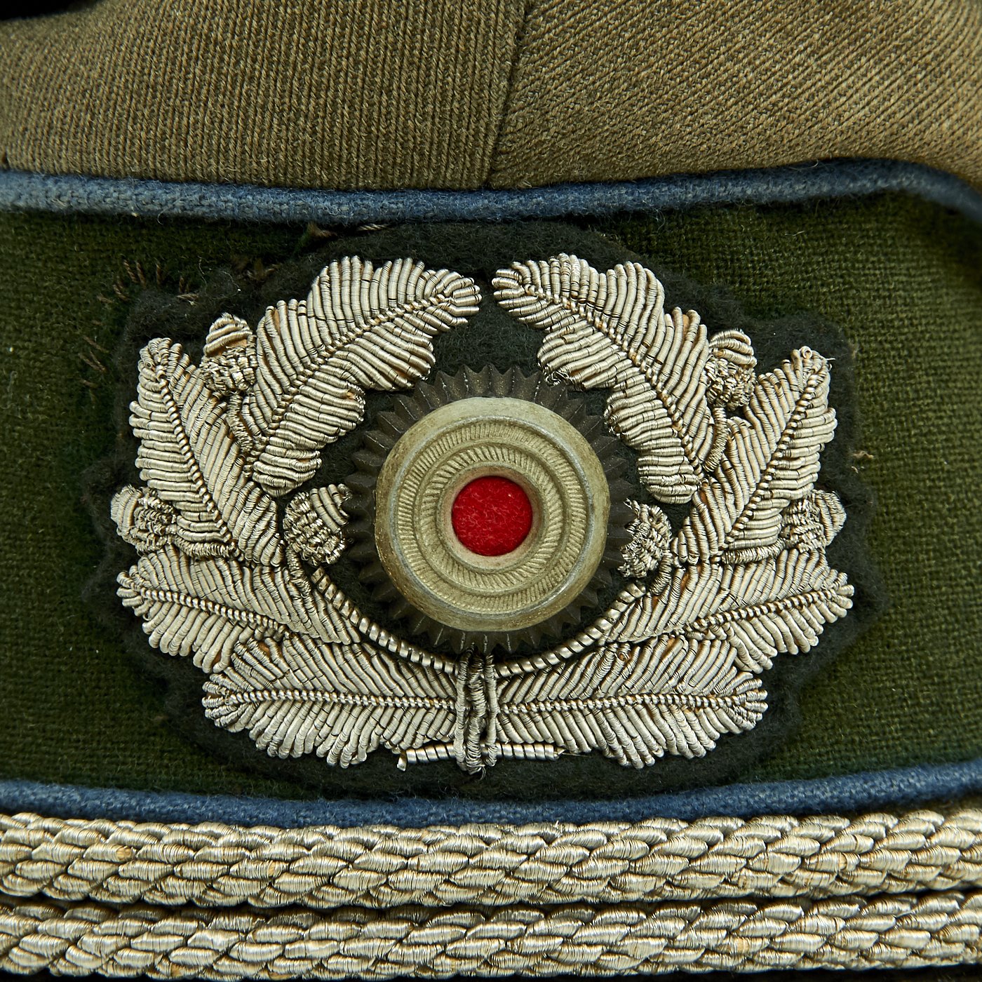 It is decorated with a well detailed aluminum Reichsadler National Eagle insignia on the peak and and an open silver bullion embroidered wreath surrounding a tri-color metal cockade on the band. It has the correct Silver bullion cord "chinstrap", attached to silvered buttons, indicating that this cap is for an Officer. The visor / peak on this cap is black-finished "vulcanfibre", the standard material for NCOs and Officers alike.