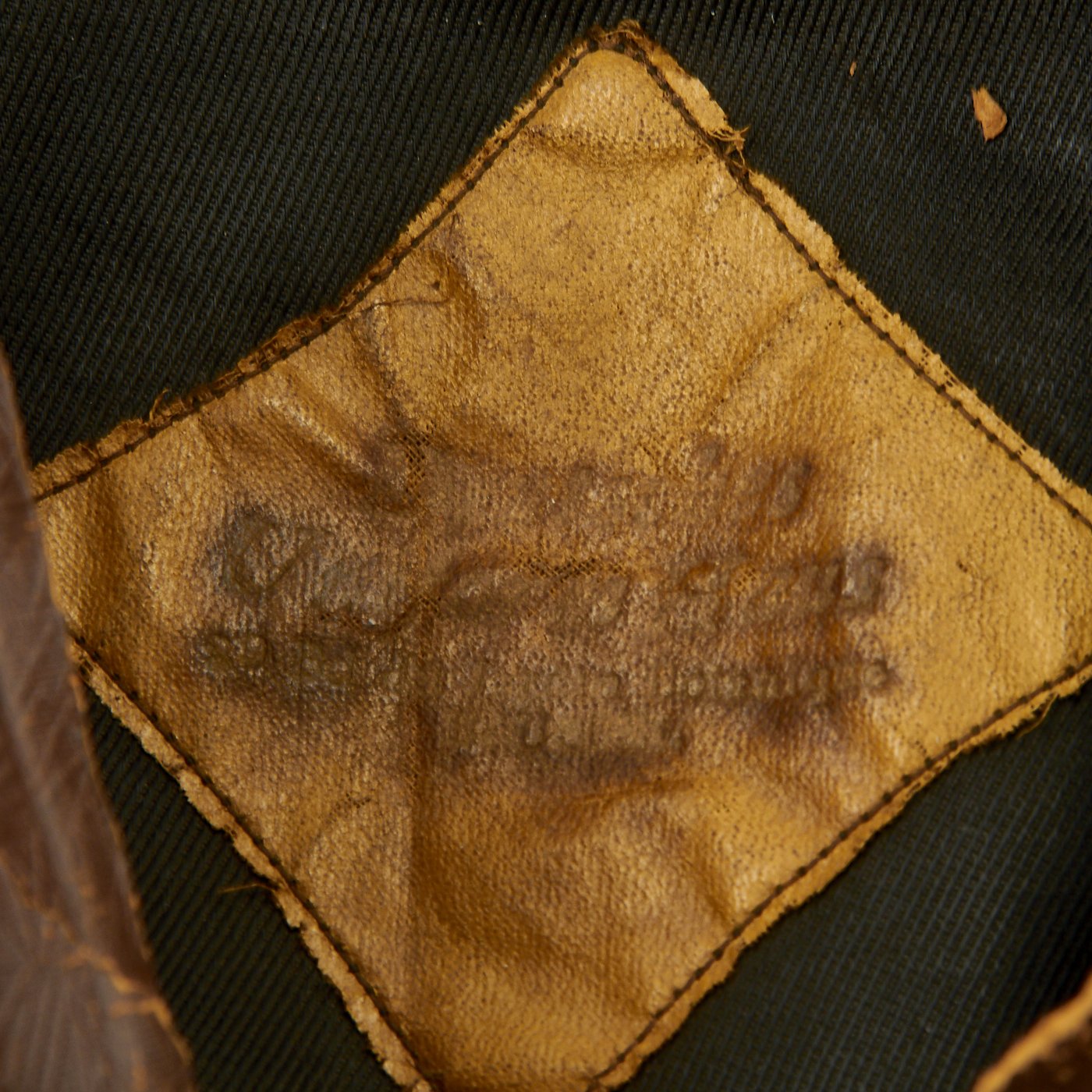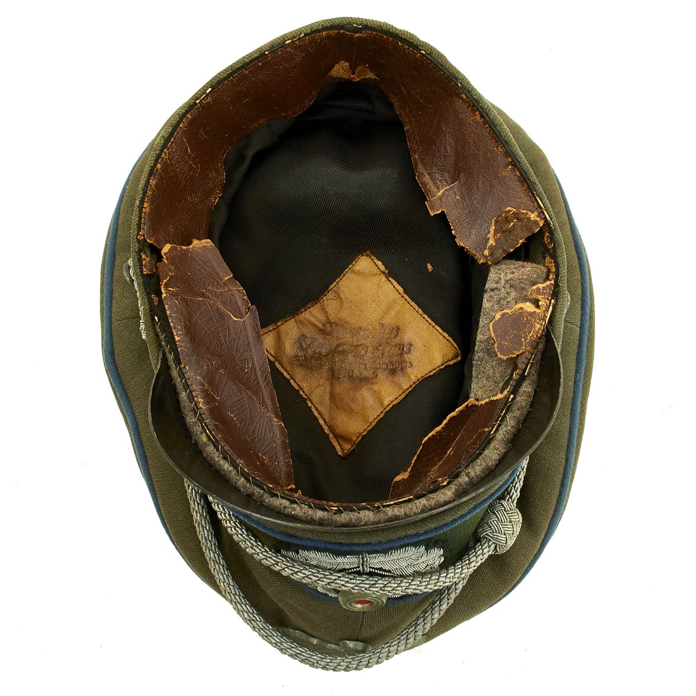 The cap is lined with black rayon fabric and still retains the complete leather top diamond. We unfortunately cannot read the faded maker markings. The brown leather sweatband is present, but shows much wear and has some tears. Some areas are completely missing. There is a felt pad under the front side for comfort. This definitely looks to be a bespoke cap, and not a standard issued example. It must have seen extensive use in service to get this type of wear.