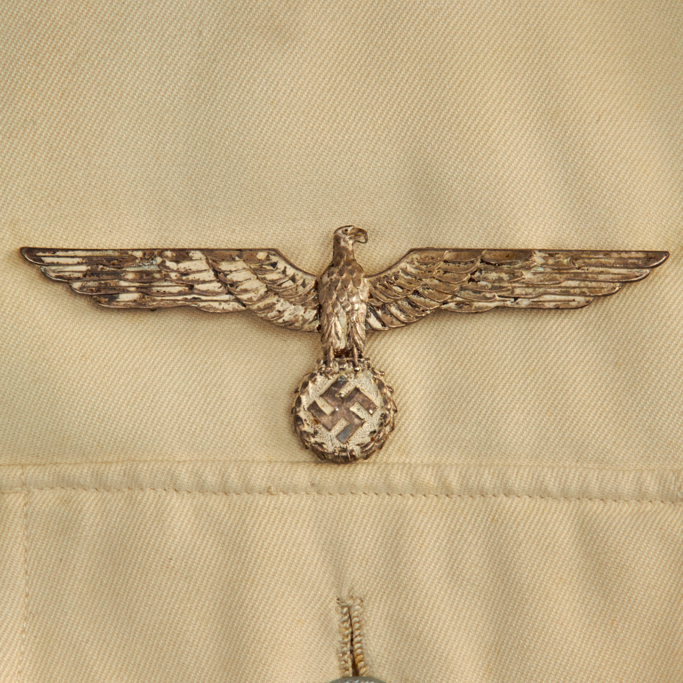 The right breast above the pocket is enriched with a silvered metal breast eagle insignia pin held in place via two horizontally-aligned vertical loops in white threading, with a third horizontal loop below which attaches to a hook on the bottom. The front has vertical closure of 8 metal buttons with pebbled uppers, all maker marked, held in place by rings on the underside and visible on the inside of the tunic under the interior flap. There are also two hook and hoop closures for the collar.