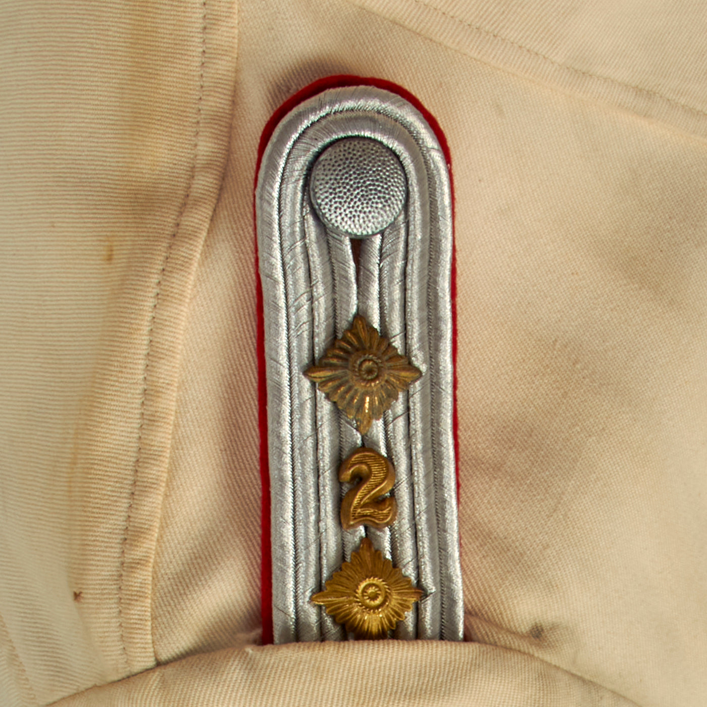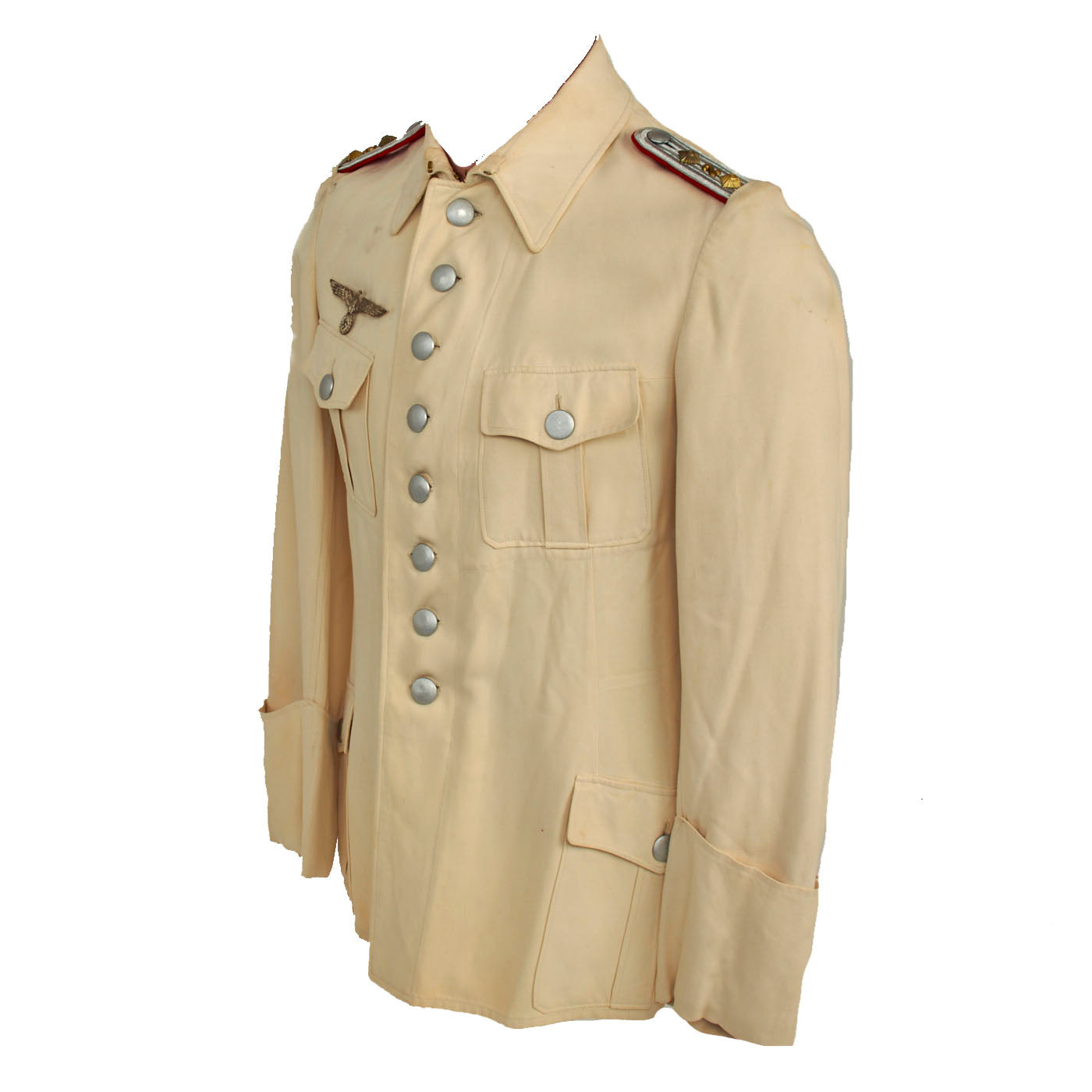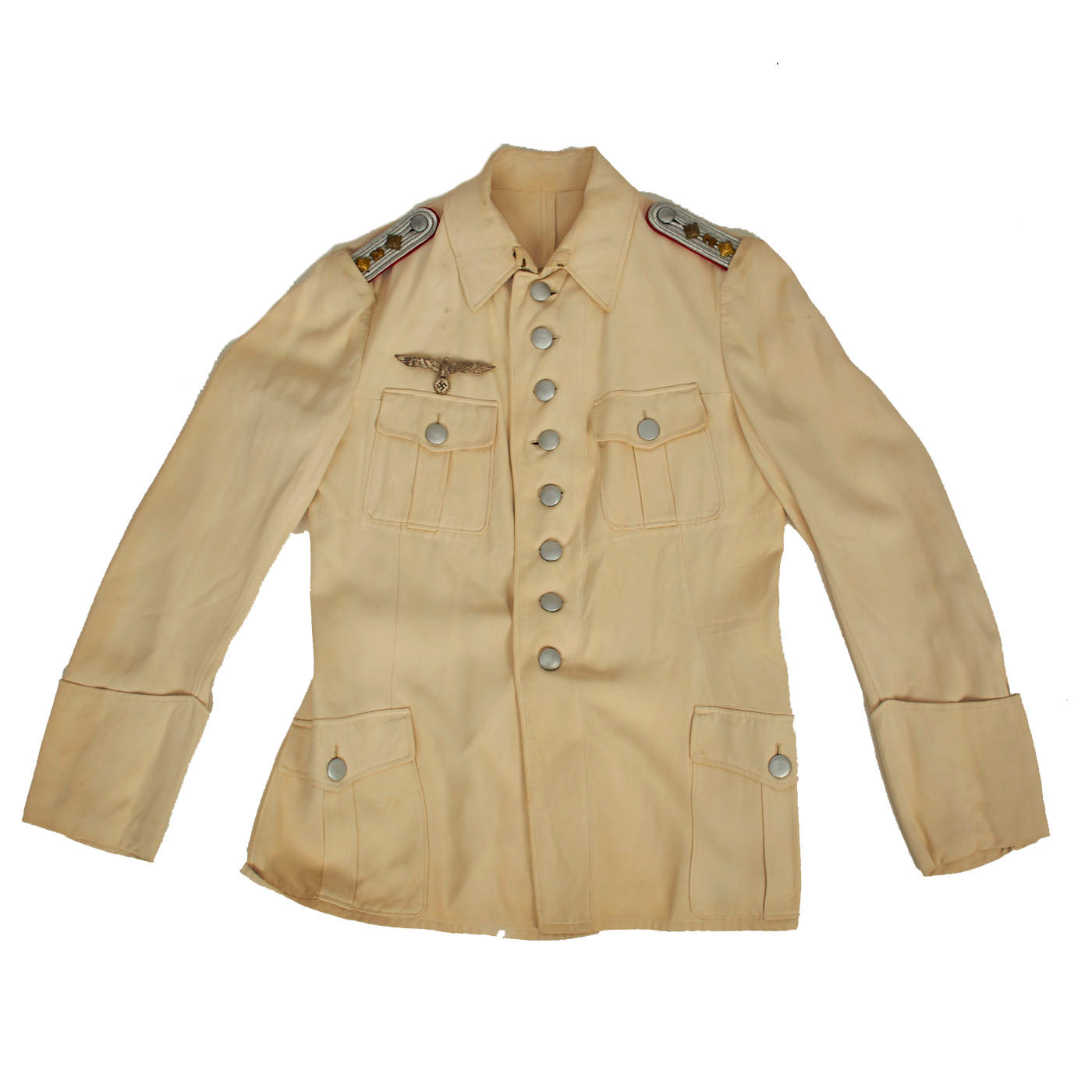 Original Item: Only One Available. This wonderful condition summer tunic is fabricated from a white cotton material, which is both lightweight and soft. The shoulders are adorned with Heer Artillery Hauptmann Schulterklappen (shoulder straps), incorporating two rows of fine silver flatware "Russia Braid" double piping, the end creating a button hole for a pebbled aluminum button. The sides and underside of the "insert" style Hochrot (Deep Red) wool, the Waffenfarbe (Corps Color) during WWII for Artillery, as well as General Level Officers. These are company grade shoulder straps, so these are definitely for artillery, not a General. Each bears 2 gold rank "pips", which indicate the officer rank of Hauptmann (Captain). There is also a number 2 on each, a unit marking that could be the regiment or company.