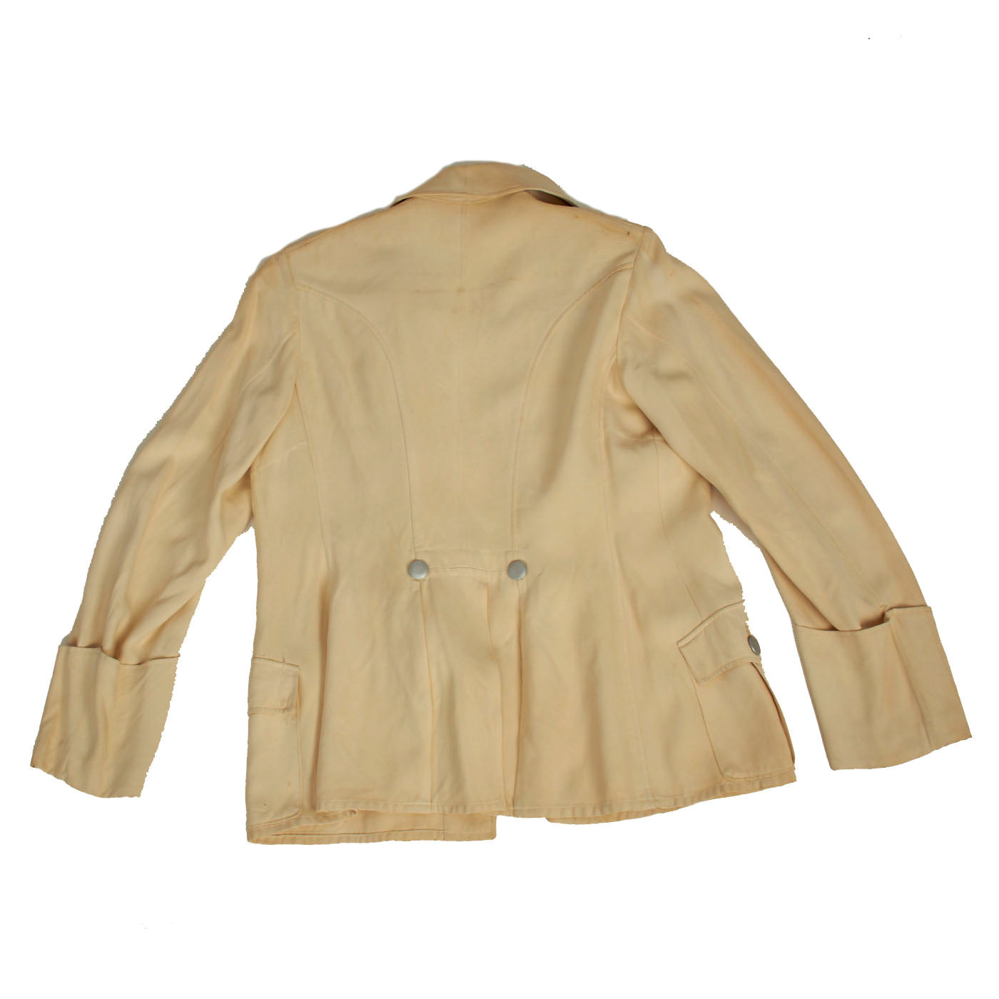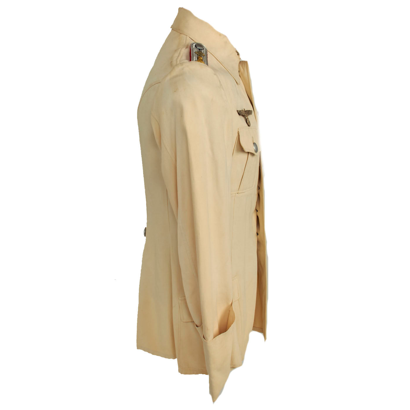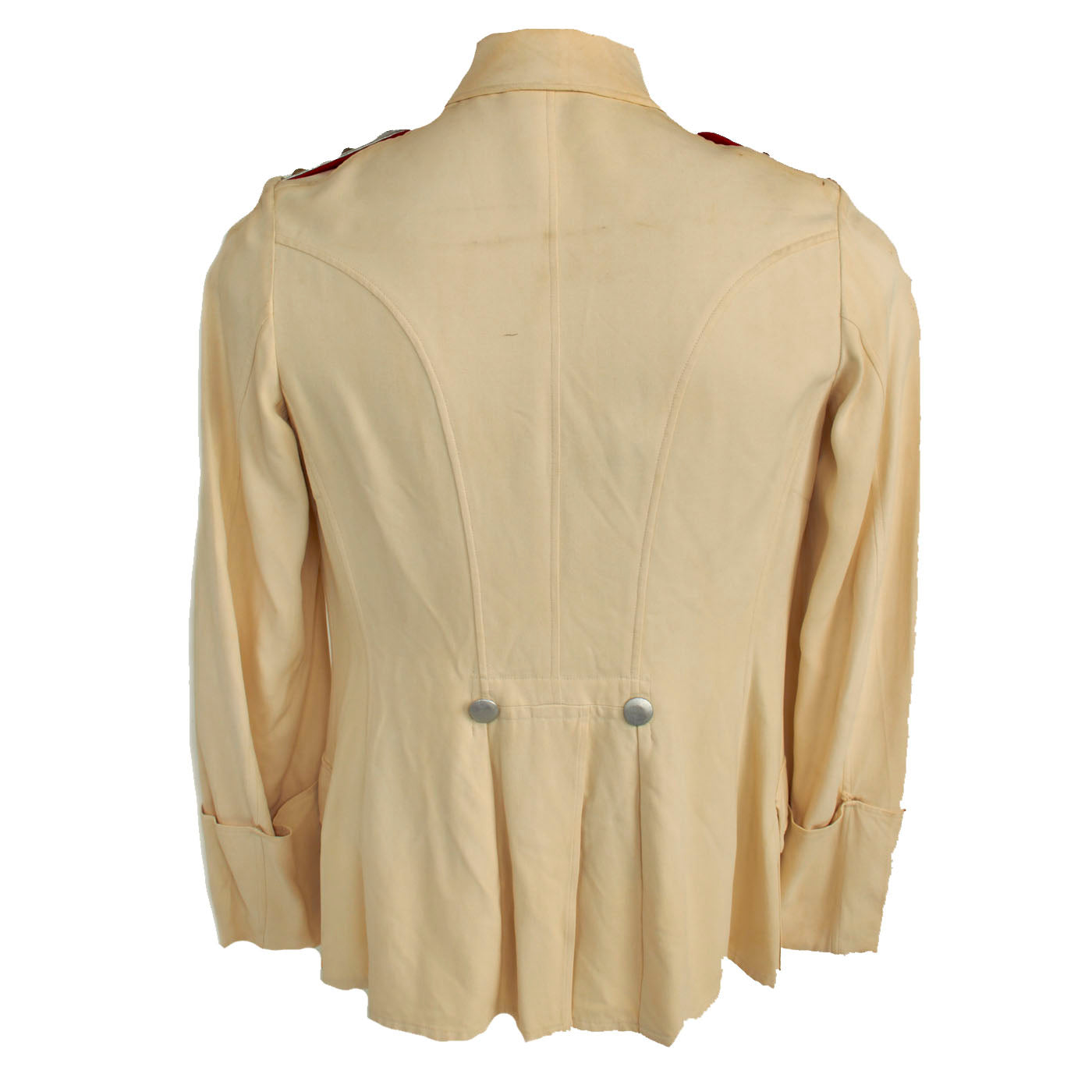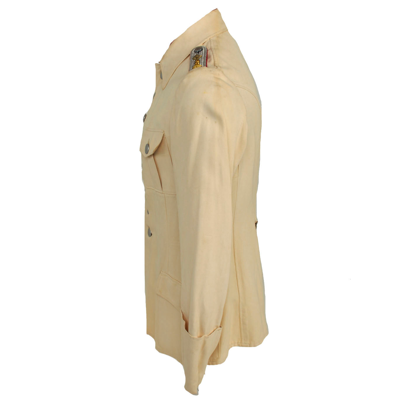 Original Item: Only One Available. This wonderful condition summer tunic is fabricated from a white cotton material, which is both lightweight and soft. The shoulders are adorned with Heer Artillery Hauptmann Schulterklappen (shoulder straps), incorporating two rows of fine silver flatware "Russia Braid" double piping, the end creating a button hole for a pebbled aluminum button. The sides and underside of the "insert" style Hochrot (Deep Red) wool, the Waffenfarbe (Corps Color) during WWII for Artillery, as well as General Level Officers. These are company grade shoulder straps, so these are definitely for artillery, not a General. Each bears 2 gold rank "pips", which indicate the officer rank of Hauptmann (Captain). There is also a number 2 on each, a unit marking that could be the regiment or company.