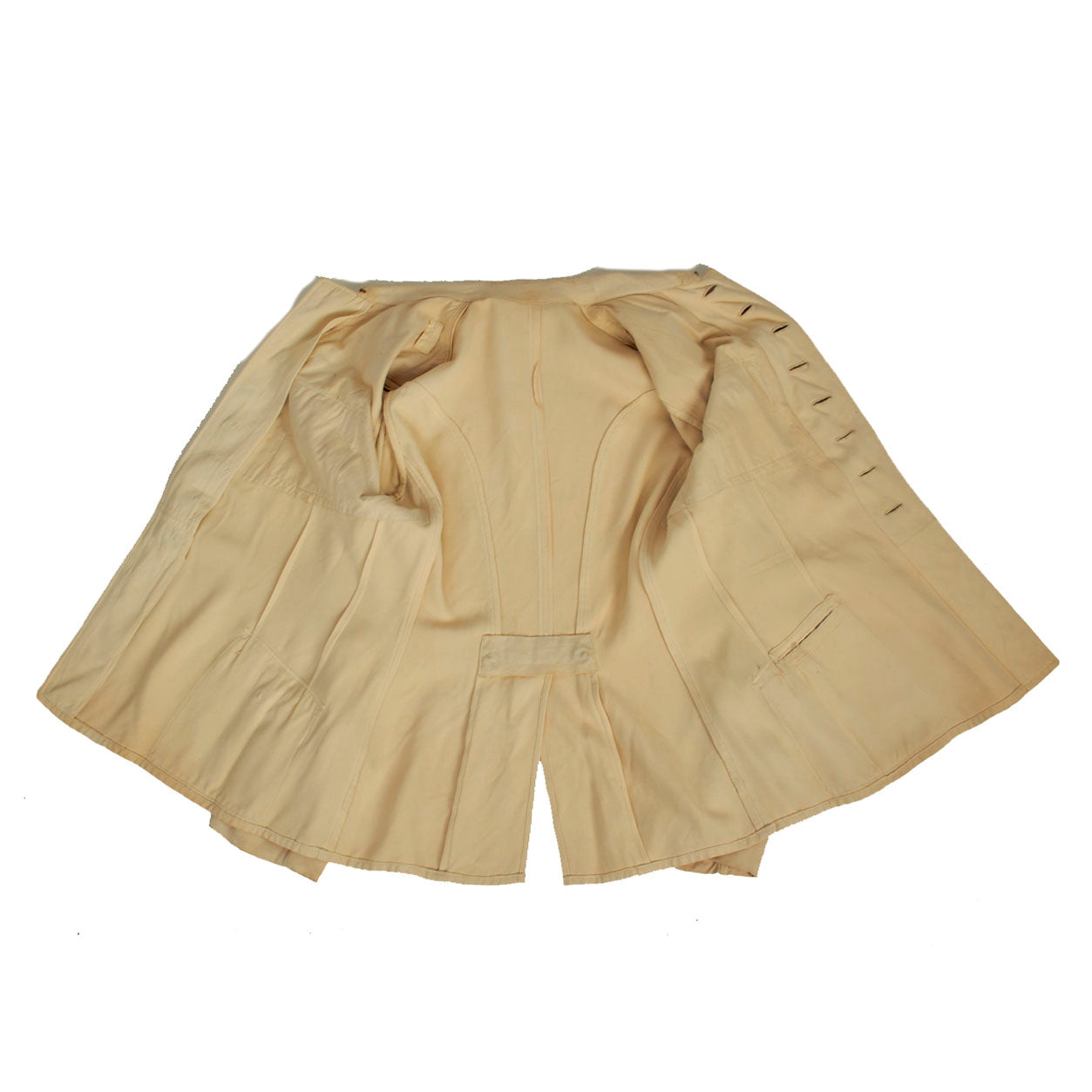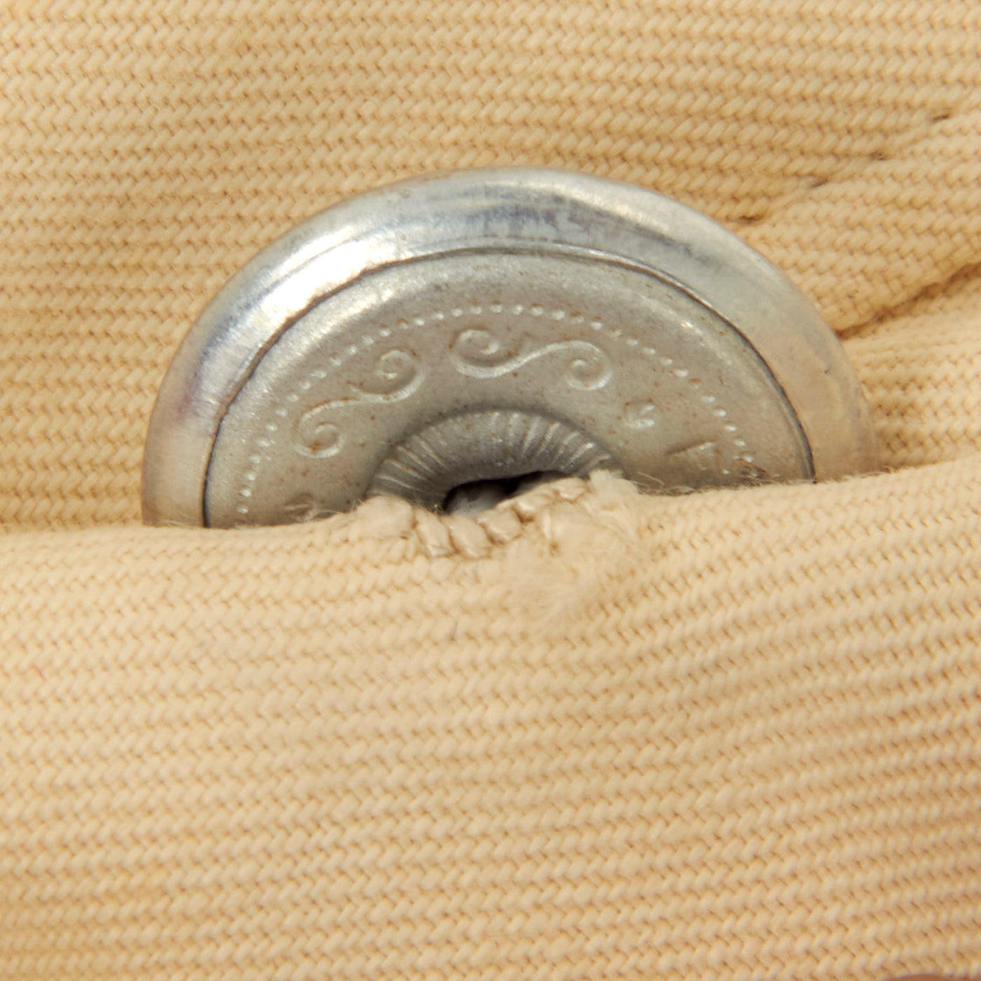 There are four pockets on the front, one on each breast and larger ones at the waist on both sides, each designed with a decorative pleat and pebbled buttons, each of which is also maker marked and are held in place by rings on the underside and embedded in the pleat.