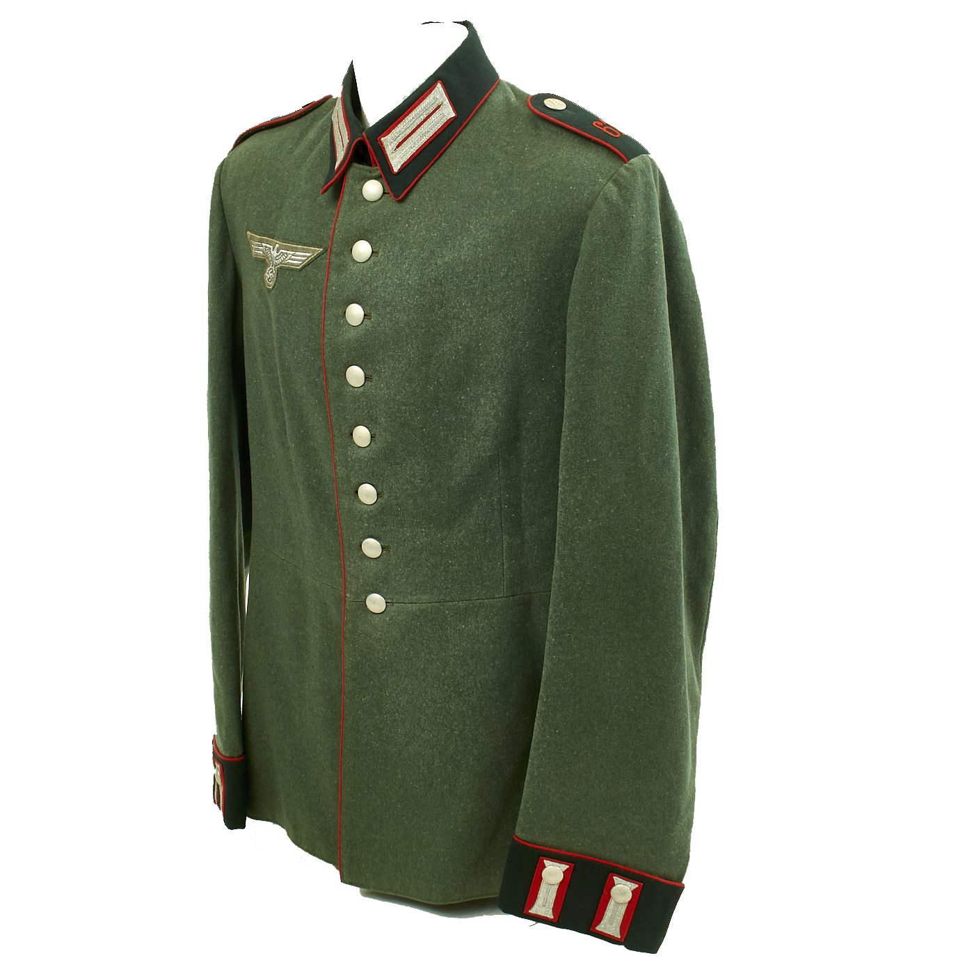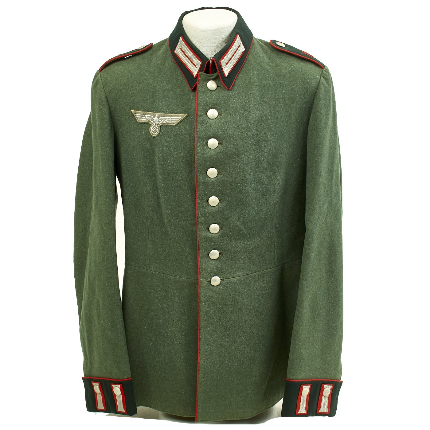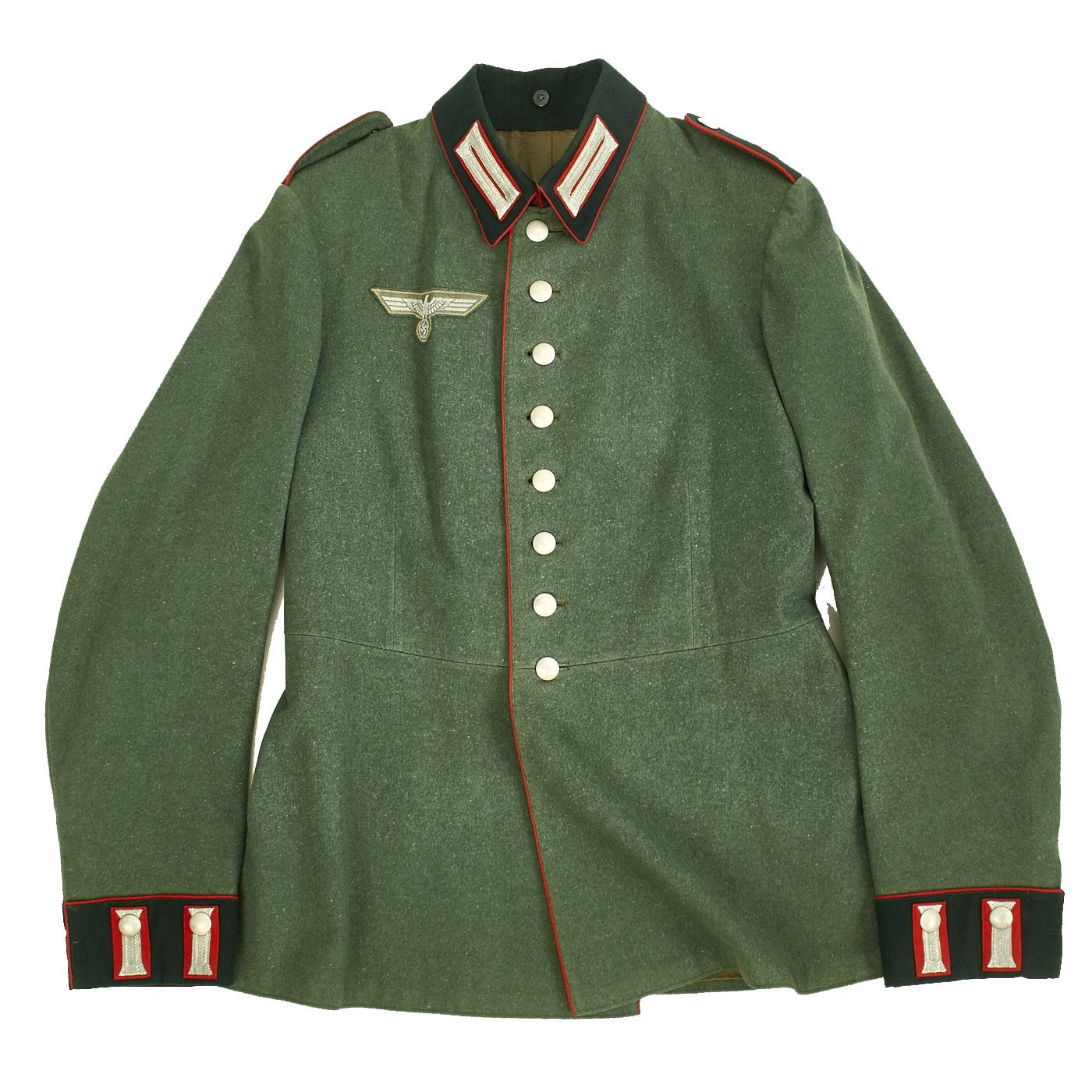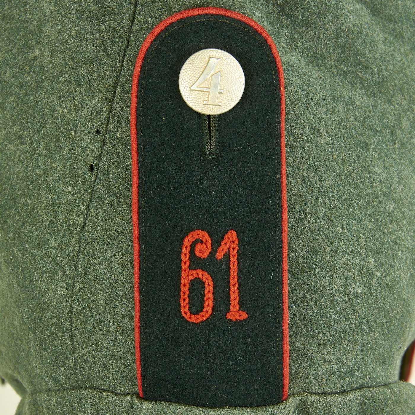 Original Item: Only One Available. This is a beautiful Heer Enlisted Artillery Waffenrock. The base material of the uniform is made of a fine feldgrau colored wool. The wool shows no signs of any physical damage by misuse or mothing. The collar is wrapped in a dark-green wool, and is decorated with insignia. The base material of the two litzen on each side of the collar opening are red, which designates Artillery. The two litzen themselves are woven from a fine silver flatware thread. The collar, and its insignia, are without any noticeable damage or mothing. The “sew-in” style shoulder boards of this Waffenrock have a dark green base wool, which is piped in red. "61” is neatly chain-stitched on the shoulder boards. This is the regiment number the soldier was attached to. The buttons holding the top portion of the boards to the Artillery Waffenrock are silvered and feature the number “4”, indicating this soldier belonged to 4 Company of Artillery Regiment 61. The front breast eagle is an earlier moss-green colored First Pattern executed in silver wire. The eagle is without damage and is originally sewn to the tunics breast by very neat hand stitching. Eight silvered buttons adorn the front of the tunic and all appear to be originally attached.
