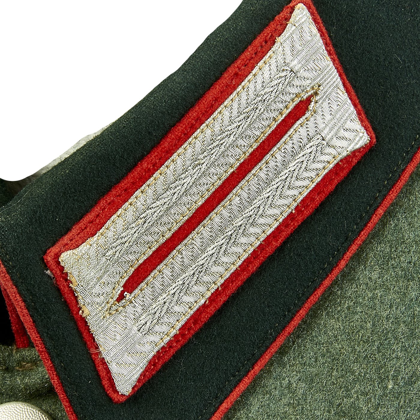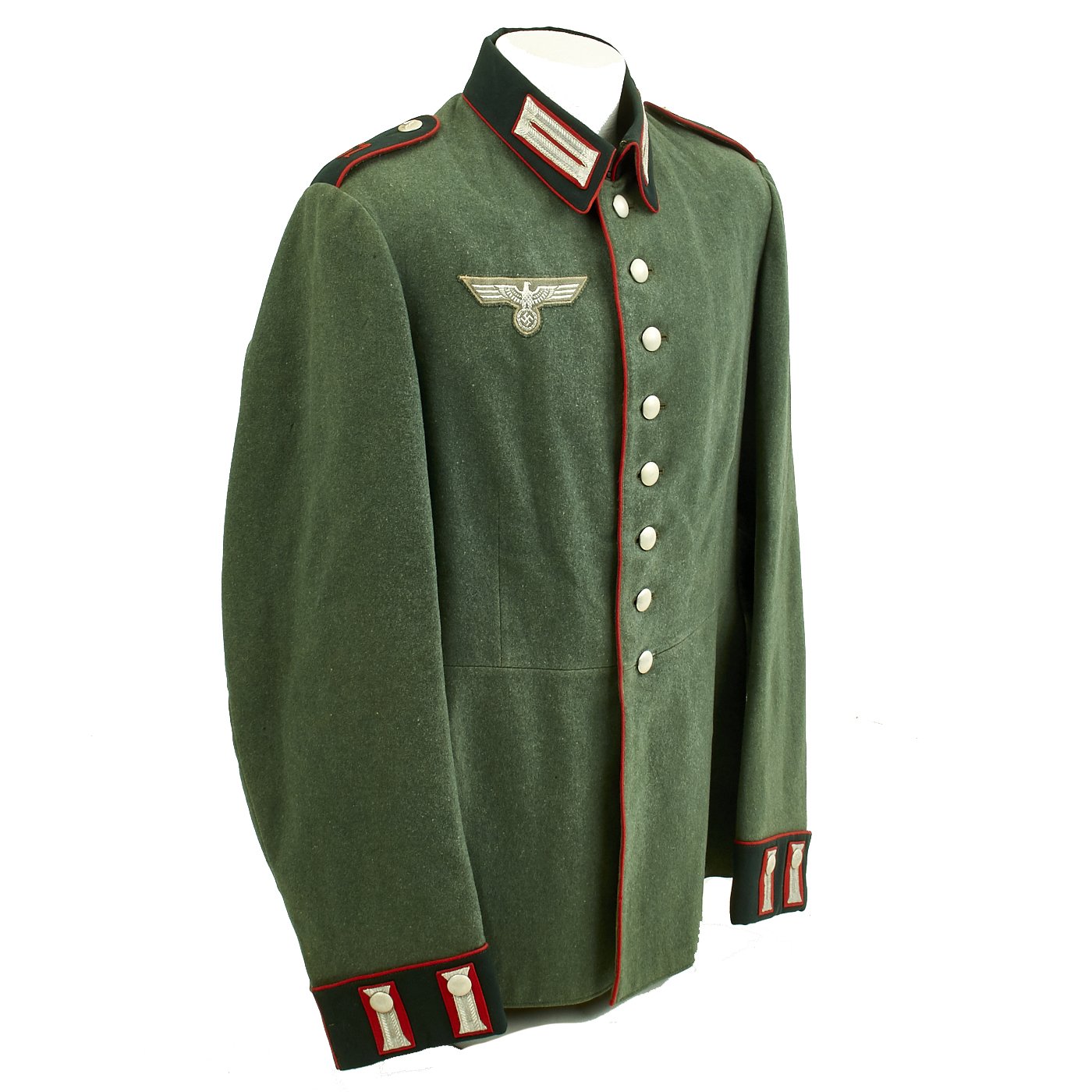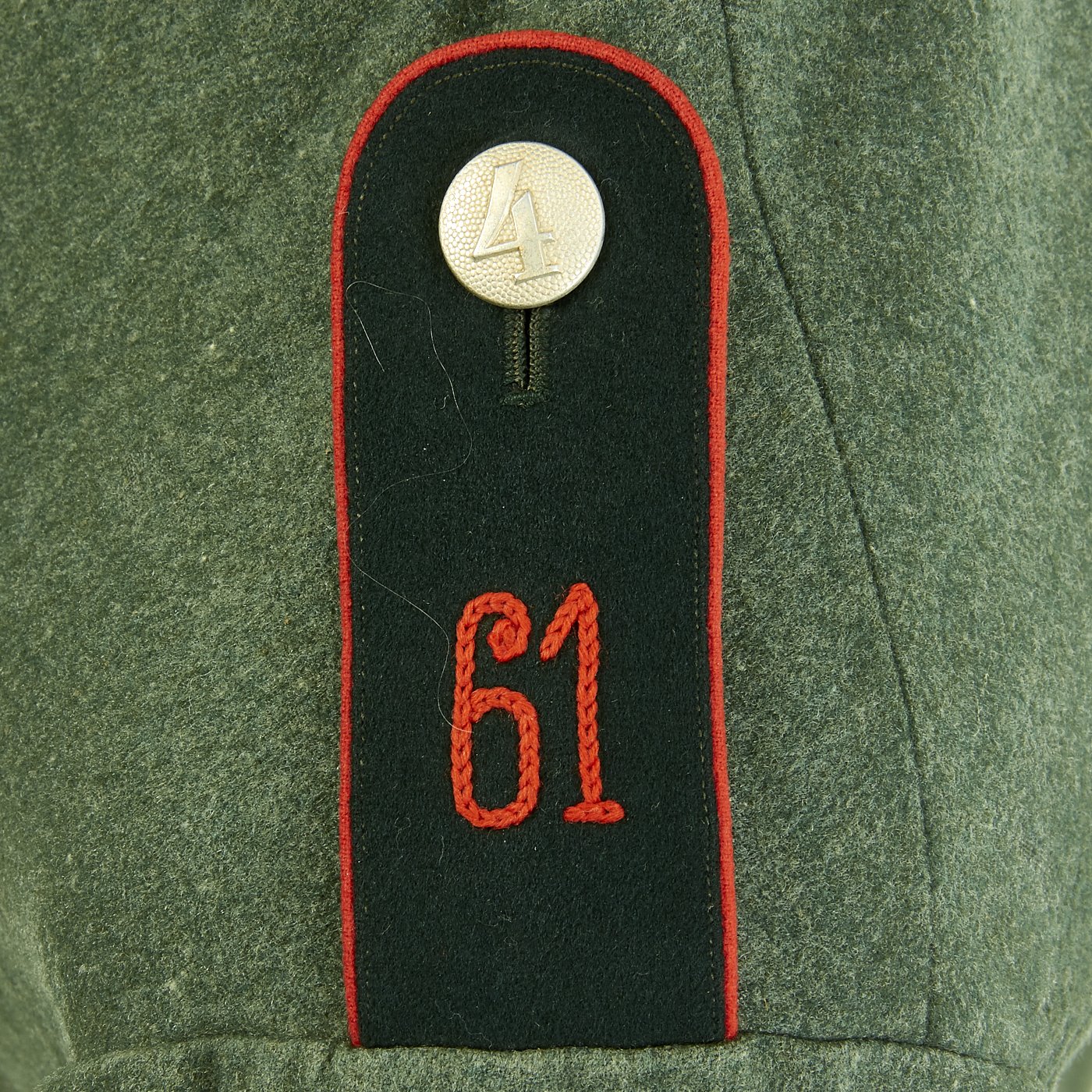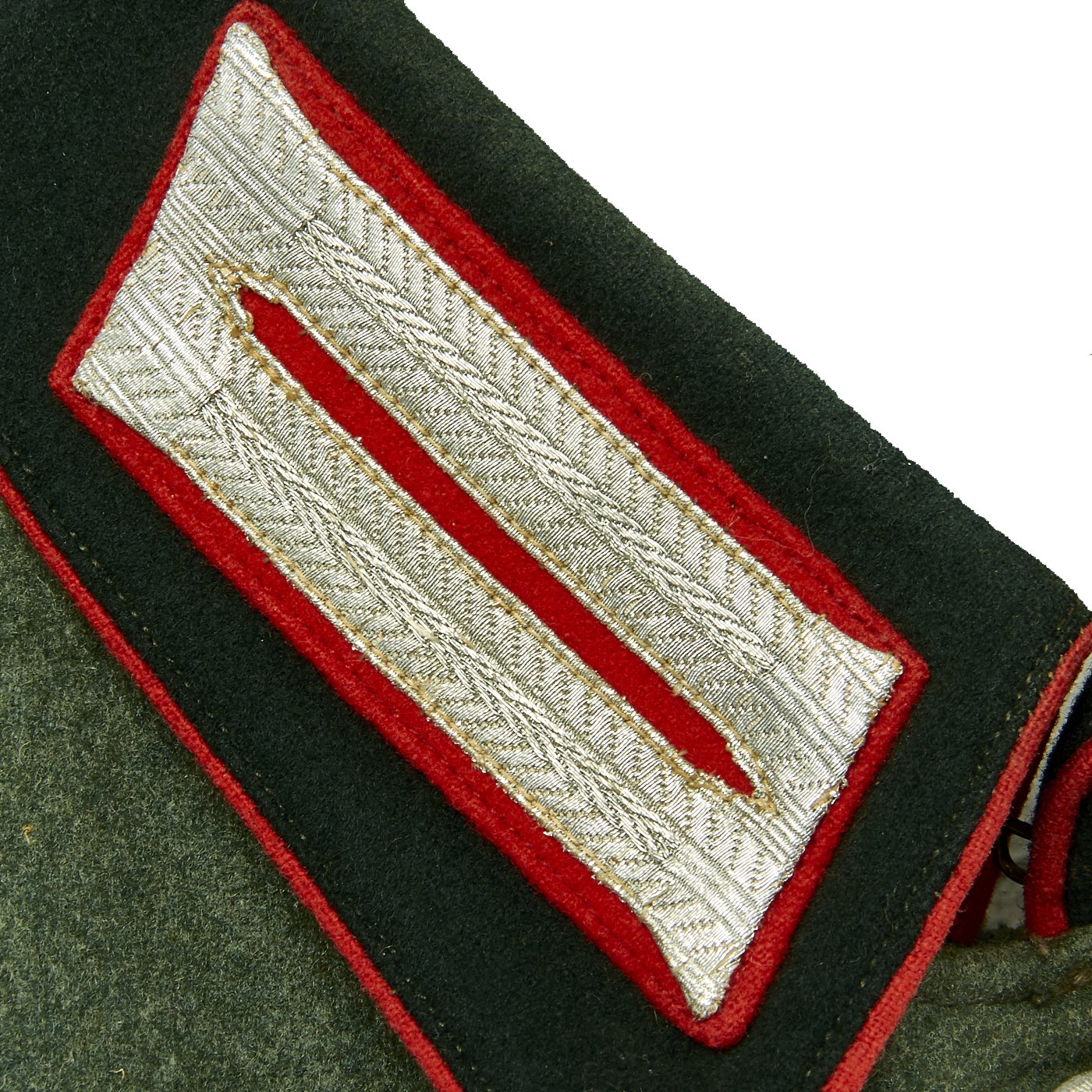Original Item: Only One Available. This is a beautiful Heer Enlisted Artillery Waffenrock. The base material of the uniform is made of a fine feldgrau colored wool. The wool shows no signs of any physical damage by misuse or mothing. The collar is wrapped in a dark-green wool, and is decorated with insignia. The base material of the two litzen on each side of the collar opening are red, which designates Artillery. The two litzen themselves are woven from a fine silver flatware thread. The collar, and its insignia, are without any noticeable damage or mothing. The “sew-in” style shoulder boards of this Waffenrock have a dark green base wool, which is piped in red. "61” is neatly chain-stitched on the shoulder boards. This is the regiment number the soldier was attached to. The buttons holding the top portion of the boards to the Artillery Waffenrock are silvered and feature the number “4”, indicating this soldier belonged to 4 Company of Artillery Regiment 61. The front breast eagle is an earlier moss-green colored First Pattern executed in silver wire. The eagle is without damage and is originally sewn to the tunics breast by very neat hand stitching. Eight silvered buttons adorn the front of the tunic and all appear to be originally attached.