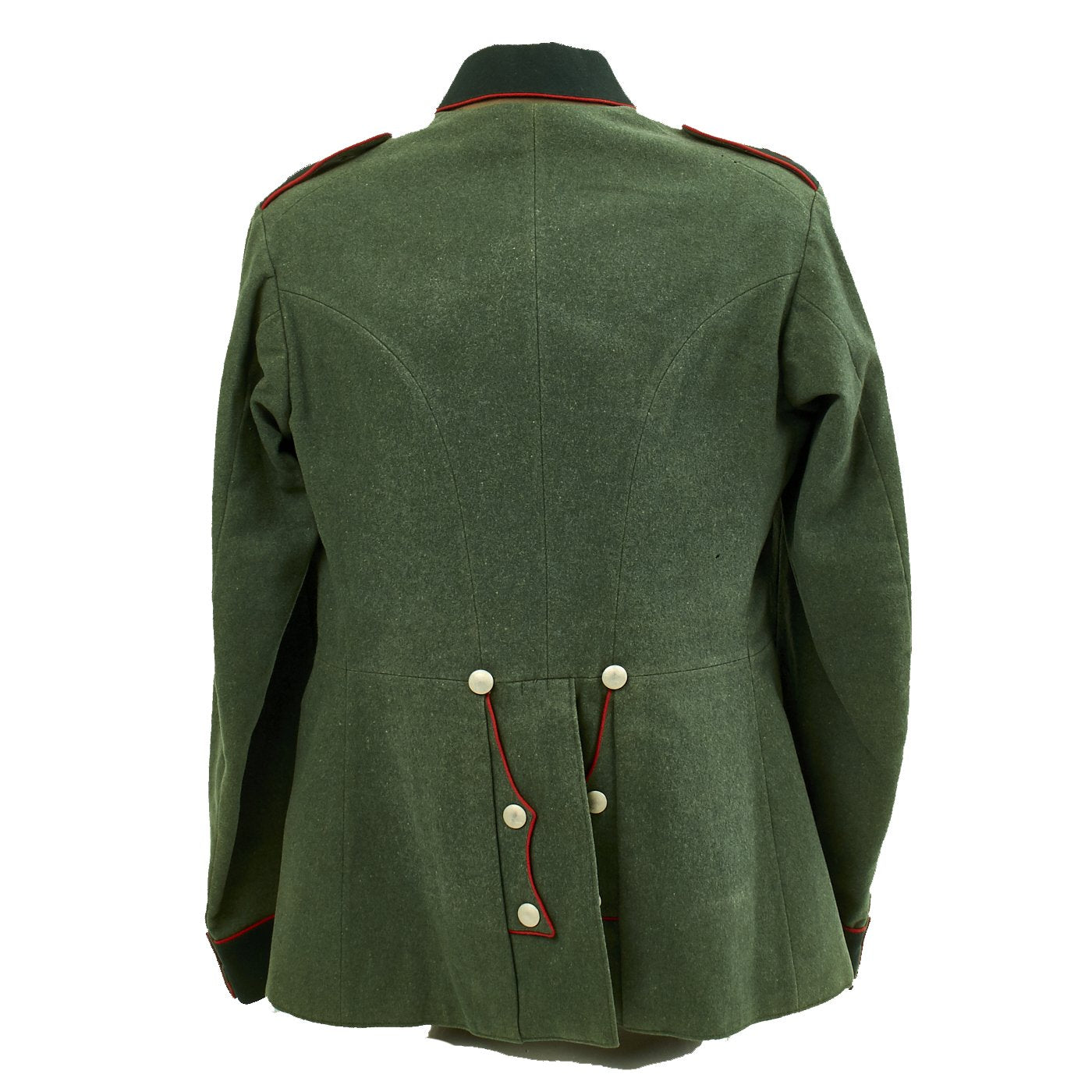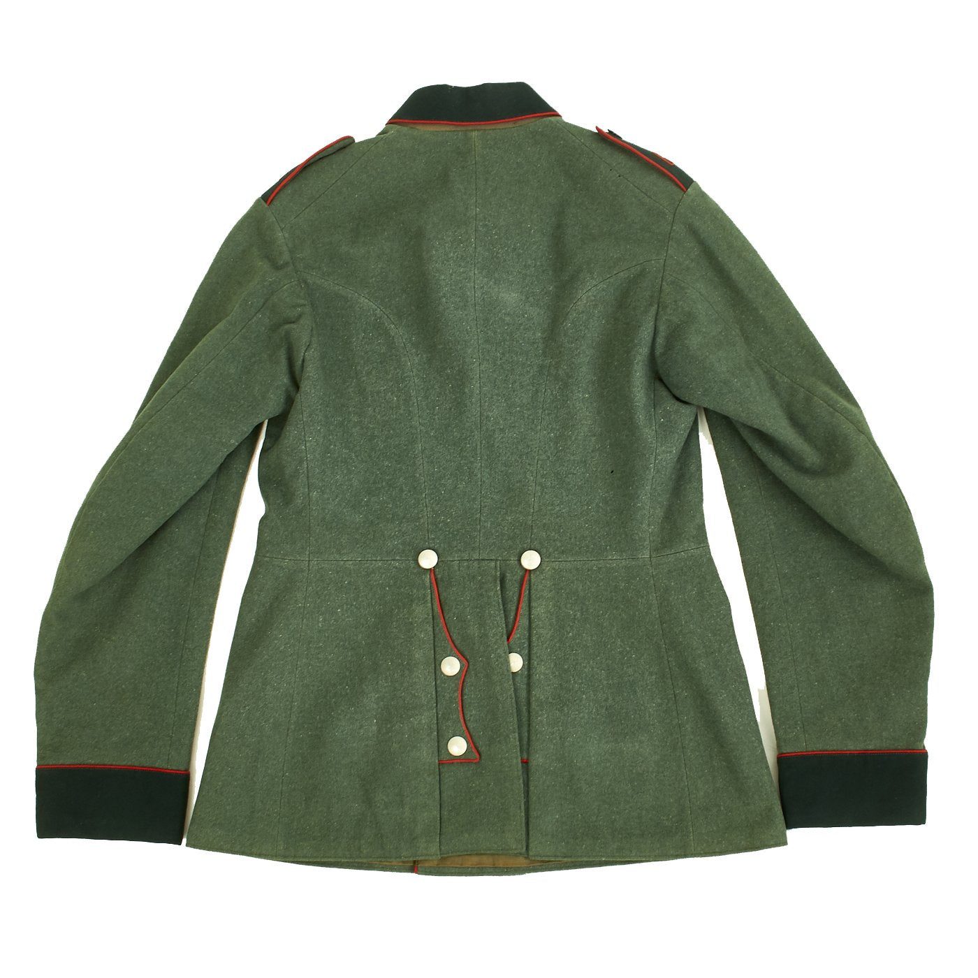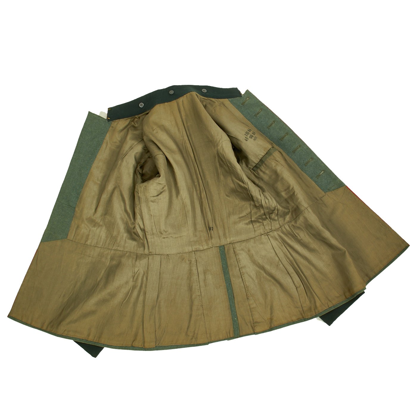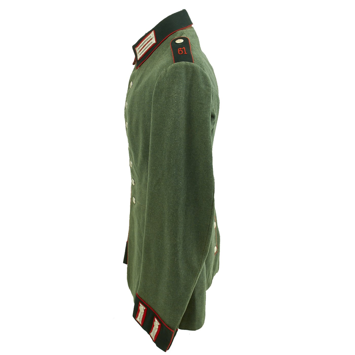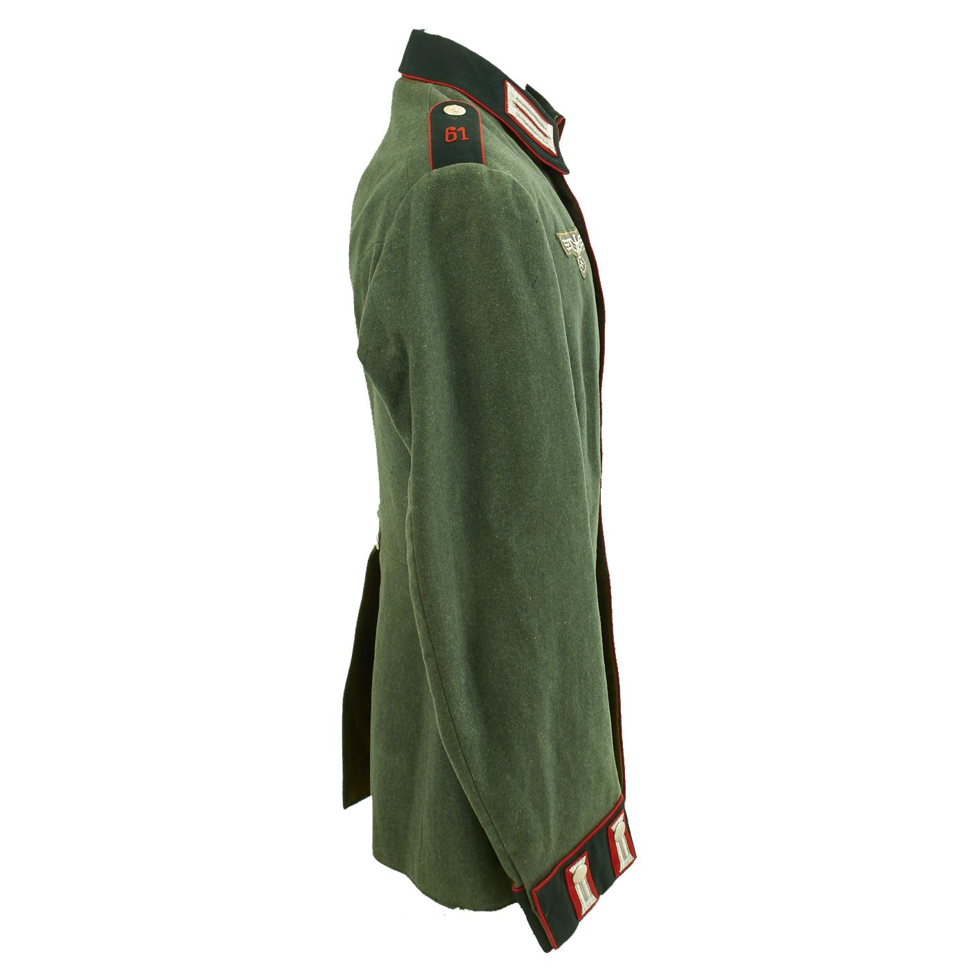 Original Item: Only One Available. This is a beautiful Heer Enlisted Artillery Waffenrock. The base material of the uniform is made of a fine feldgrau colored wool. The wool shows no signs of any physical damage by misuse or mothing. The collar is wrapped in a dark-green wool, and is decorated with insignia. The base material of the two litzen on each side of the collar opening are red, which designates Artillery. The two litzen themselves are woven from a fine silver flatware thread. The collar, and its insignia, are without any noticeable damage or mothing. The “sew-in” style shoulder boards of this Waffenrock have a dark green base wool, which is piped in red. "61” is neatly chain-stitched on the shoulder boards. This is the regiment number the soldier was attached to. The buttons holding the top portion of the boards to the Artillery Waffenrock are silvered and feature the number “4”, indicating this soldier belonged to 4 Company of Artillery Regiment 61. The front breast eagle is an earlier moss-green colored First Pattern executed in silver wire. The eagle is without damage and is originally sewn to the tunics breast by very neat hand stitching. Eight silvered buttons adorn the front of the tunic and all appear to be originally attached.