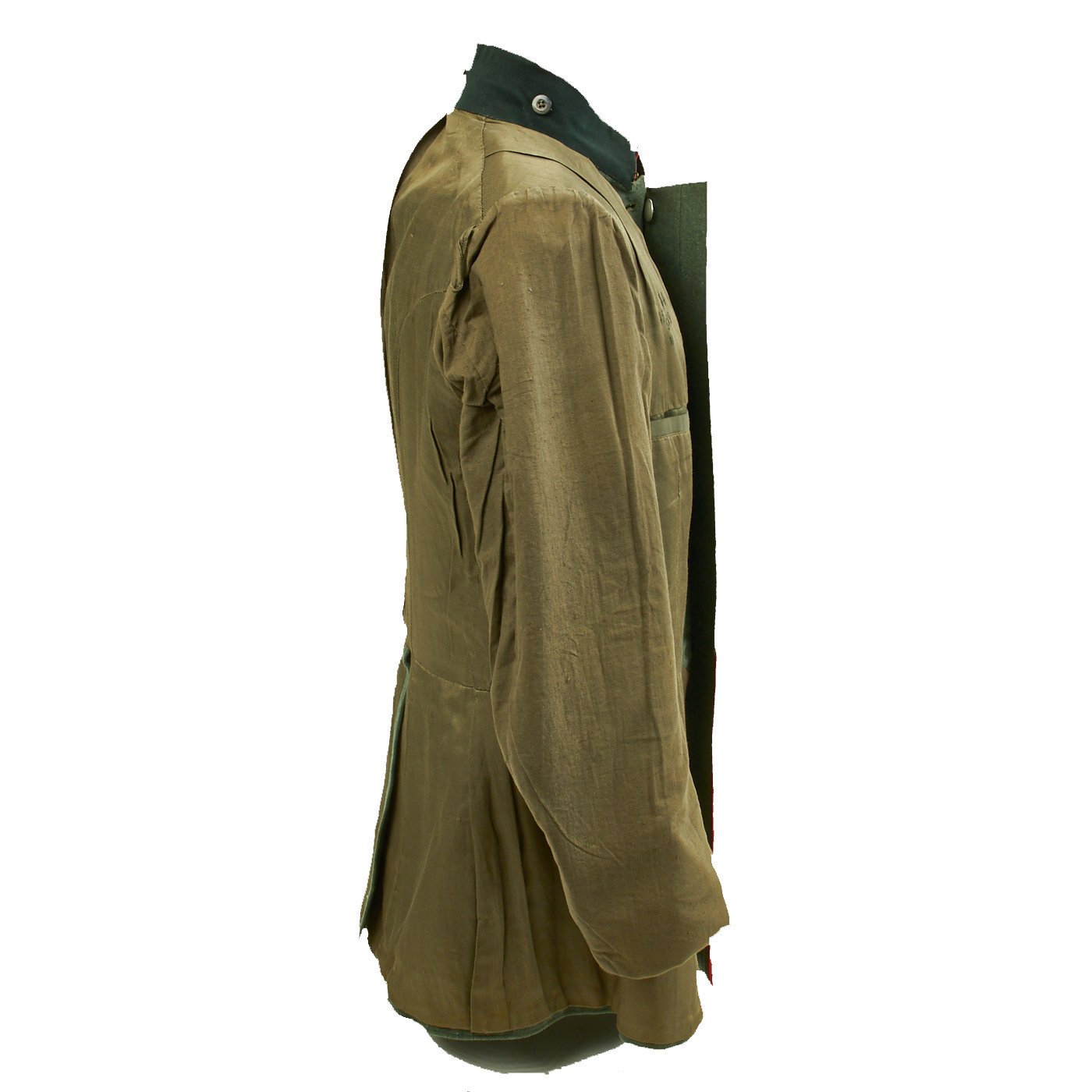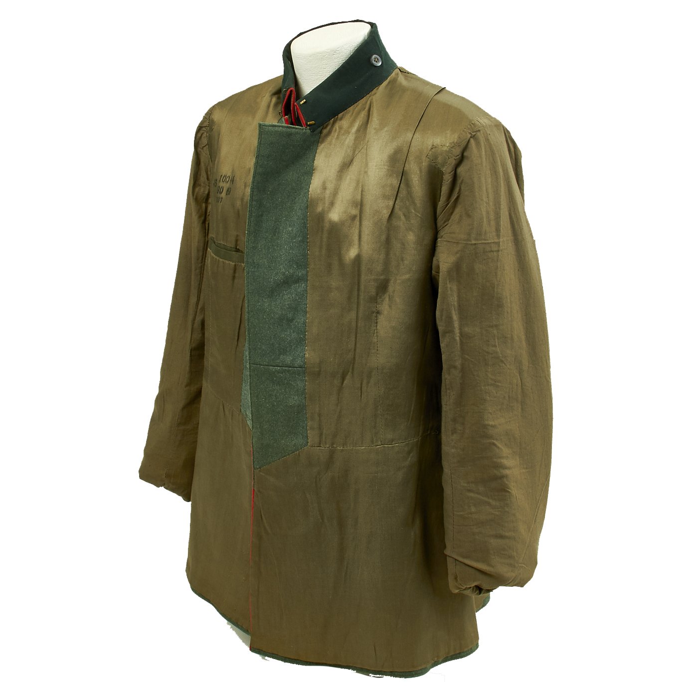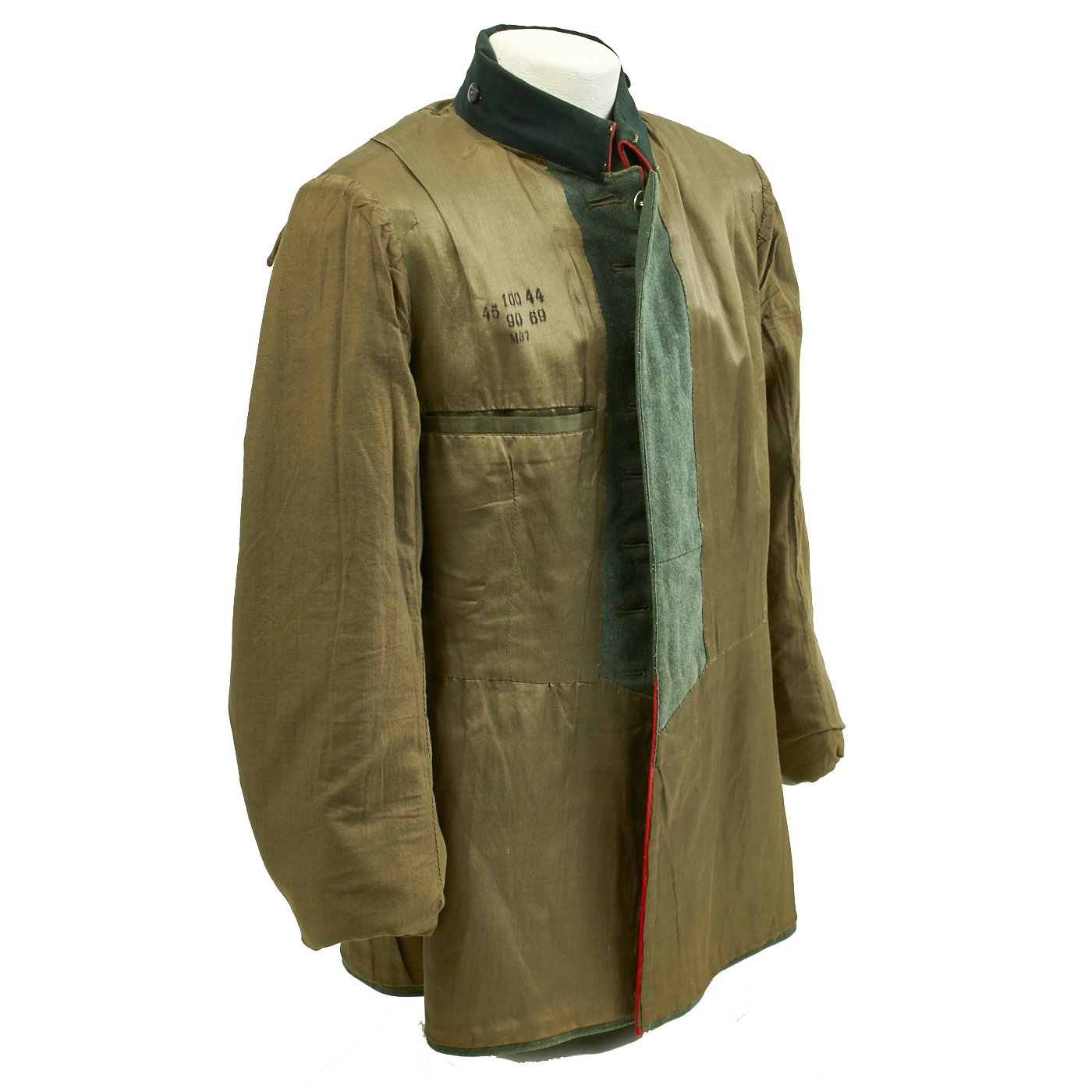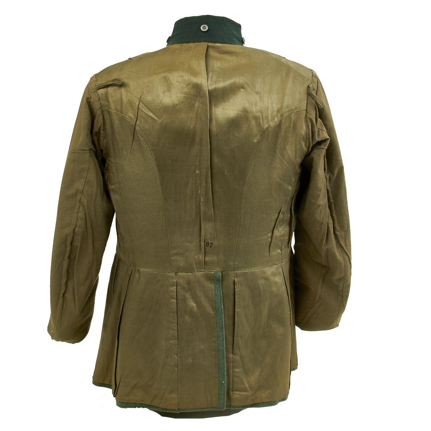 Original Item: Only One Available. This is a beautiful Heer Enlisted Artillery Waffenrock. The base material of the uniform is made of a fine feldgrau colored wool. The wool shows no signs of any physical damage by misuse or mothing. The collar is wrapped in a dark-green wool, and is decorated with insignia. The base material of the two litzen on each side of the collar opening are red, which designates Artillery. The two litzen themselves are woven from a fine silver flatware thread. The collar, and its insignia, are without any noticeable damage or mothing. The “sew-in” style shoulder boards of this Waffenrock have a dark green base wool, which is piped in red. "61” is neatly chain-stitched on the shoulder boards. This is the regiment number the soldier was attached to. The buttons holding the top portion of the boards to the Artillery Waffenrock are silvered and feature the number “4”, indicating this soldier belonged to 4 Company of Artillery Regiment 61. The front breast eagle is an earlier moss-green colored First Pattern executed in silver wire. The eagle is without damage and is originally sewn to the tunics breast by very neat hand stitching. Eight silvered buttons adorn the front of the tunic and all appear to be originally attached.