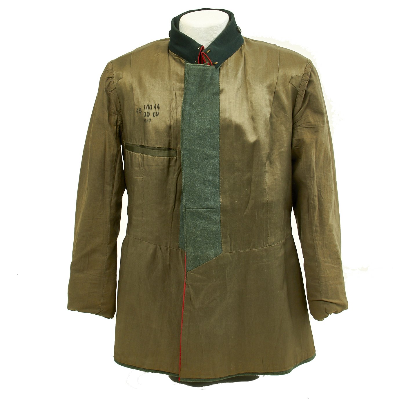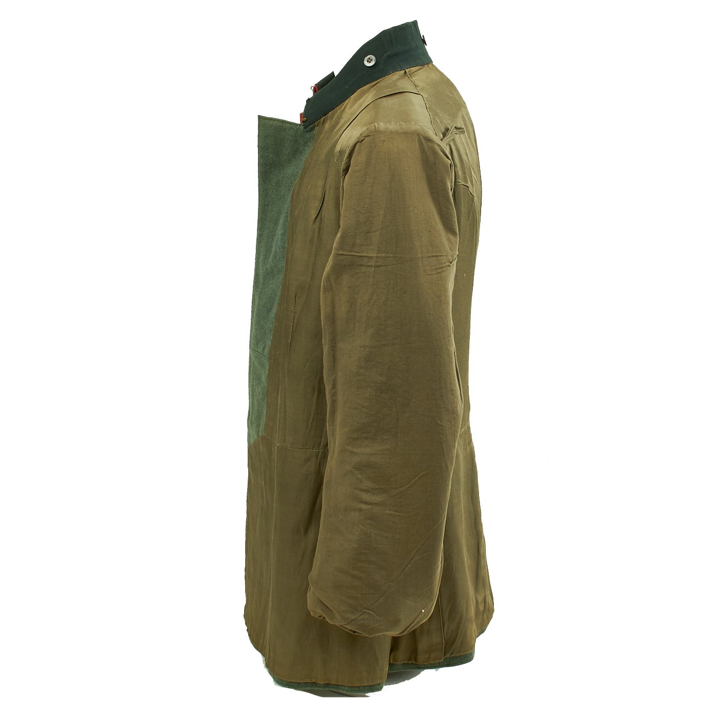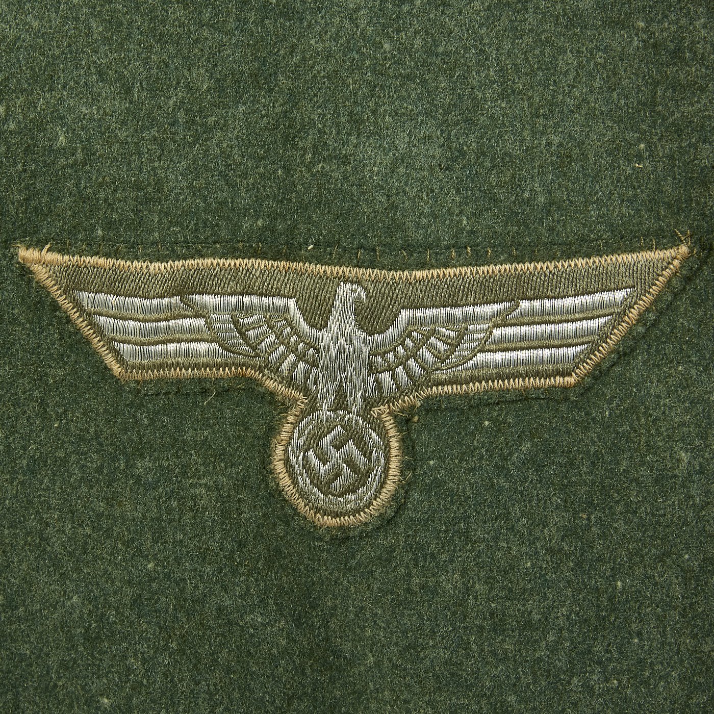 The Deutsche Heer, the Army of the German Military during the Third Reich, was established in 1935. Over the next 10 years, German Army troops wore a huge variety of uniforms. Enlisted men generally wore uniforms issued from military depots. Most enlisted soldiers wore wool trousers and a tunic with four external pockets, known as a Feldbluse (field blouse). Before the war, soldiers also were issued a walking-out tunic, with flashy insignia, called the Waffenrock. Officers wore the same general uniform styles, but as officers had to supply their own uniforms, they usually wore tailor made versions. There were also myriad varieties of specialized uniforms worn by certain units or in specific situations, from the stylish black wool “wraps” worn by crews of armored fighting vehicles, to the drab HBT work uniforms. There were tropical and summer uniforms, and camouflage smocks for combat troops. For troops operating in winter climates, there were long wool overcoats, fur clothing articles, and padded jacket and trousers sets. In 1944, a new uniform was introduced, featuring a short jacket with only two external pockets. Most but not all German Army uniform jackets bore the Heer emblem of an eagle holding a swas.