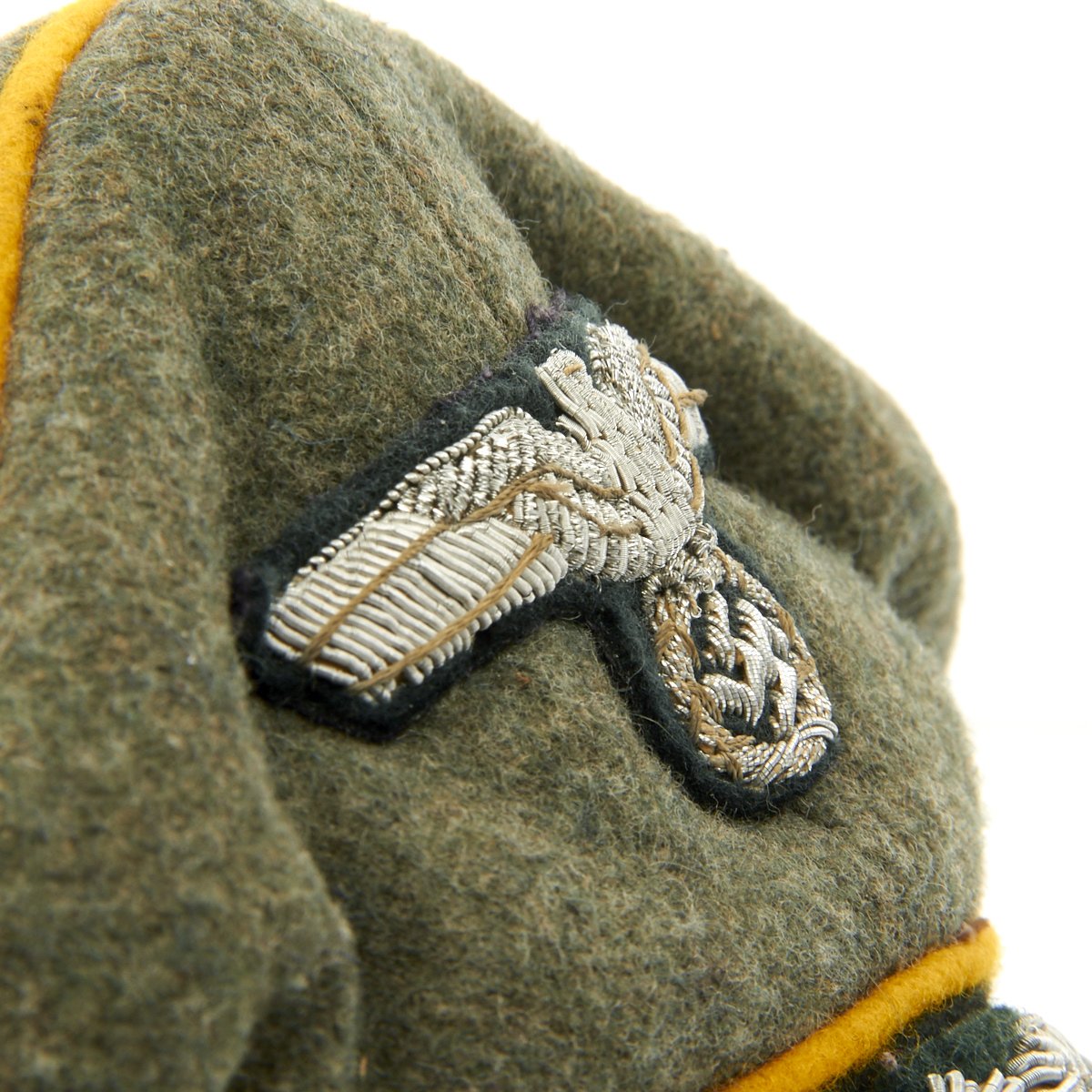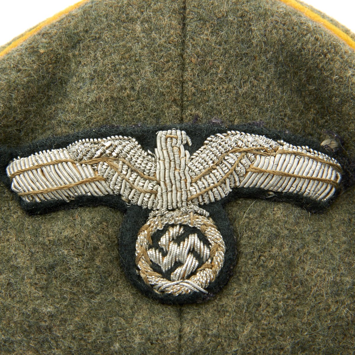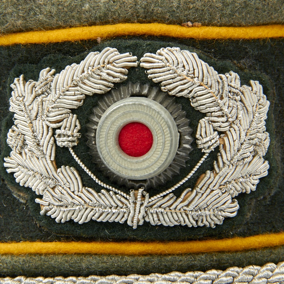 The front center of the cap has a wonder bullion embroidered eagle in bright silver/aluminum wire threads with bright silver/aluminum accent threads on a cut-out, green wool base. The eagle is neatly hand-stitched to the cap. The front center of the center-band has a hand embroidered, winged, oak-leaf wreath in silver/aluminum wire threads, encompassing a metal cockade with red felt center. The winged wreath and cockade are mounted on a cut-out green wool base which is also hand-stitched in place.