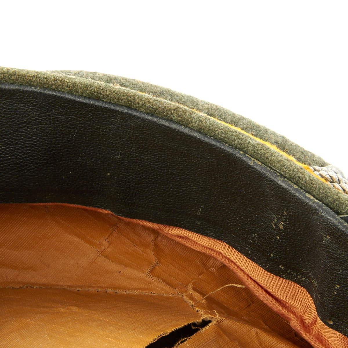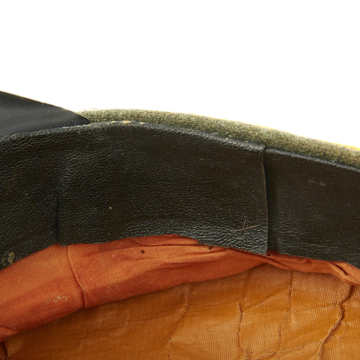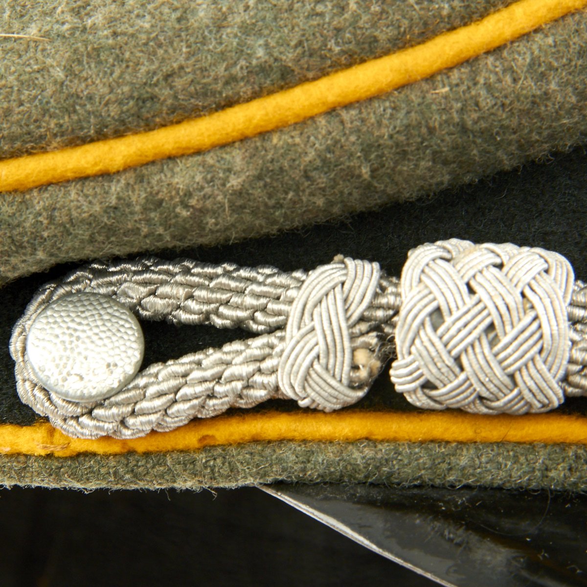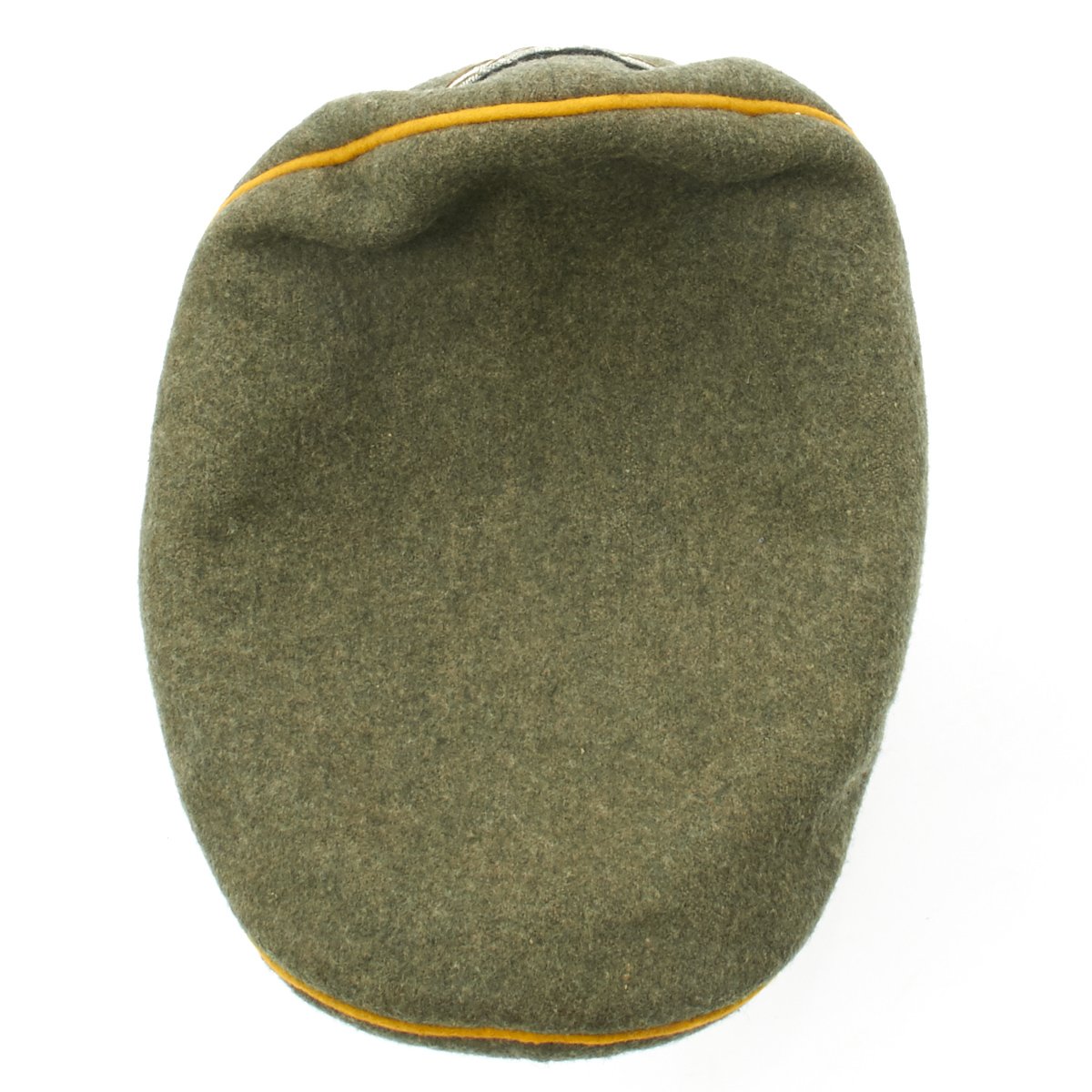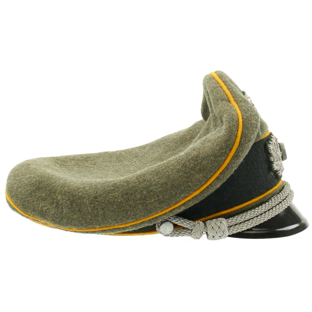 This Cavalry visor cap is the correct grey/green wool construction visor cap with a very subtle whipcord weave features a black, horizontally ribbed, interwoven, mohair centerband, and bright mustard yellow piping to the crown edge and both the top and bottom edges of the center band.