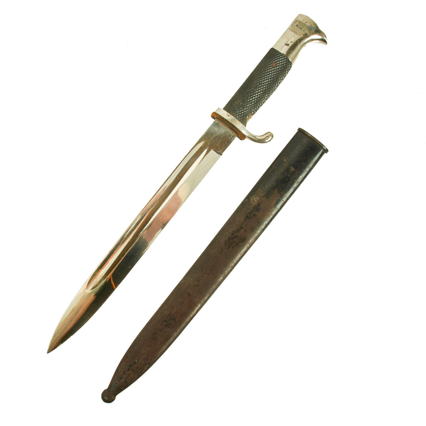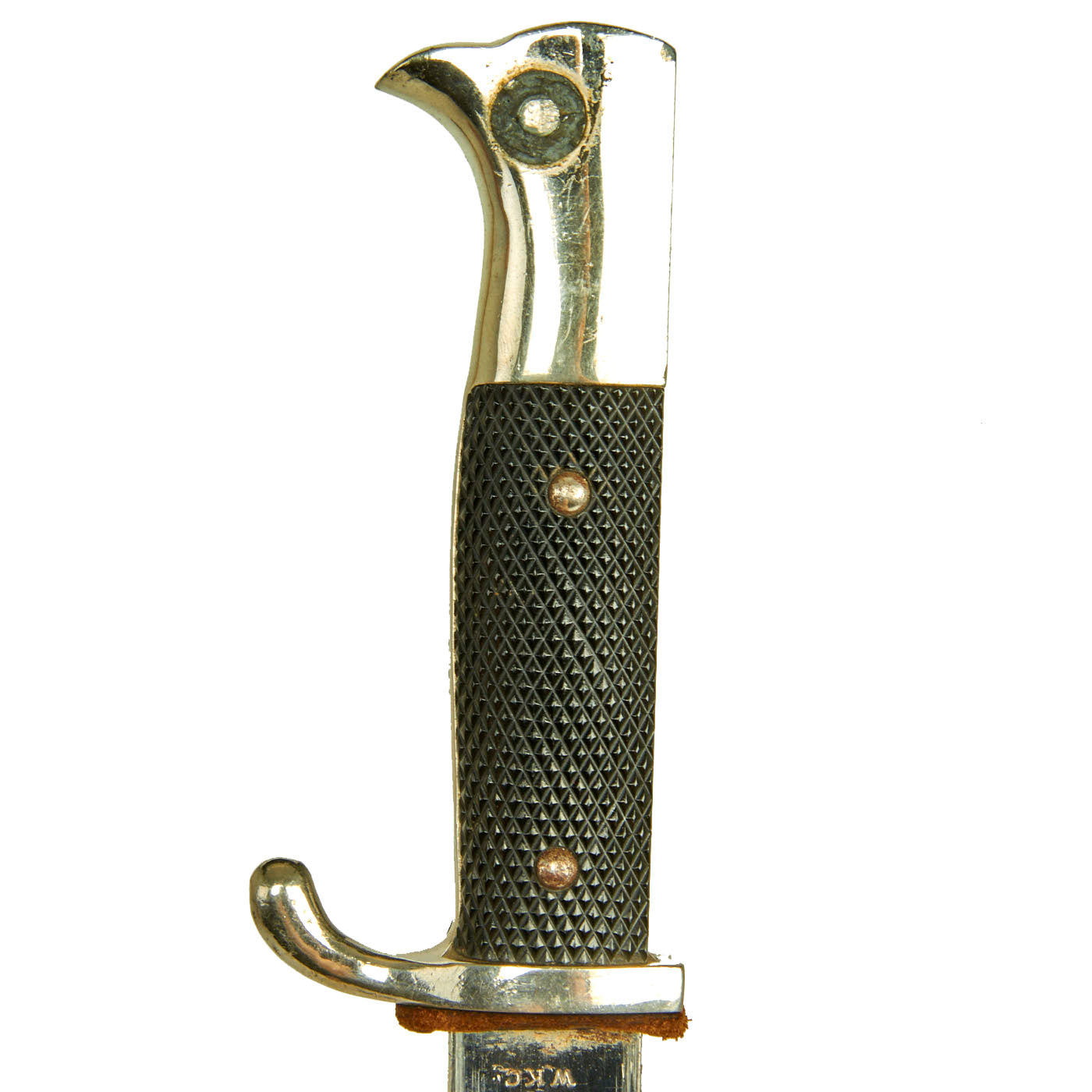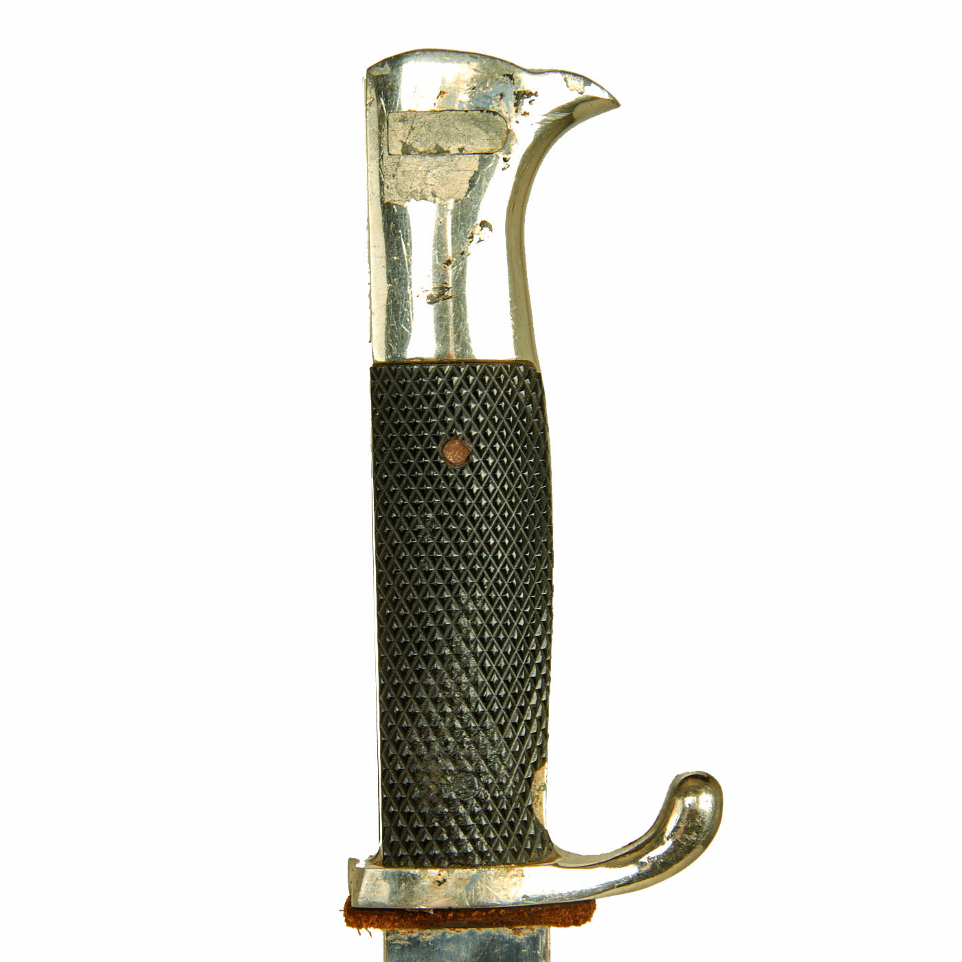 Original Item: Only One Available. The K-98 dress bayonet was a dress version of the combat style, and was worn by enlisted and NCO personnel for dress and parade occasions. The bayonets were finished with a high-quality nickel plating, with stag or bakelite grip plates and black painted scabbard. The choice of blade length was left to the purchaser, being the nickel-plated short (20cm) or long (25cm) version. There was usually a red or green colored felt insert in the rifle slot and the bayonet was suspended from a black or brown leather frog. Some had a functional bayonet latch, while it was ornamental on some. Often they would also have a sword knot, or troddle, and the color would indicate the branch or rank.