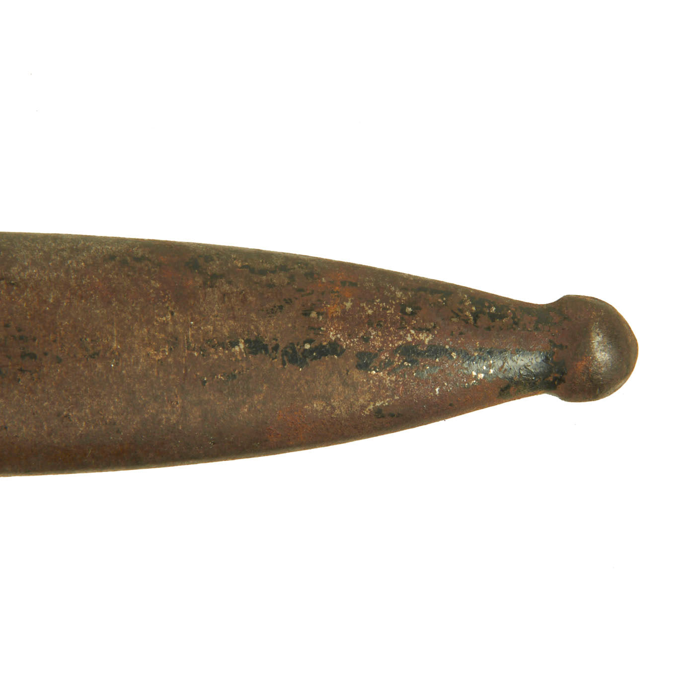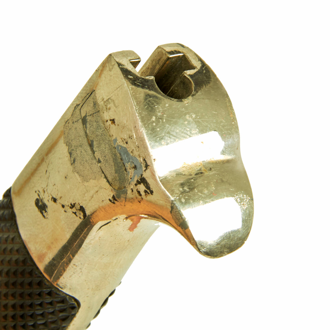 The blade on this example is nickel-plated, as were all dress bayonets. It does have wear to the plating and light oxidation, with some runner wear and light scratching. It has not been sharpened, and still retains its blunt factory edge. There are some dents on the lower edge near the tip, and it looks like it may have been used to open something in the past. The blade is a bit loose in the tang as well.