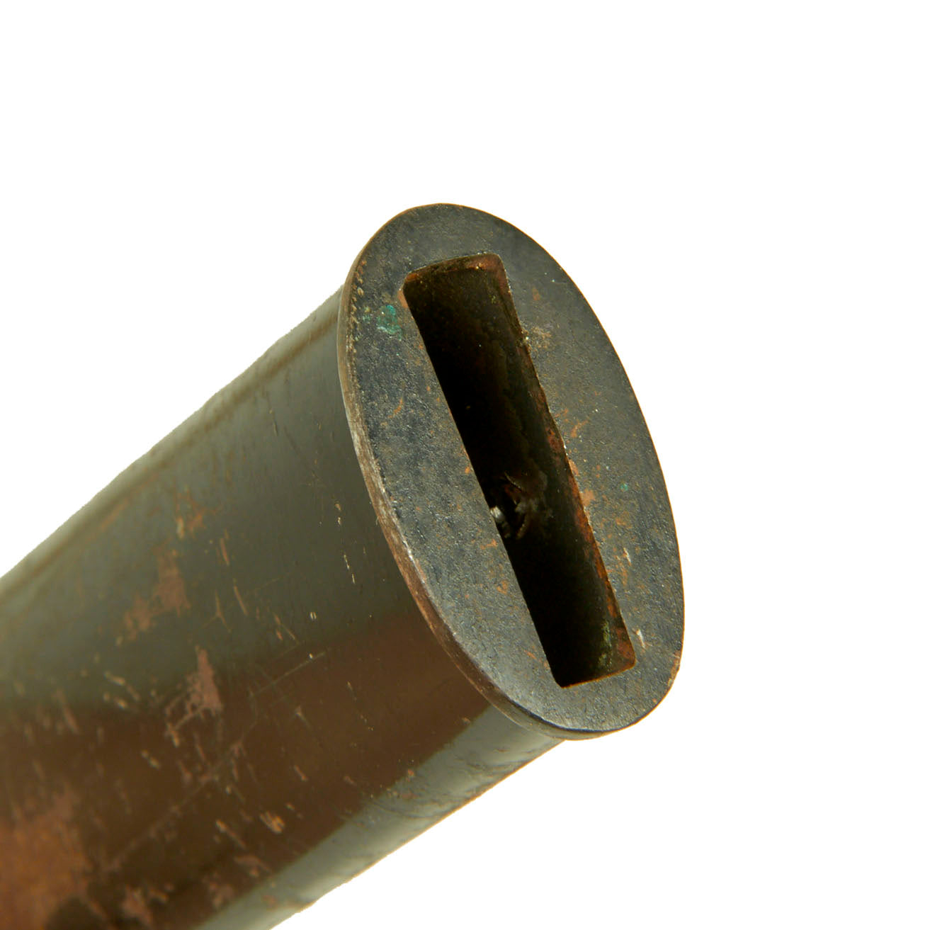 The scabbard is straight throughout, however it does show much wear to the black enamel paint. It looks to originally have had a frog, now missing, which protected the upper 4th of the scabbard both. Most of the finish below that is missing, and there are also some dents on the bottom rear, though they do not interfere with sheathing the blade. This definitely looks to have seen extensive use during the war.