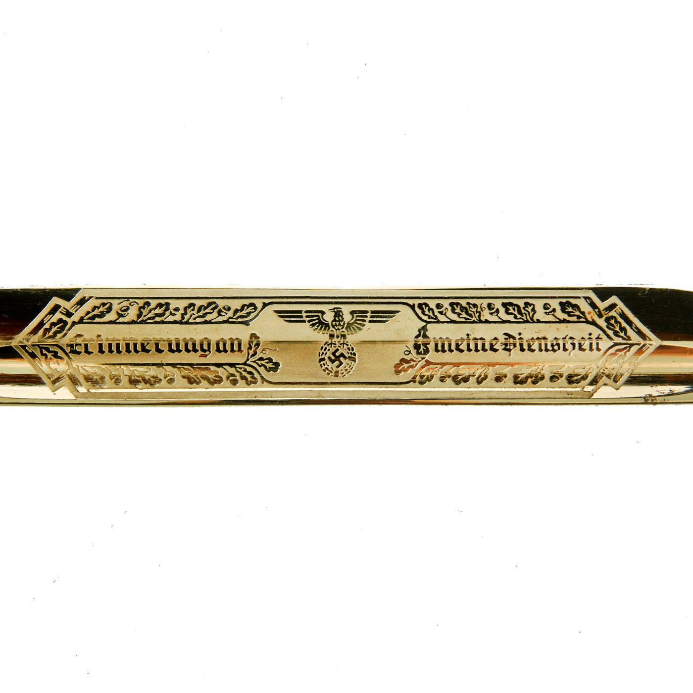 Enlisted or NCO personnel were permitted to purchase K-98 dress bayonets with fancy etched blades. These etchings run the gamut from simple designs featuring the standard remembrance, Zur Erinnerung an meine Dienstzeit (In Memory of My Service Time), to very fancy, custom etched depictions, citing the individual's regiment, unit, and sometimes even his name. Many blade factories offered unique etch patterns. The etch work was often state of the art.