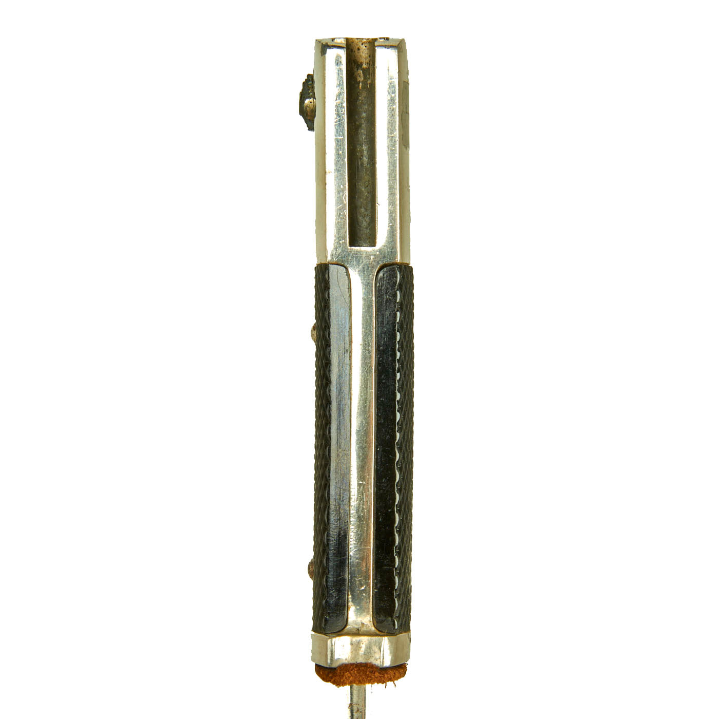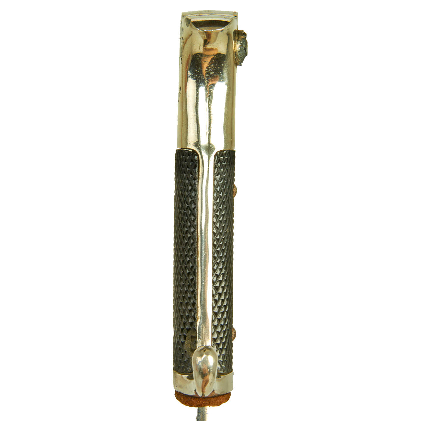 This very nice example is in very good condition, and comes complete with the original scabbard. The bayonet has a has a very nice custom etched nickel plated blade. It has has a nice alloy hilt, which still has much of the original nickel plating, with wear in some areas, particularly around the button. It looks like some corrosion took hold on the mortise button and blade release, which are currently seized. There is also a good amount of the alloy missing from the button, and it looks like previously someone tried to use a hammer to get the button to move. The felt inert is also missing. The grip plates are both lovely checkered black bakelite, and both are in very good condition. They are retained by nickel rivets which have dressed heads on the obverse.