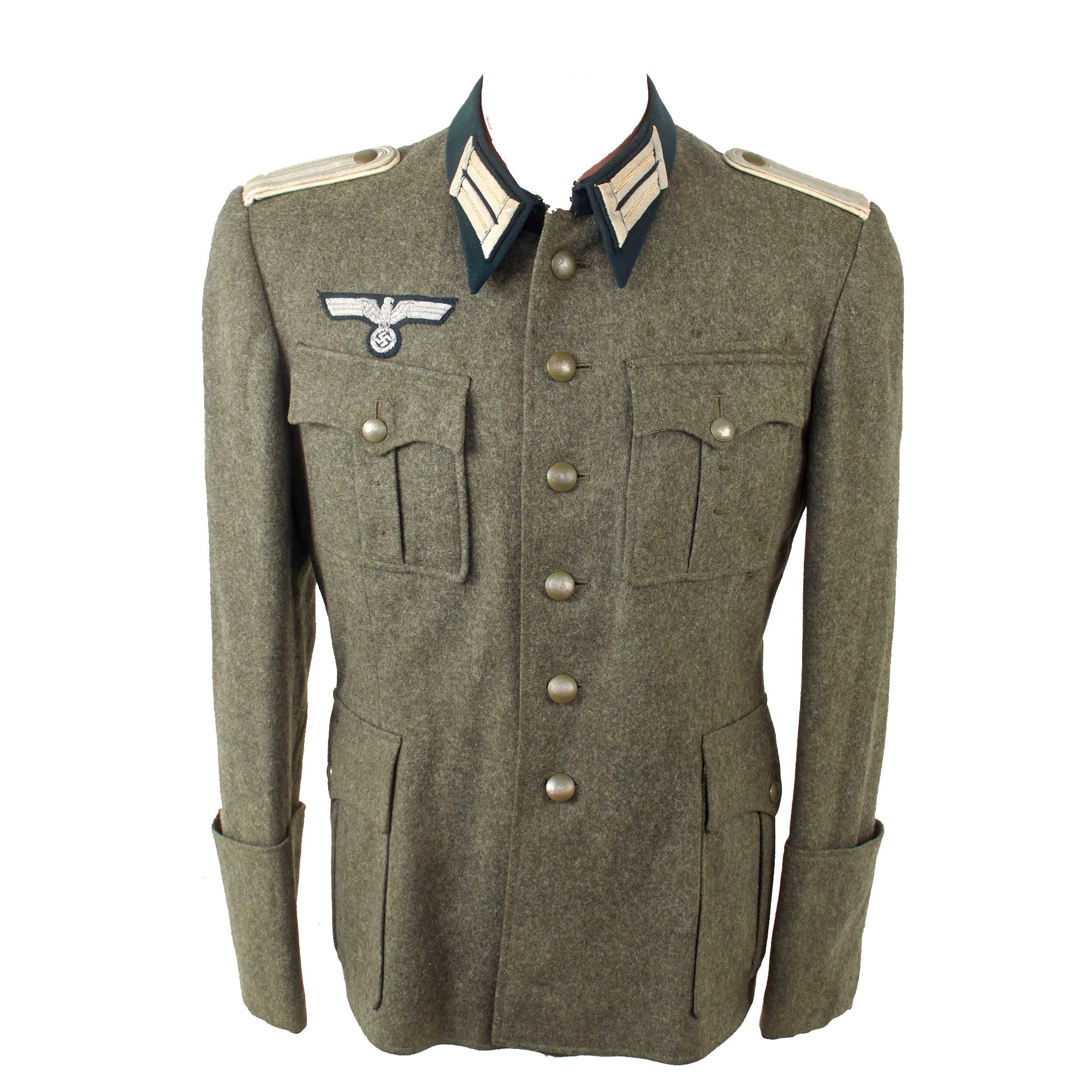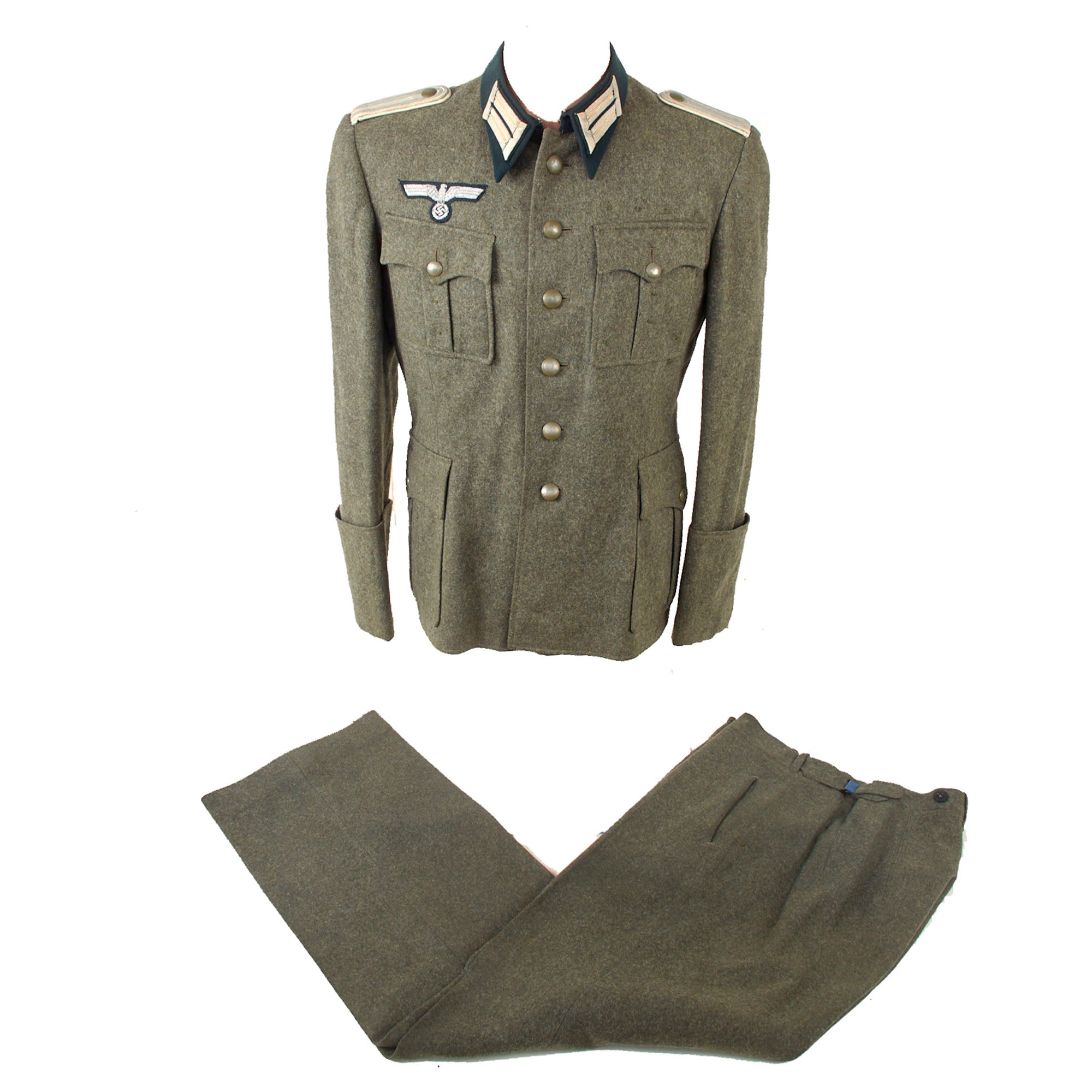 Original Items: Only One Set Available. This is a very nice German WWII Heer Army Infantry Leutnant Officer's M-36 Tunic, complete with the correct trousers. The set shows moderate wear from service and in very good display condition. We checked all of the pockets and the interior, and we were not able to locate any maker labels, so this was almost certainly bespoke, made by a local tailor for the officer.