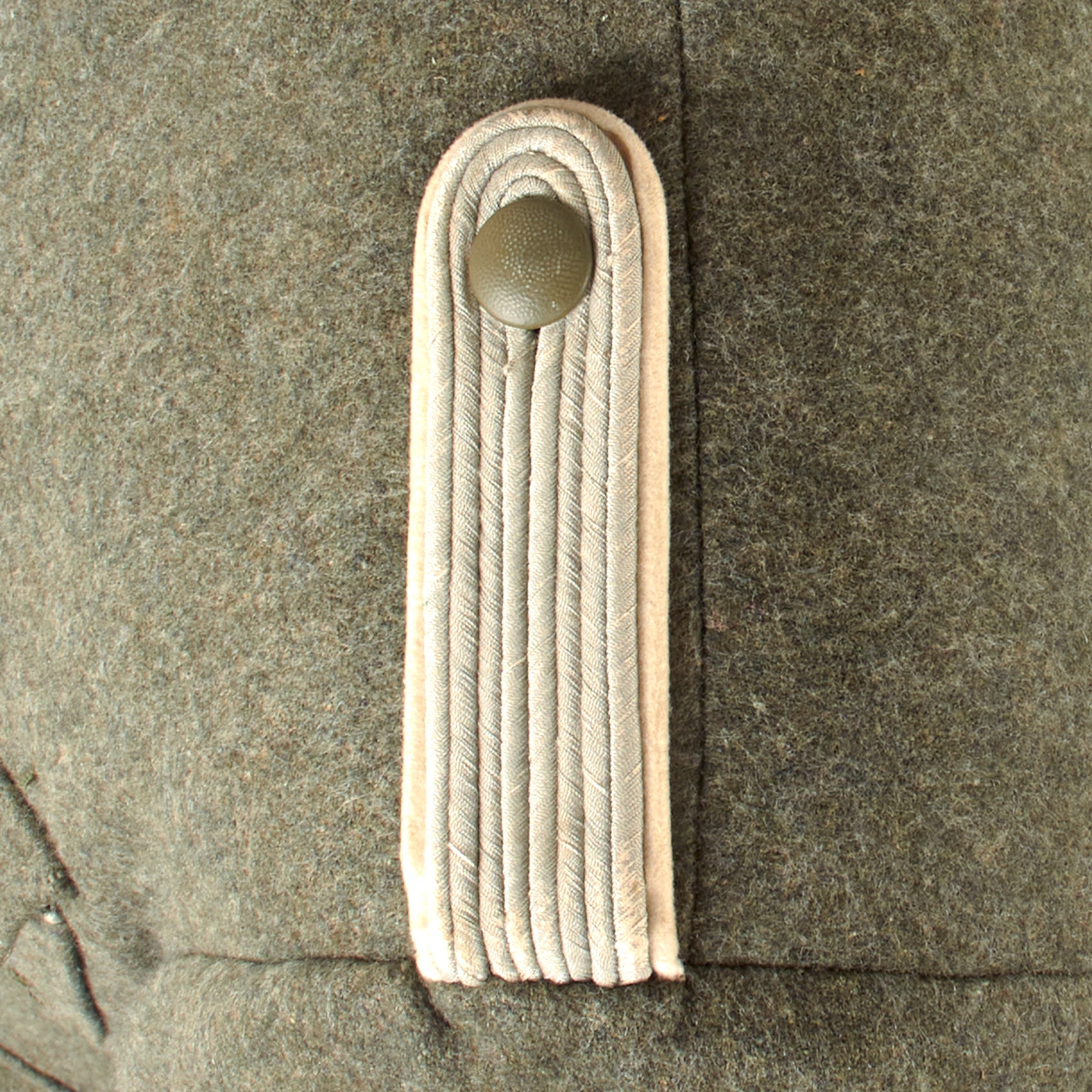 The colored stripes (mittelstreifen) on the litzen are Weiß (white) braided rayon, the Waffenfarbe (Corps Color) during WWII for Infanterie (Infantry) and Motorisiert Infanterie (Motorized Infantry). The “sew-in” style company grade officers schulterklappen (shoulder boards) of this tunic are constructed with two rows of fine silver flatware "Russia Braid" double piping and have the correct white bases, which protrudes around the edges. There are no rank pips, indicating the rank of Leutnant, equivalent to a U.S. Army 2nd Lieutenant. The left chest pocket has several pairs of thread loops on it, where there was likely originally an awards attached. There are additional loops above for a medal bar, and even some on the right pocket.
