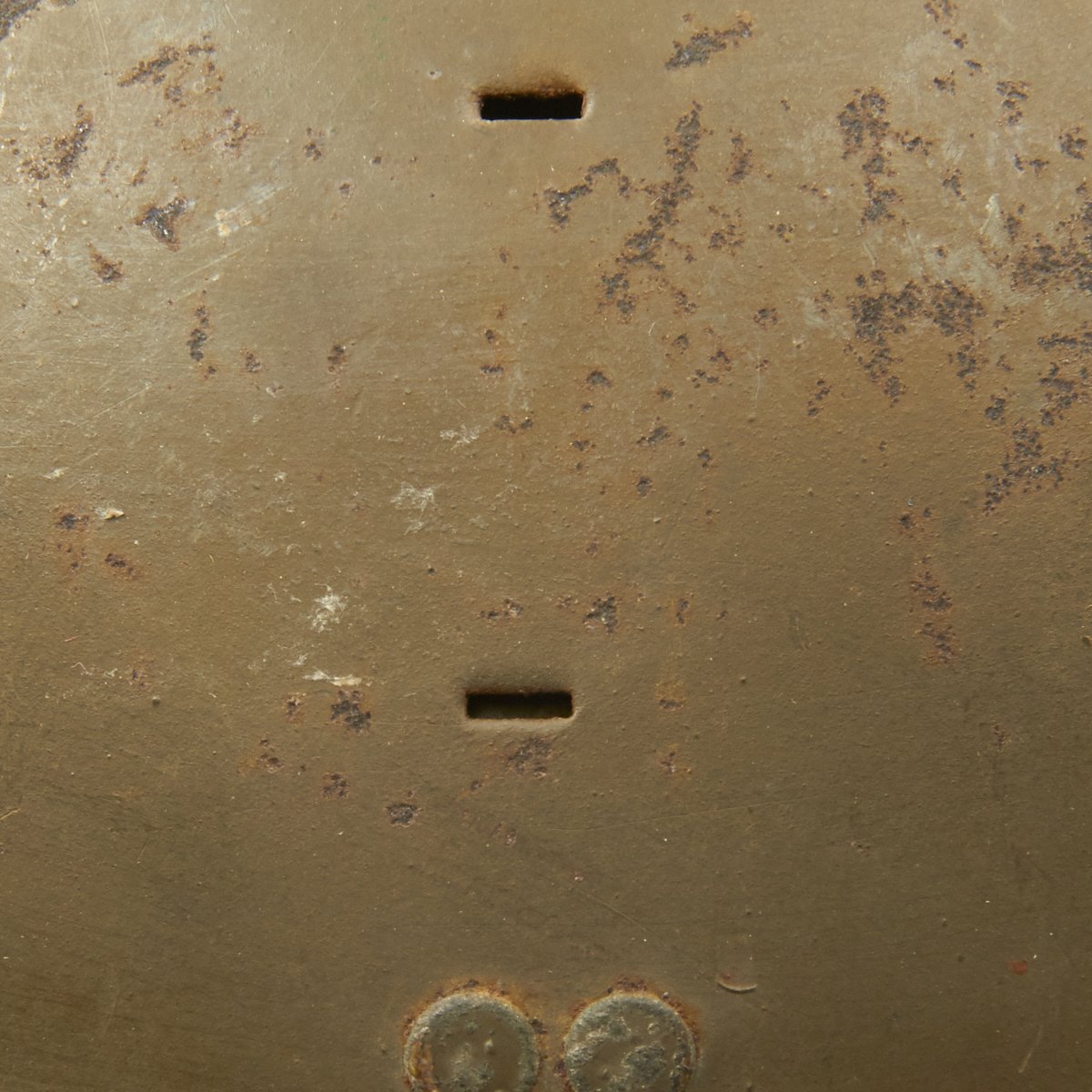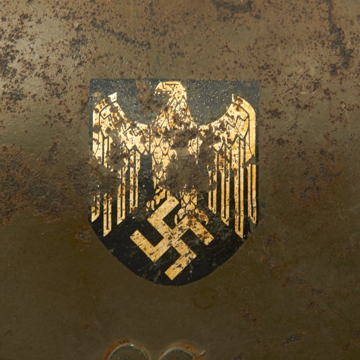 The helmet retains the original olive green paint. The traditional RF emblem helmet plate was removed and a single German army Heer decal was applied to the right side of the helmet. The decal is retained at 80%.