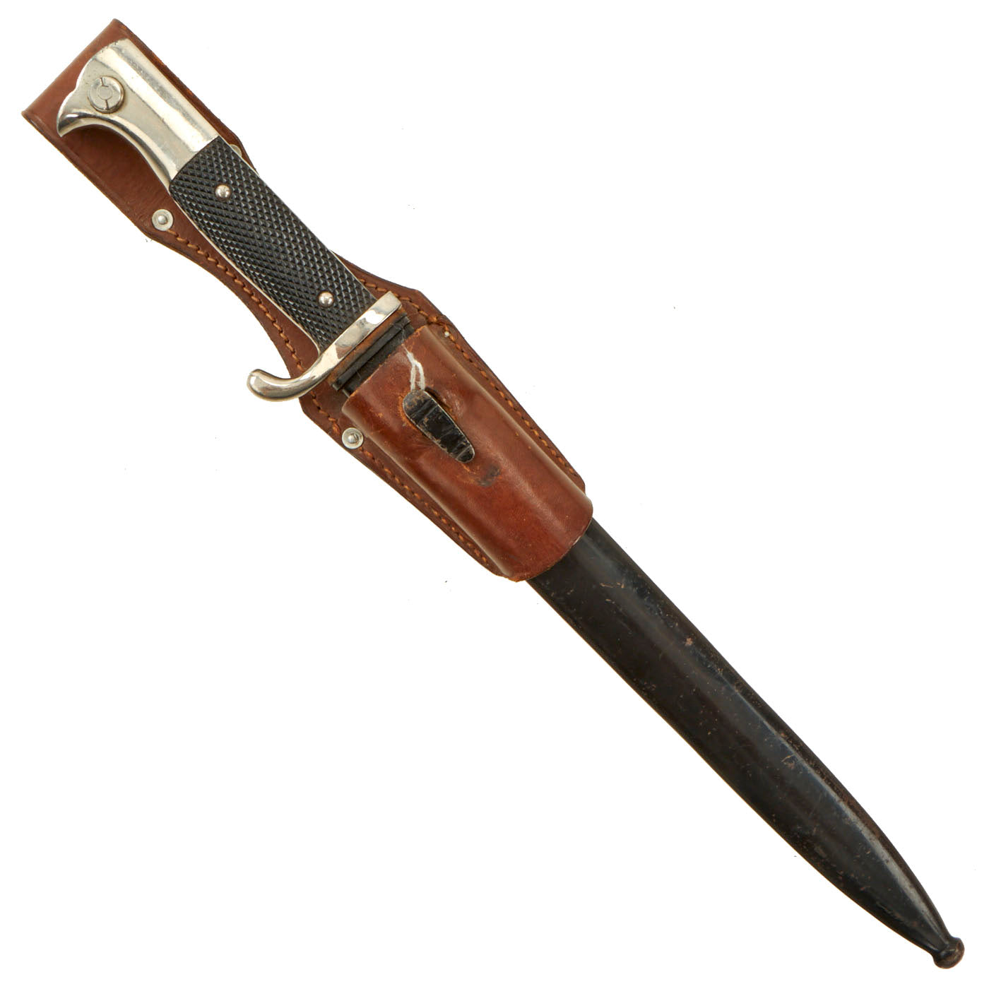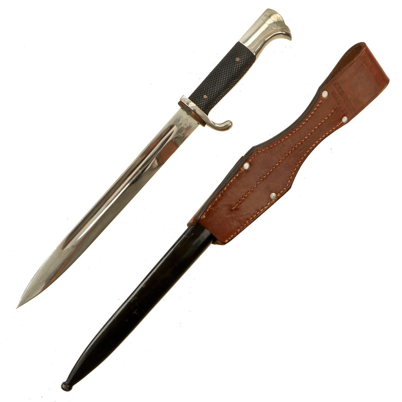 Original Item: Only One Available. The K-98 dress bayonet was a dress version of the combat style, and was worn by enlisted and NCO personnel for dress and parade occasions. The bayonets were finished with a high-quality nickel plating, with stag or bakelite grip plates and black painted scabbard. The choice of blade length was left to the purchaser, either the nickel-plated short (20cm) or long (25cm) version. There was usually a red or green colored felt insert in the rifle slot and the bayonet was suspended from a black or brown leather frog. Some had a functional bayonet latch, while it was ornamental on some. Often they would also have a sword knot, or troddle, and the color would indicate the branch or rank.