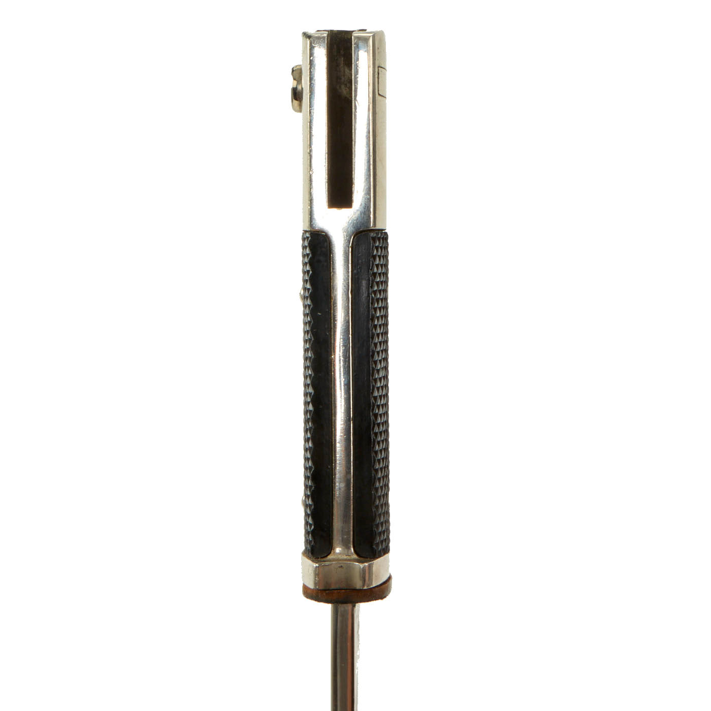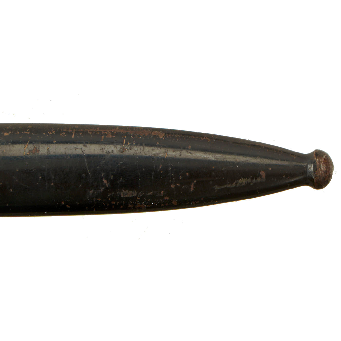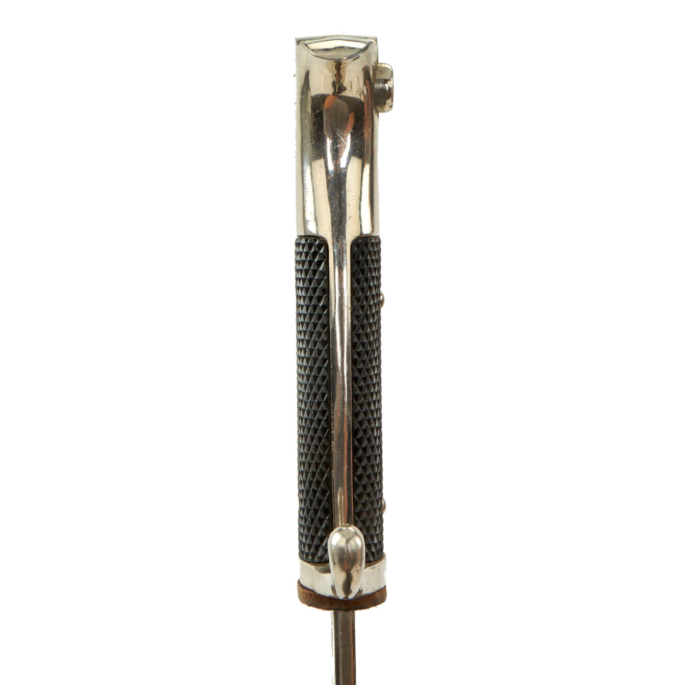 The blade on this example is nickel-plated, as were all dress bayonets, and it shows almost no wear at all. It has not been sharpened, and still retains its blunt factory edge. The original black leather blade buffer is in place, and is in very nice condition.