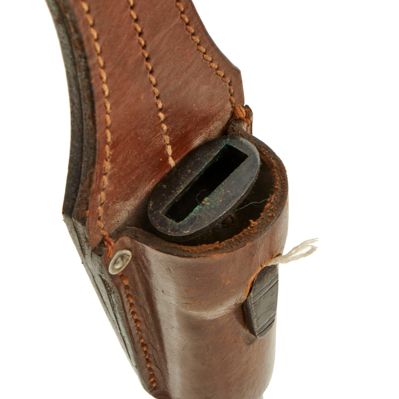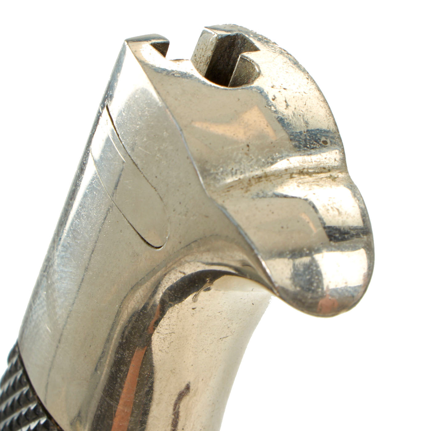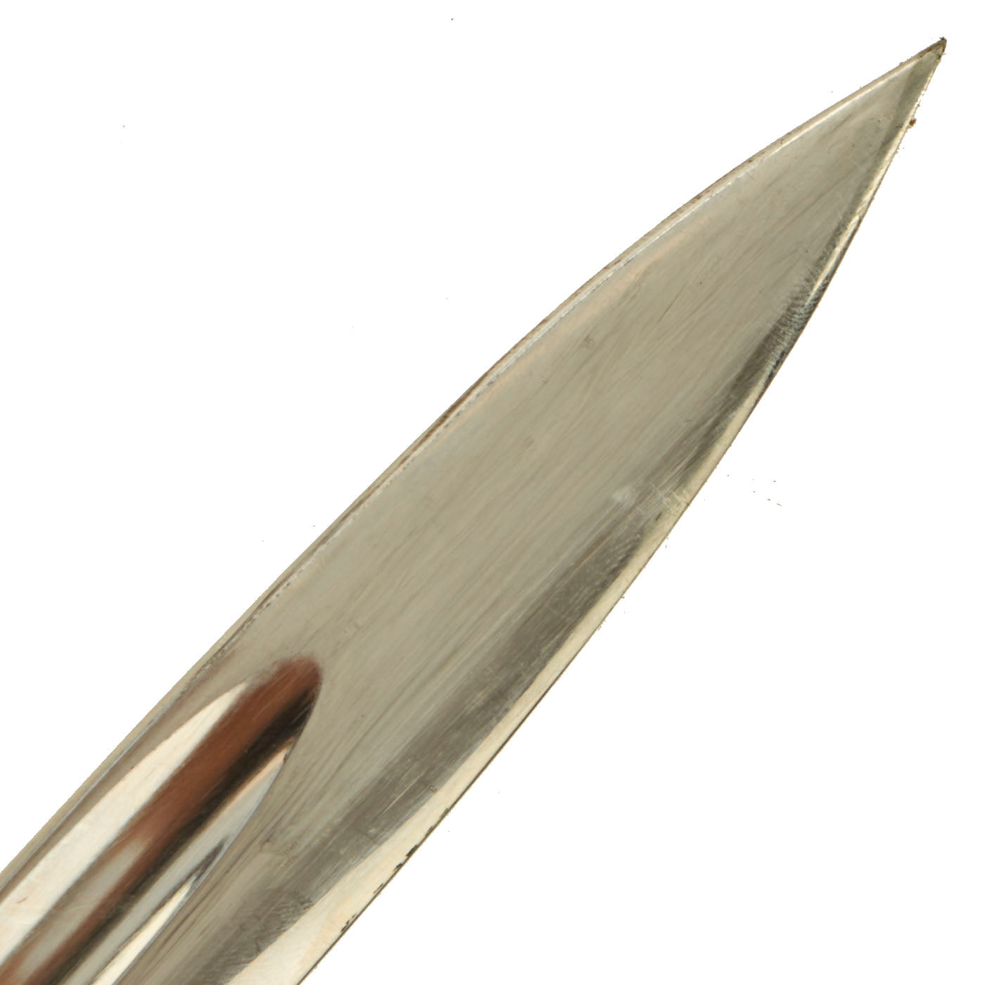 The blade on this example is nickel-plated, as were all dress bayonets, and it shows almost no wear at all. It has not been sharpened, and still retains its blunt factory edge. The original black leather blade buffer is in place, and is in very nice condition.