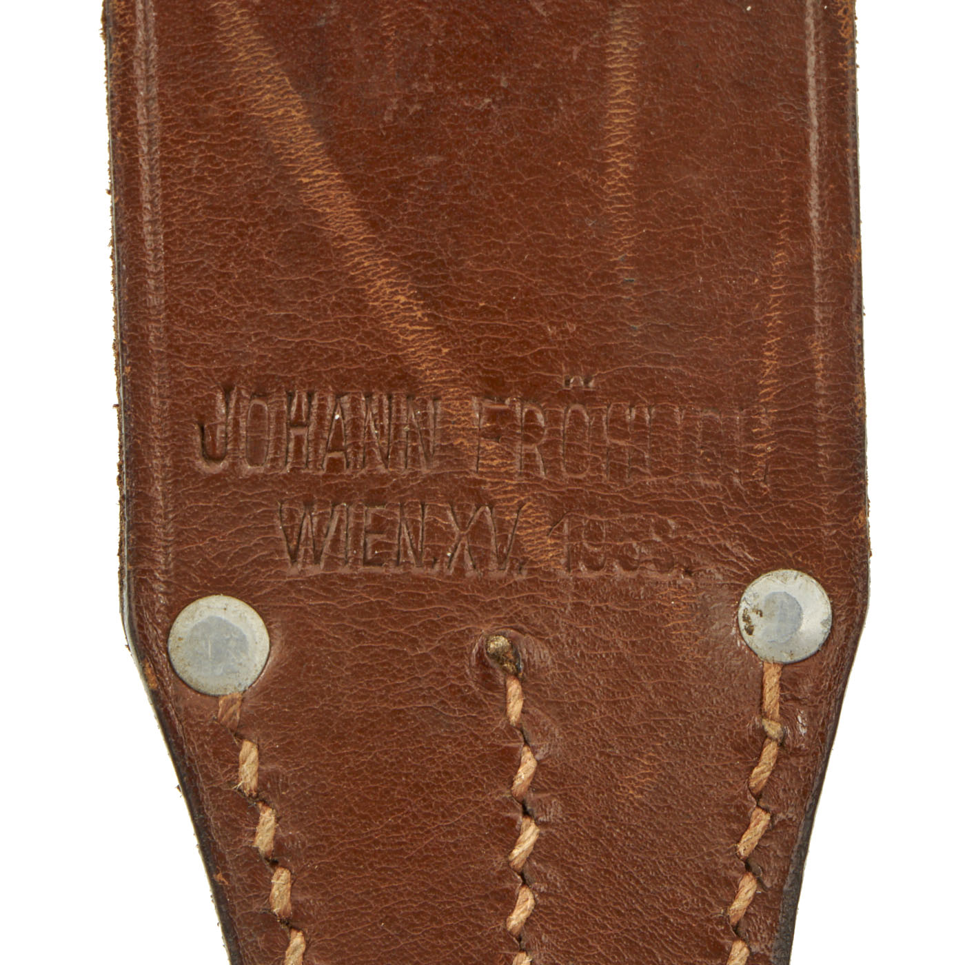 The scabbard is straight throughout and has black enamel paint. This paint is still in good condition with just a couple of scratches, and the usual crazing and checking from age. Attached to the scabbard is a nice leather frog, which is almost in perfect condition. A very nice scabbard and frog combination. On the back side of the scabbard, you can find the markings: JOHANN FRÖLICH / WIEN. X.V. 1938. This is the manufacturer who made the scabbard, located in Wien (Vienna, Austria).