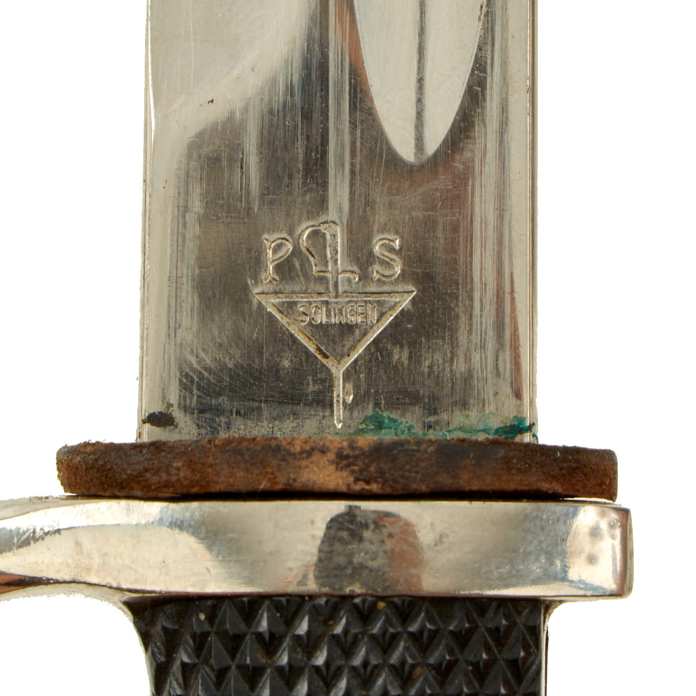 Paul Seilheimer, Waffenfabrik was located in the Solingen - Wald area, and was founded in 1917. The "Sword Piercing a Triangle" mark was specifically used on "walking out" bayonets and dress swords during the WWII Period, per J. Anthony Carter's work GERMAN KNIFE AND SWORD MAKERS. The company continued operation until 1970, though members of the family are still involved in Solingen industry to this day. The original leather blade buffer is still present in the cross guard.