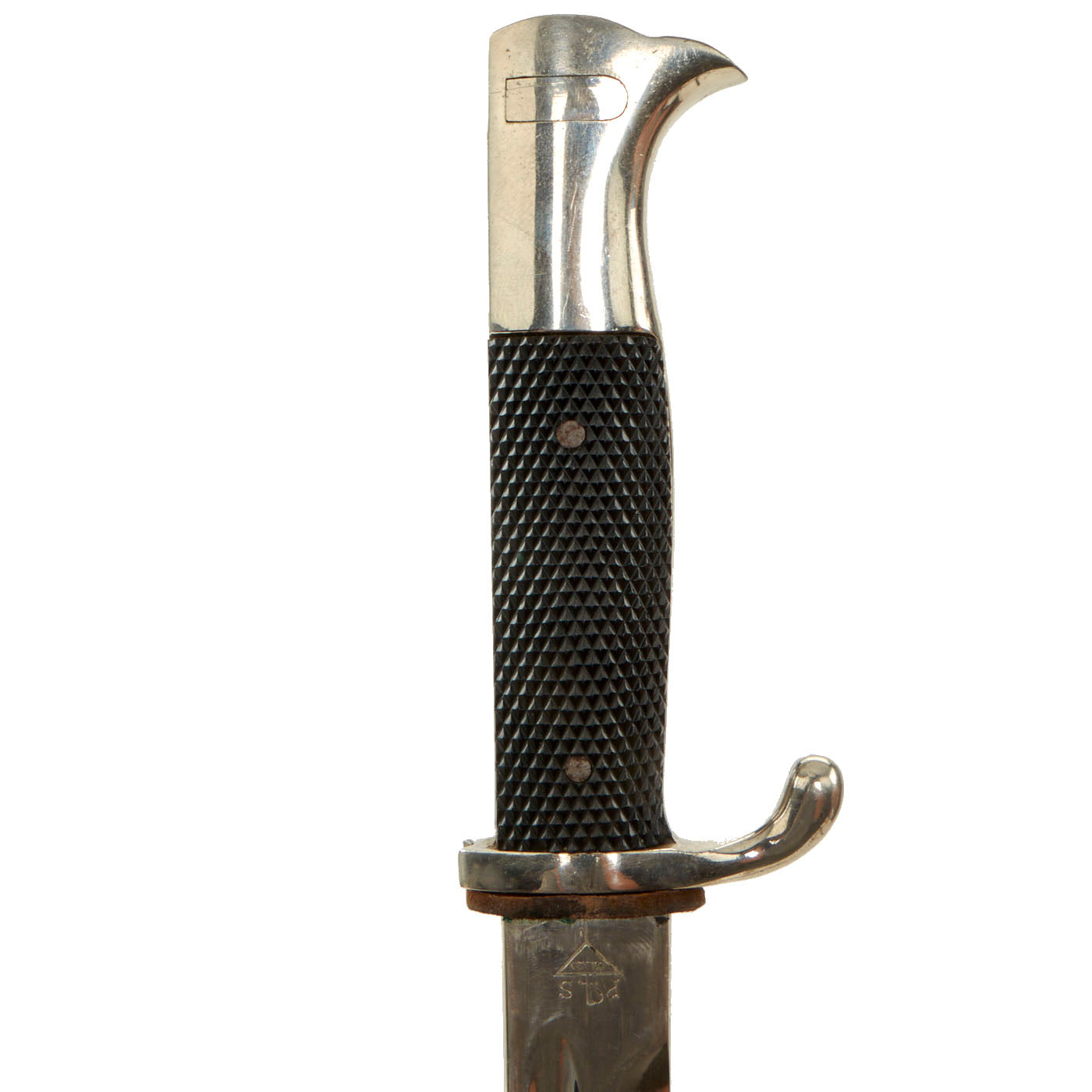 This great Heer (army) example is in excellent condition, and has a nickel plated blade, as all dress bayonets do. It has has a nice alloy hilt, with most of the Nickel Plating intact, though there is some light wear, as shown. The mortise button and blade release are fully functional, though the felt insert is missing. The grip plates are both lovely checkered black bakelite, and both are in great condition. They are retained by nickel-plated steel rivets which have dressed heads on the obverse.