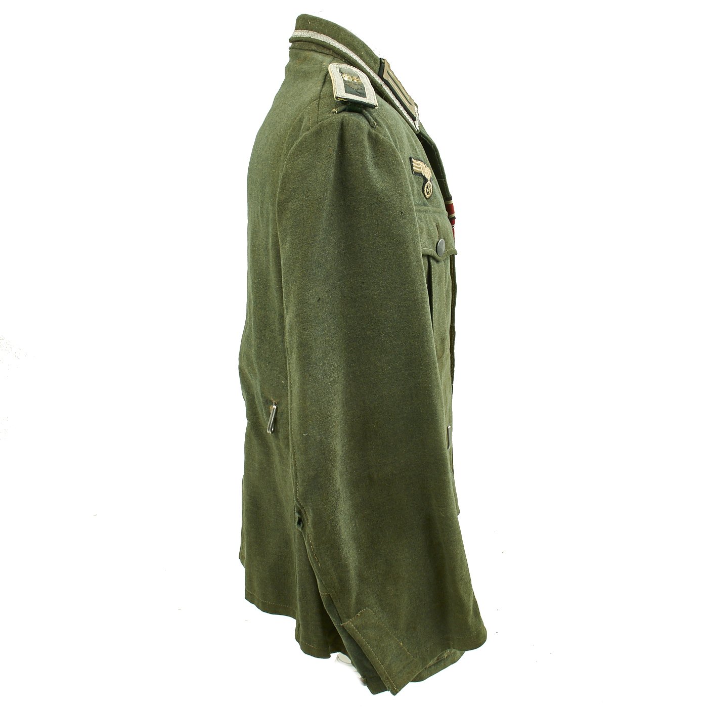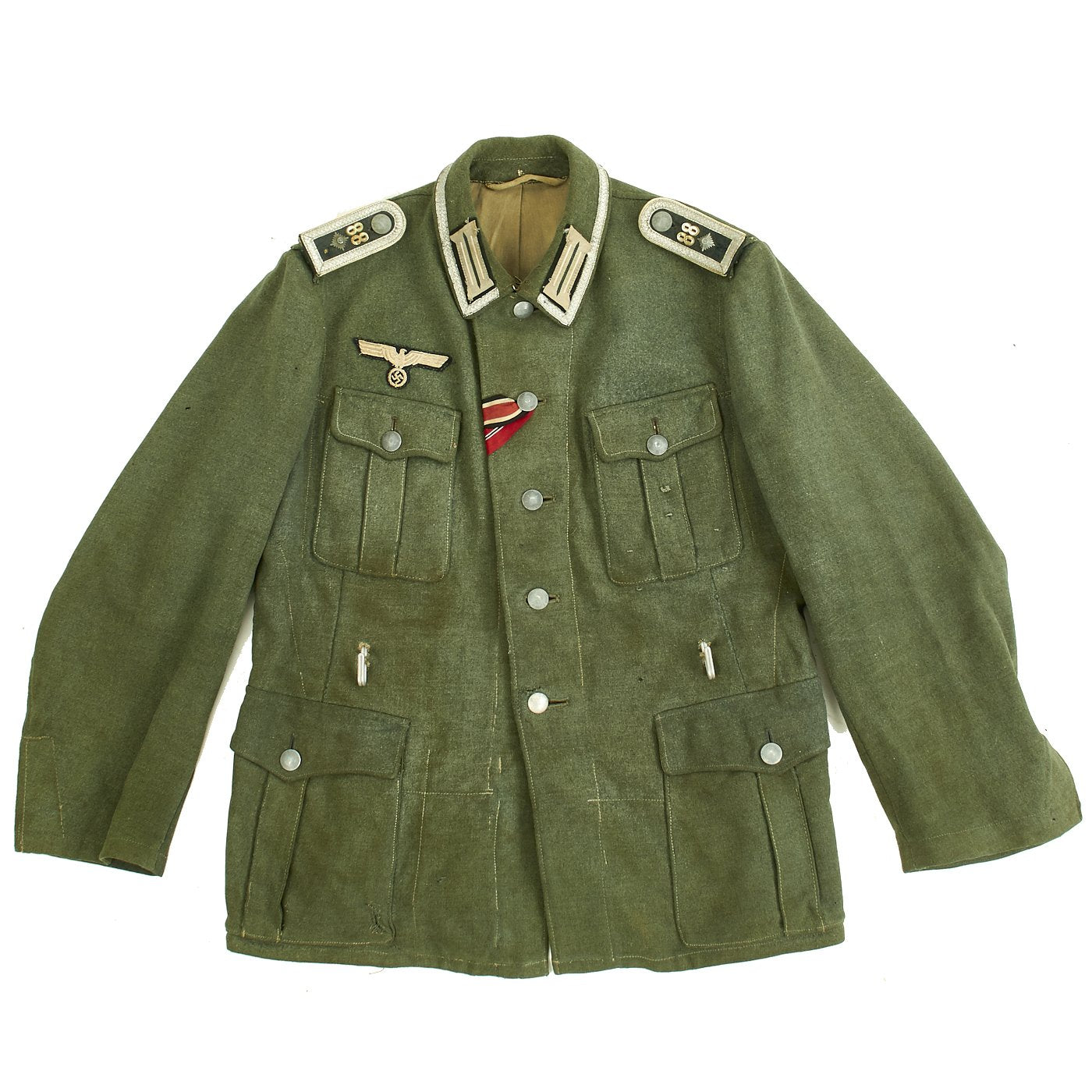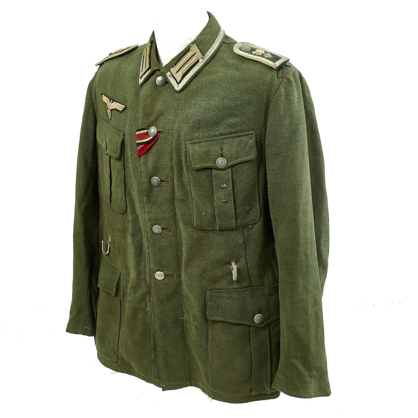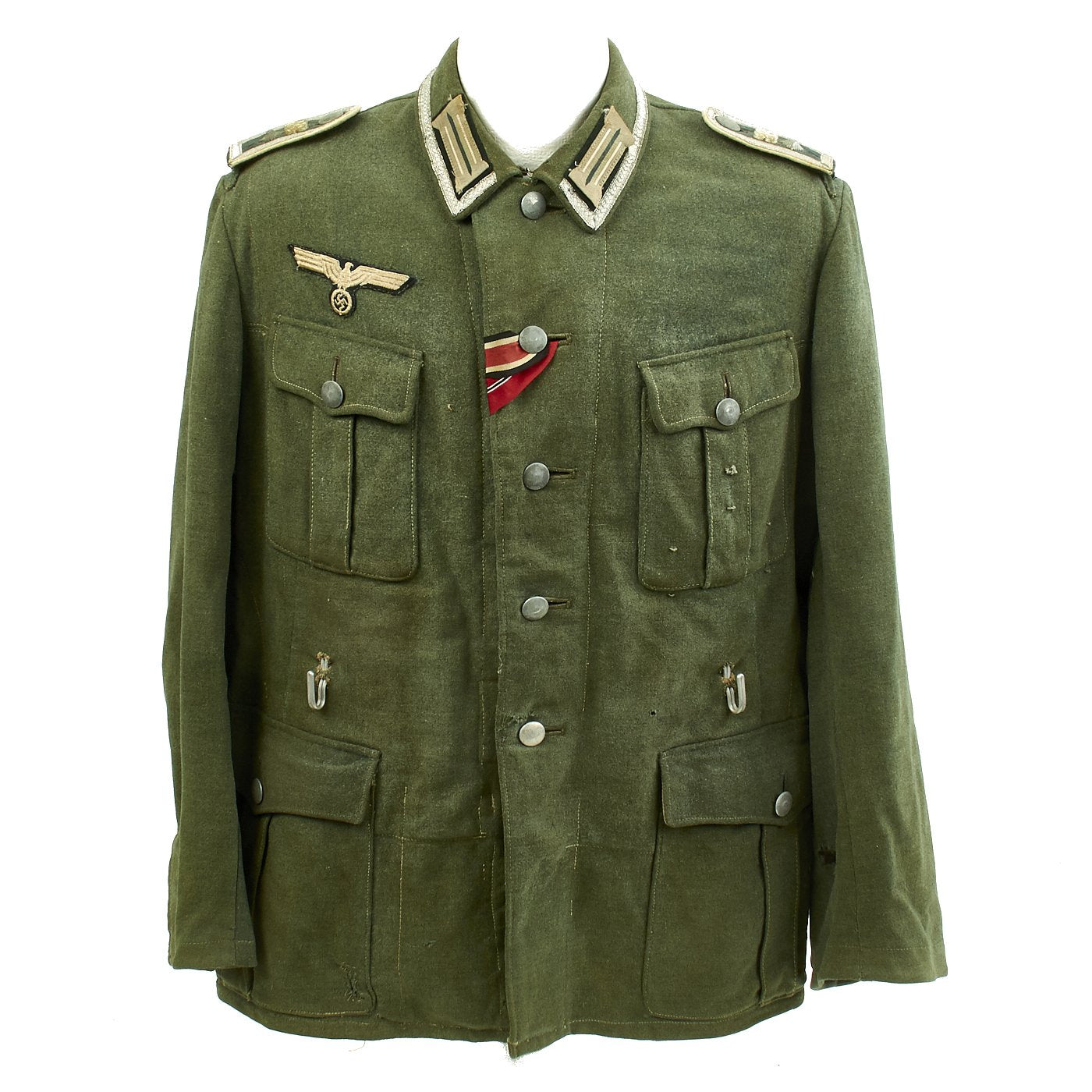 The embroidered Heer breast eagle is in good condition. The pocket and main closure pebbled dish buttons are green painted zinc and are in good condition with a few scattered marks from use. An Iron Cross Second Class Ribbon and a Eastern Front Medal ribbon have been neatly hand sewn through the second button hole and show light wear consistent with the tunic.