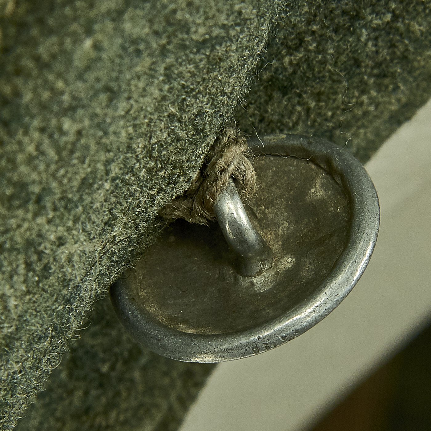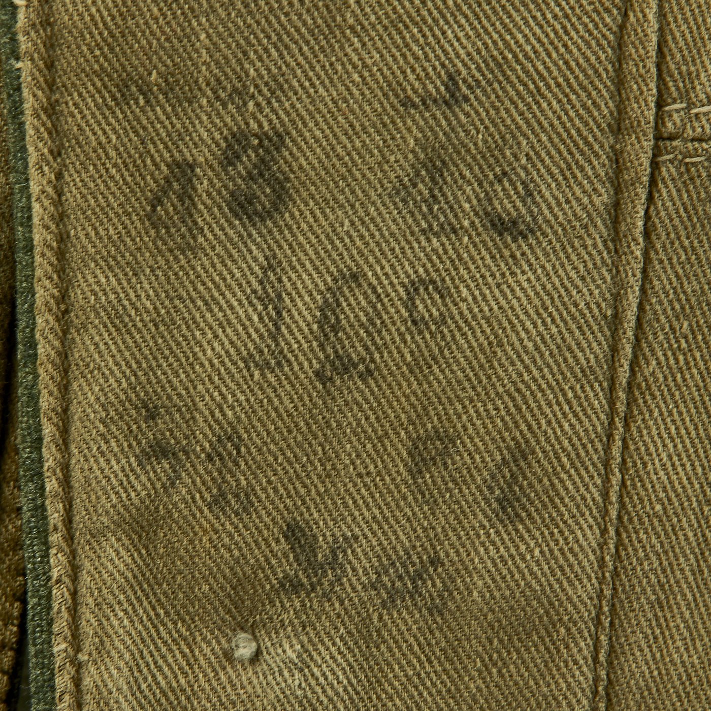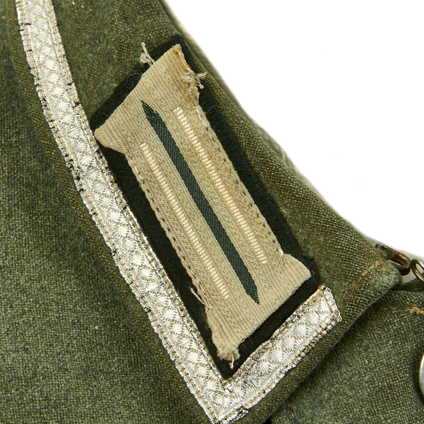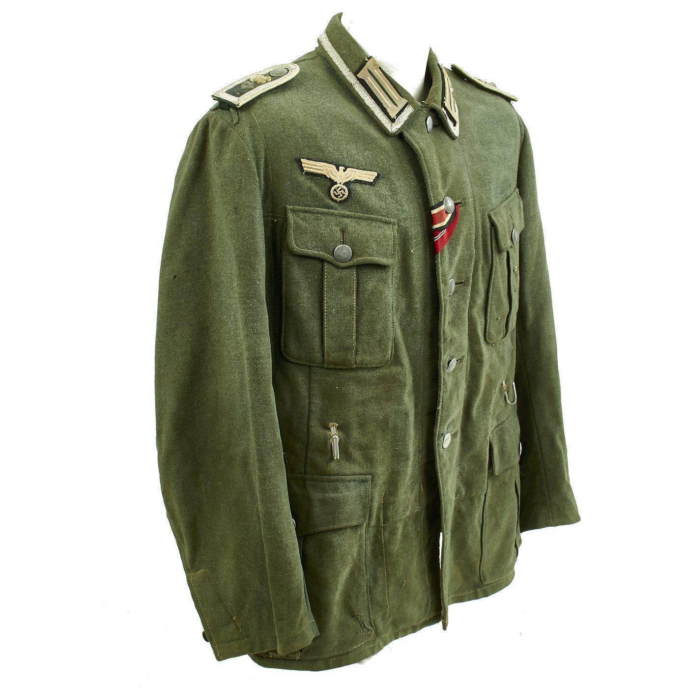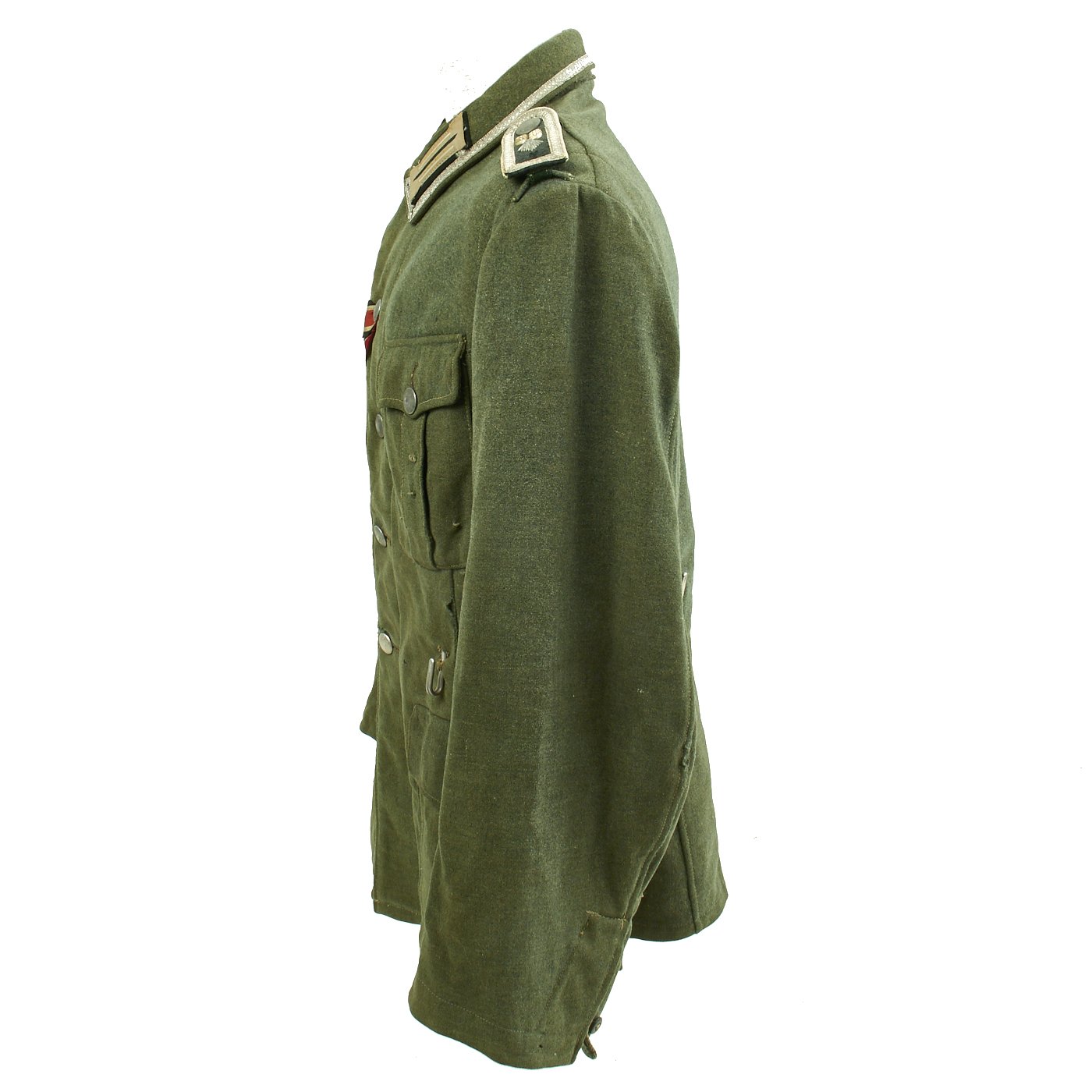 The embroidered Heer breast eagle is in good condition. The pocket and main closure pebbled dish buttons are green painted zinc and are in good condition with a few scattered marks from use. An Iron Cross Second Class Ribbon and a Eastern Front Medal ribbon have been neatly hand sewn through the second button hole and show light wear consistent with the tunic.