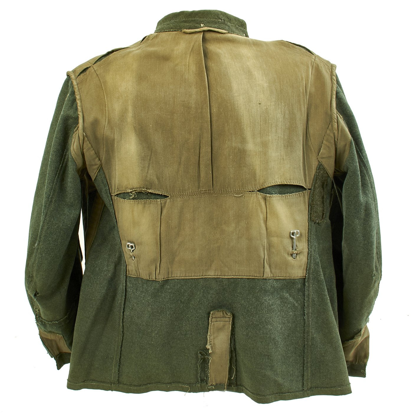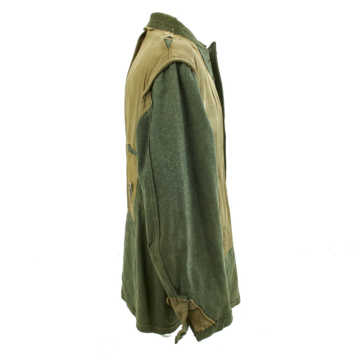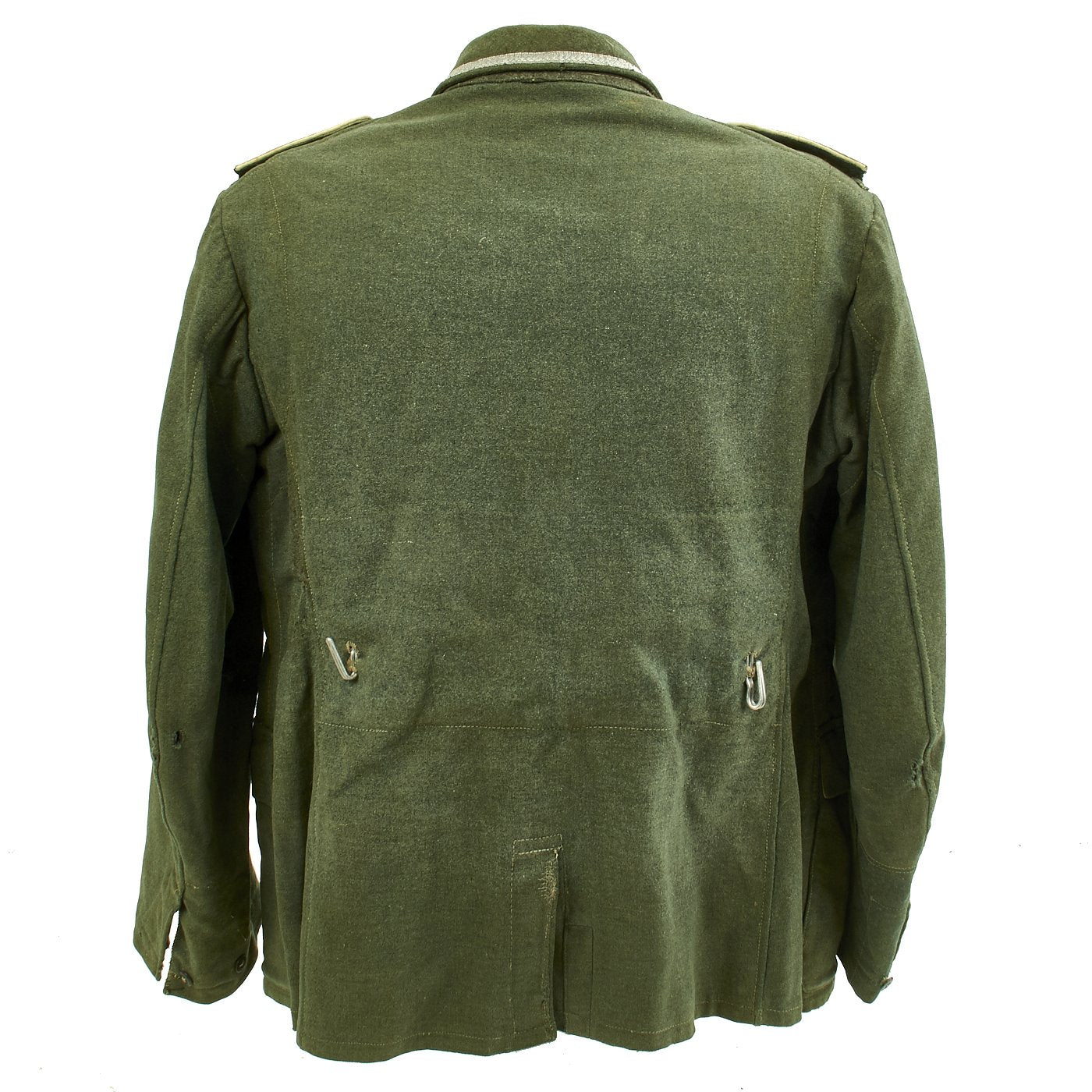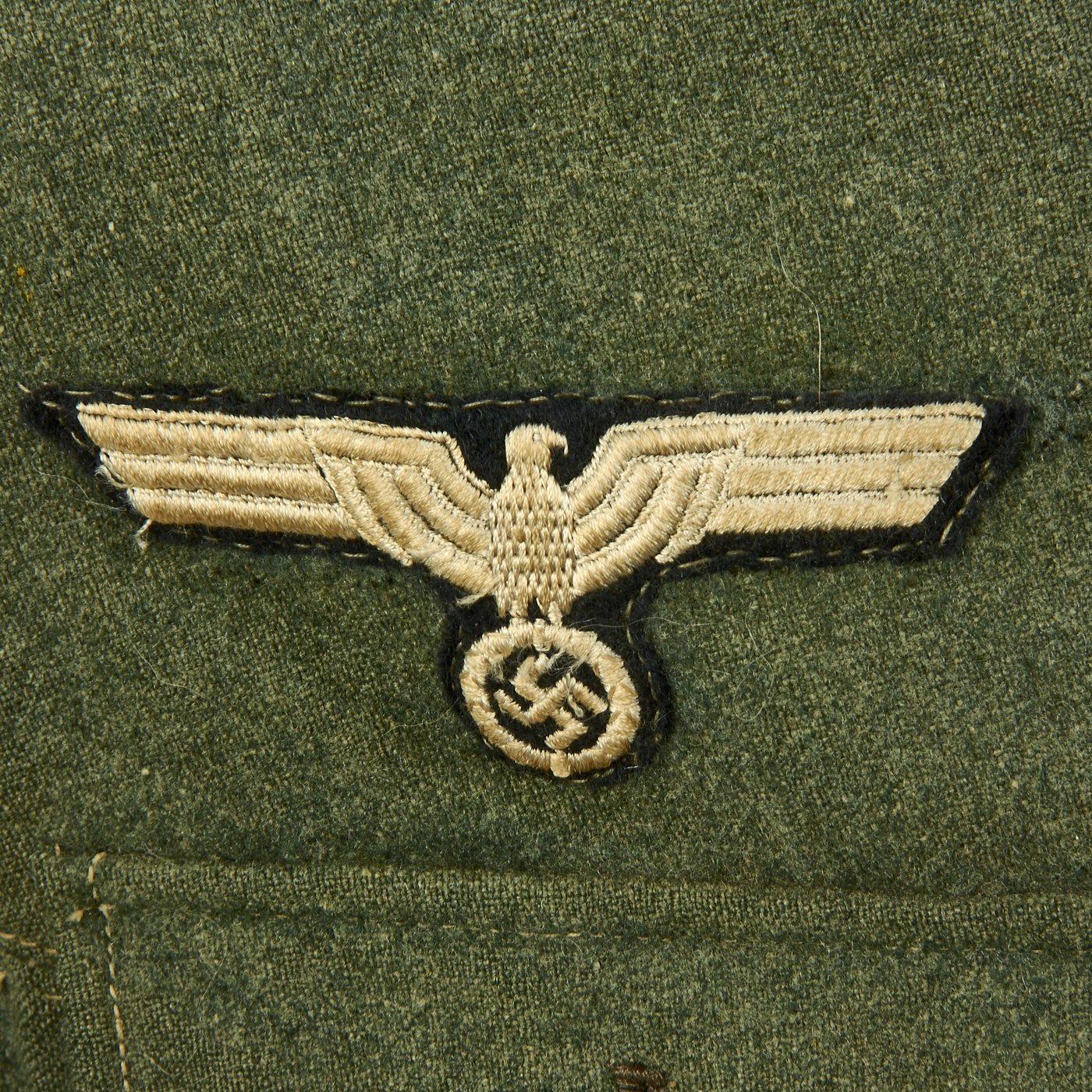 The Deutsche Heer, the Army of the German Military during the Third Reich, was established in 1935. Over the next 10 years, German Army troops wore a huge variety of uniforms. Enlisted men generally wore uniforms issued from military depots. Most enlisted soldiers wore wool trousers and a tunic with four external pockets, known as a Feldbluse (field blouse). Before the war, soldiers also were issued a walking-out tunic, with flashy insignia, called the Waffenrock. Officers wore the same general uniform styles, but as officers had to supply their own uniforms, they usually wore tailor made versions. There were also myriad varieties of specialized uniforms worn by certain units or in specific situations, from the stylish black wool “wraps” worn by crews of armored fighting vehicles, to the drab HBT work uniforms. There were tropical and summer uniforms, and camouflage smocks for combat troops. For troops operating in winter climates, there were long wool overcoats, fur clothing articles, and padded jacket and trousers sets. In 1944, a new uniform was introduced, featuring a short jacket with only two external pockets. Most but not all German Army uniform jackets bore the Heer emblem of an eagle holding a swas.