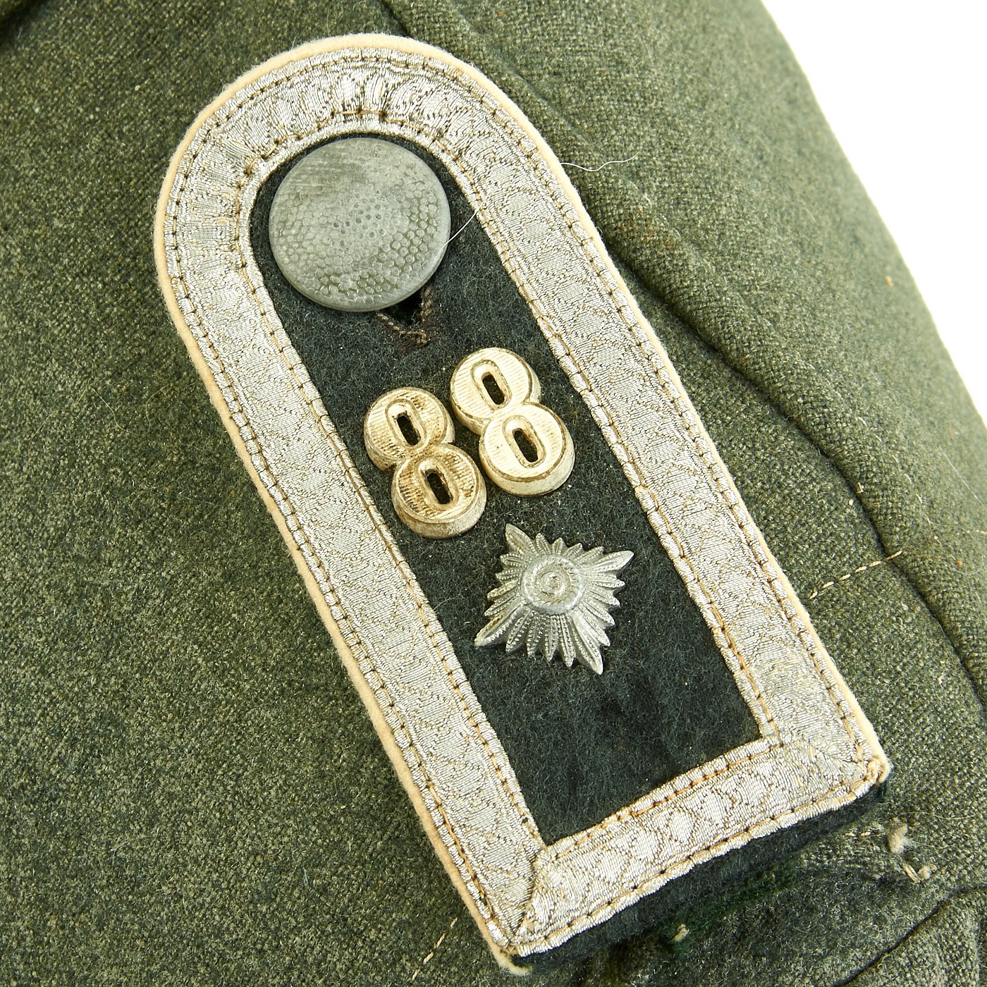 Original Item: Only One Available. A Heer M43 NCO Tunic in excellent condition. The base of the tunic is constructed of a feldgrau wool. Four pockets adorn the front, with each pocket flap being the simple straight cut and fastened with painted pebbled zinc dish buttons. The tunics upper left breast pocket carries three sets of award loops which appear to have been on he tunic for a length of time. The standard Bevo EM collar litzen are machine sewn in place, and appear to be original to the tunic. The collar features a strip of silvered tress, indicating the wearer of this tunic was an NCO. The collar tress is neatly hand sewn in place. The slip-on style shoulder boards are in nice condition and feature the same style of silvered tress found on the collar. The edges of the boards are trimmed with a white piping, indicating the soldier was in the Infantry. Number 88 is attached to each shoulder board.