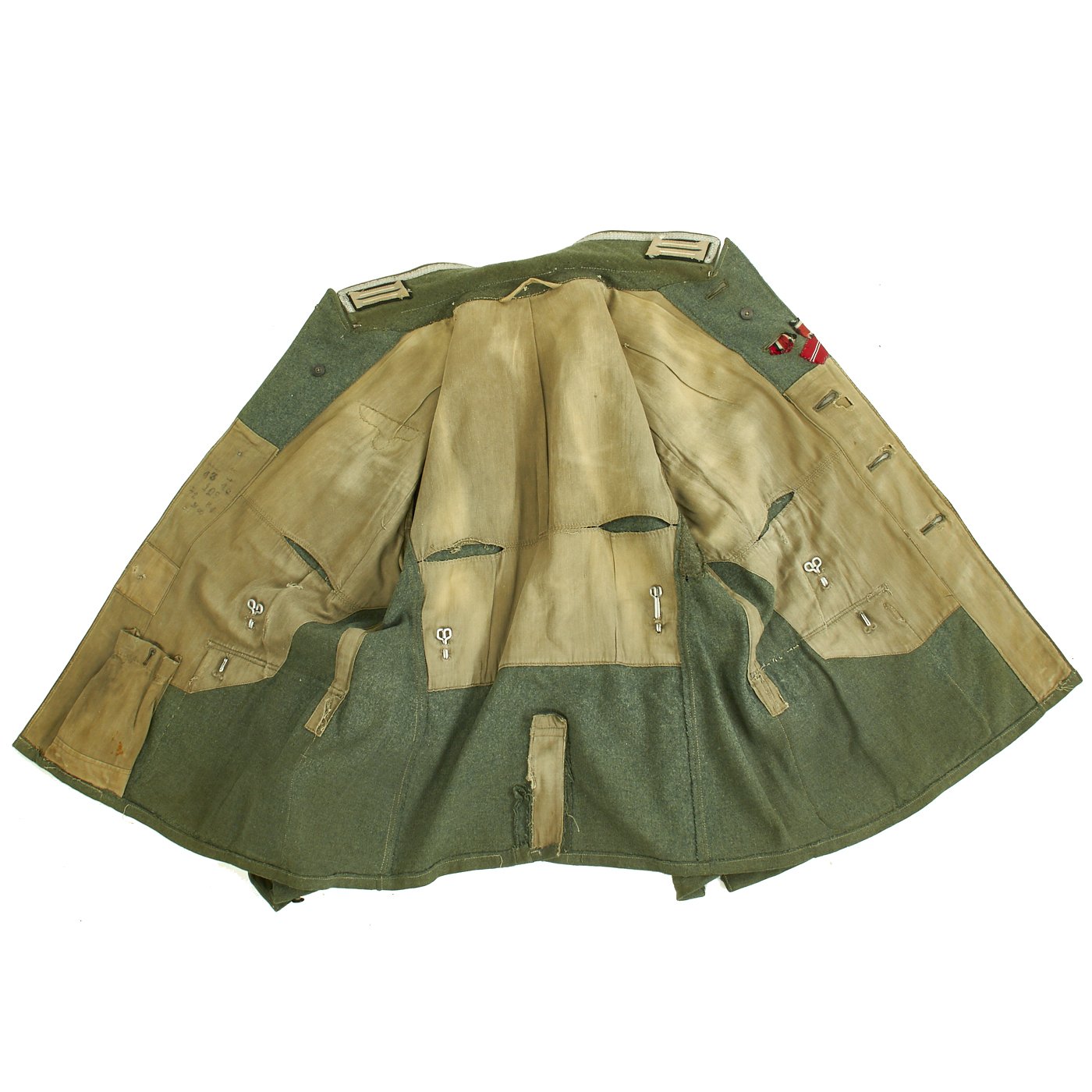 The interior of the tunic is lined cotton which is in overall good used condition showing only a few areas of sweat staining. The interior has four aluminum belt hooks. The interior of the tunic is ink stamped above the the medical pouch pocket with the tunics sizing, depot code, and year (43). A small medical kit is still enclosed in the medical pouch pocket. This is a very nice representative of the classic German Heer M43 NCO Tunic which shows signs of true combat use.