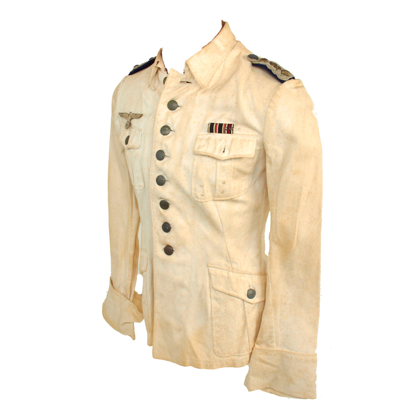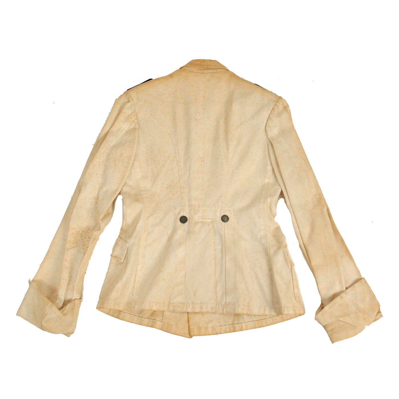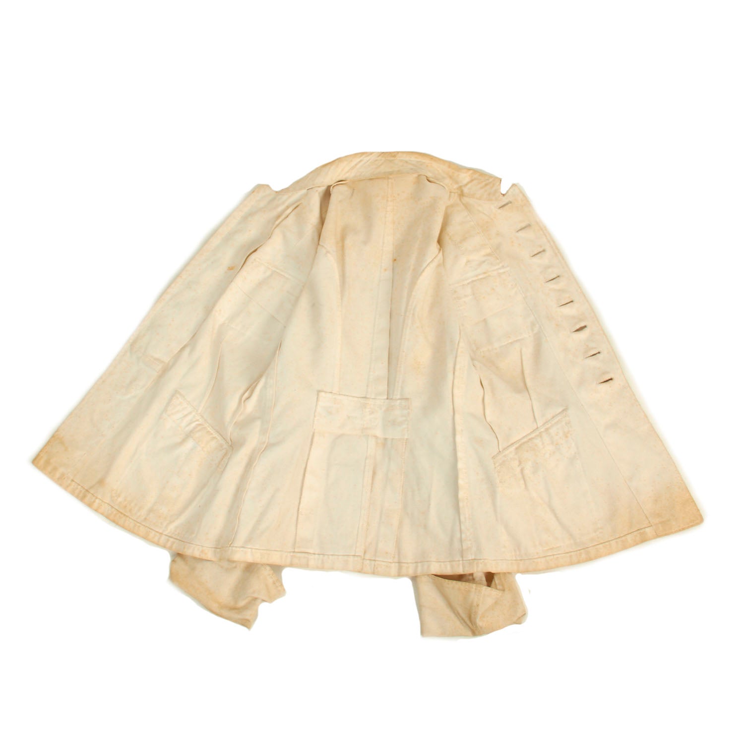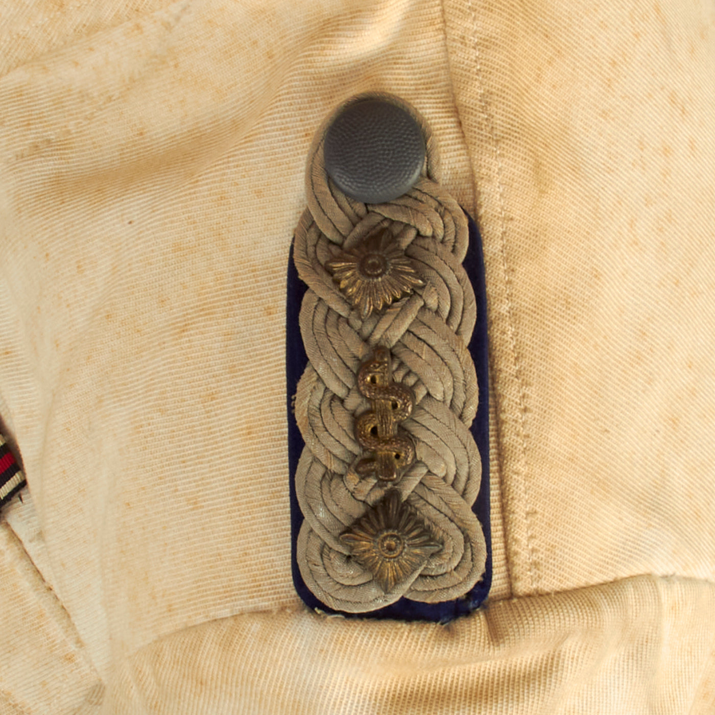 Original Item: Only One Available. This very nice condition summer tunic is fabricated from a white cotton material, which is both lightweight and soft. The shoulders are adorned with Heer Medical Stabsoffiziere Schulterstücken ( Staff Officer shoulder boards), incorporating two rows of fine silver flatware "Russia Braid" double piping, which are plaited together to form a loop around the buttonhole. The sides and underside are Medizinblau (Medical / Deep Blue), the Waffenfarbe (corps color) for the Heer Sanitätstruppe (Military medical service). Each bears 2 gold rank "pips" surrounding the medical service Asklepian (Rod of Asclepius). This indicates the staff officer rank of Oberstarzt (Chief Physician).
