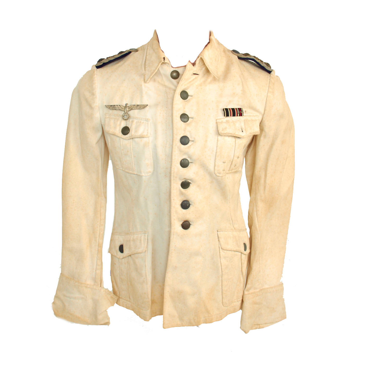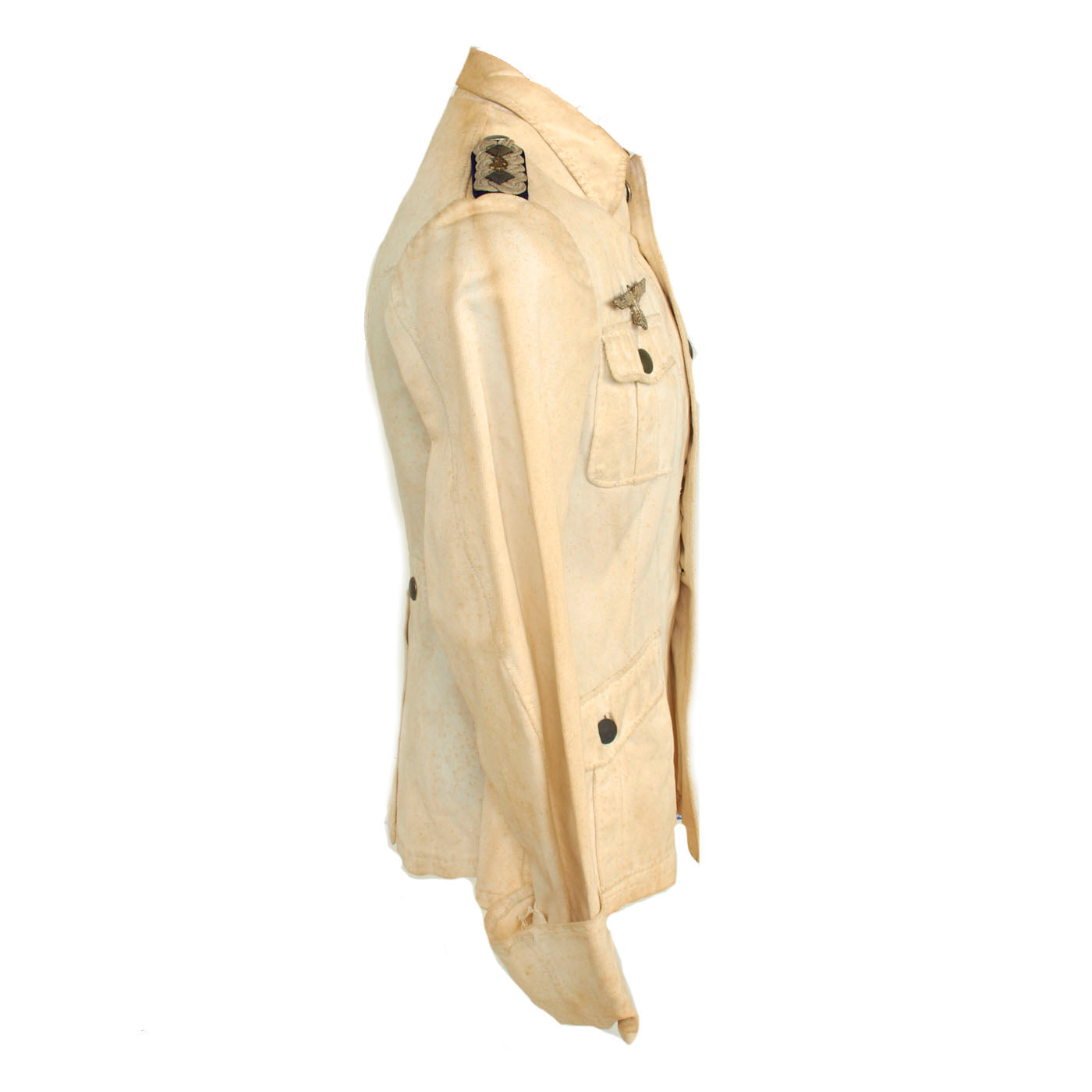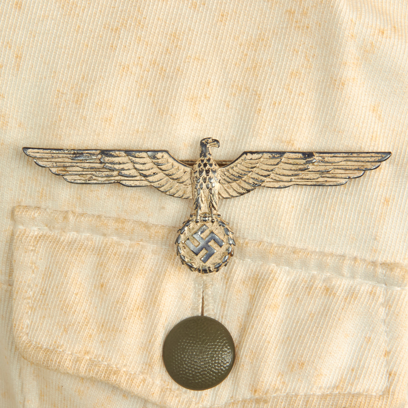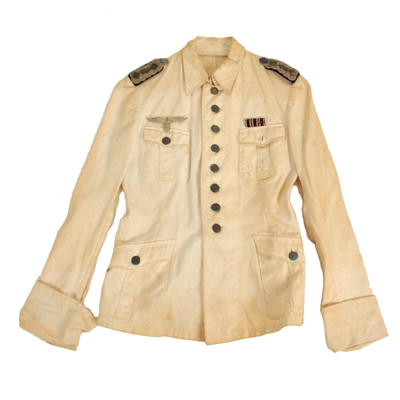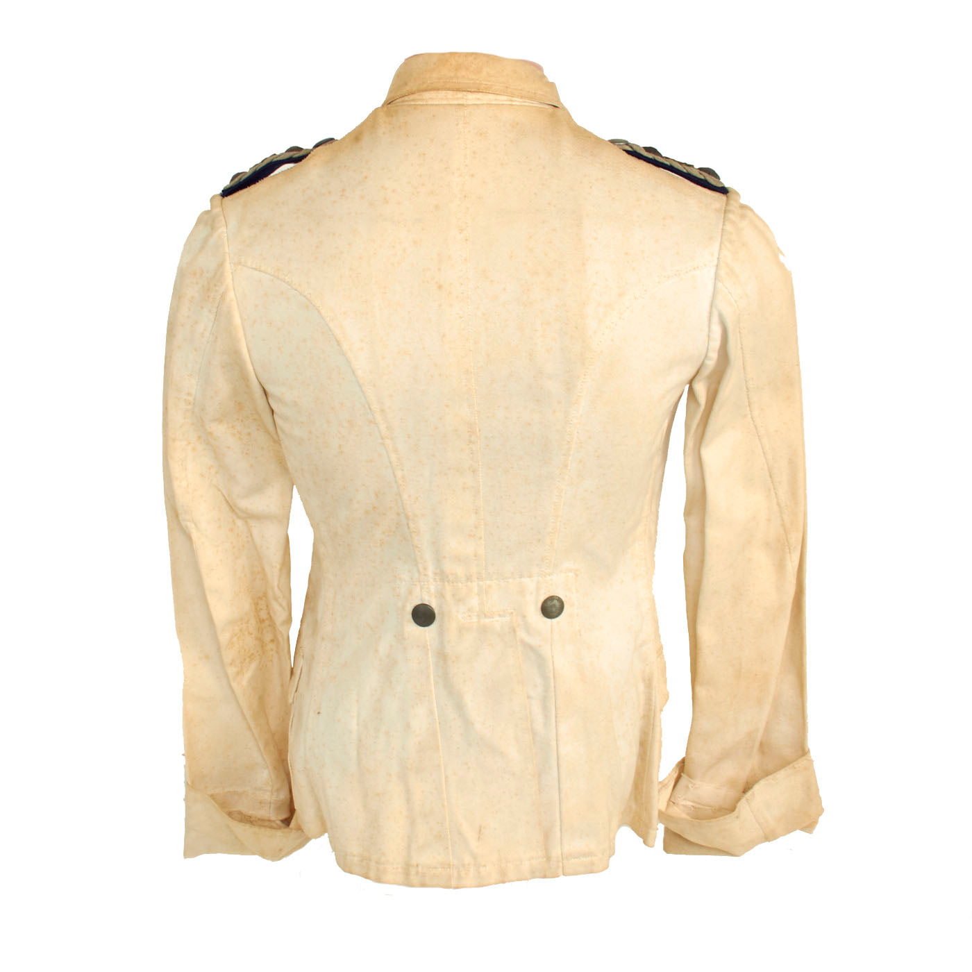 Original Item: Only One Available. This very nice condition summer tunic is fabricated from a white cotton material, which is both lightweight and soft. The shoulders are adorned with Heer Medical Stabsoffiziere Schulterstücken ( Staff Officer shoulder boards), incorporating two rows of fine silver flatware "Russia Braid" double piping, which are plaited together to form a loop around the buttonhole. The sides and underside are Medizinblau (Medical / Deep Blue), the Waffenfarbe (corps color) for the Heer Sanitätstruppe (Military medical service). Each bears 2 gold rank "pips" surrounding the medical service Asklepian (Rod of Asclepius). This indicates the staff officer rank of Oberstarzt (Chief Physician).