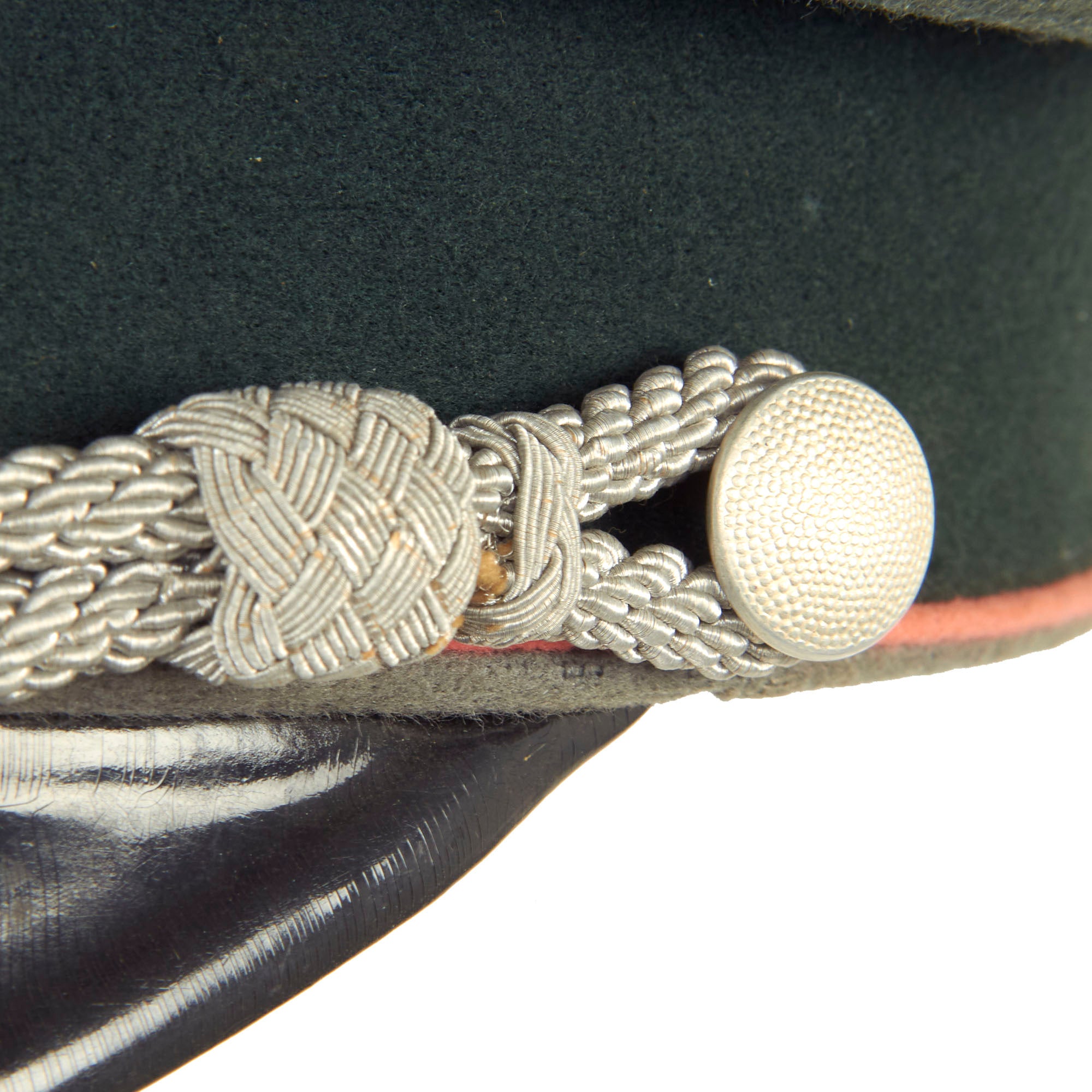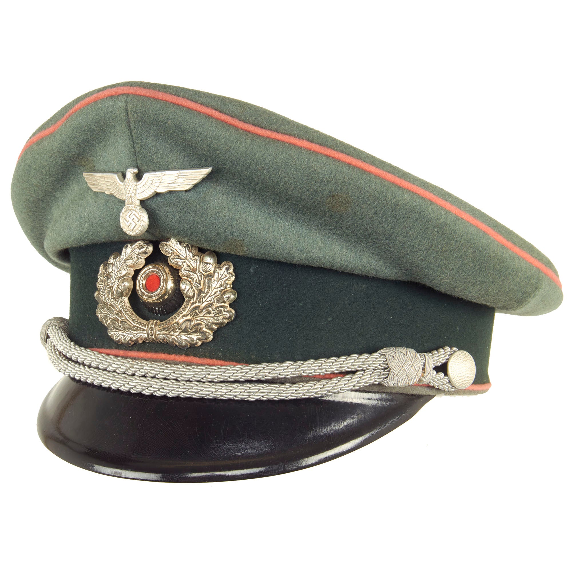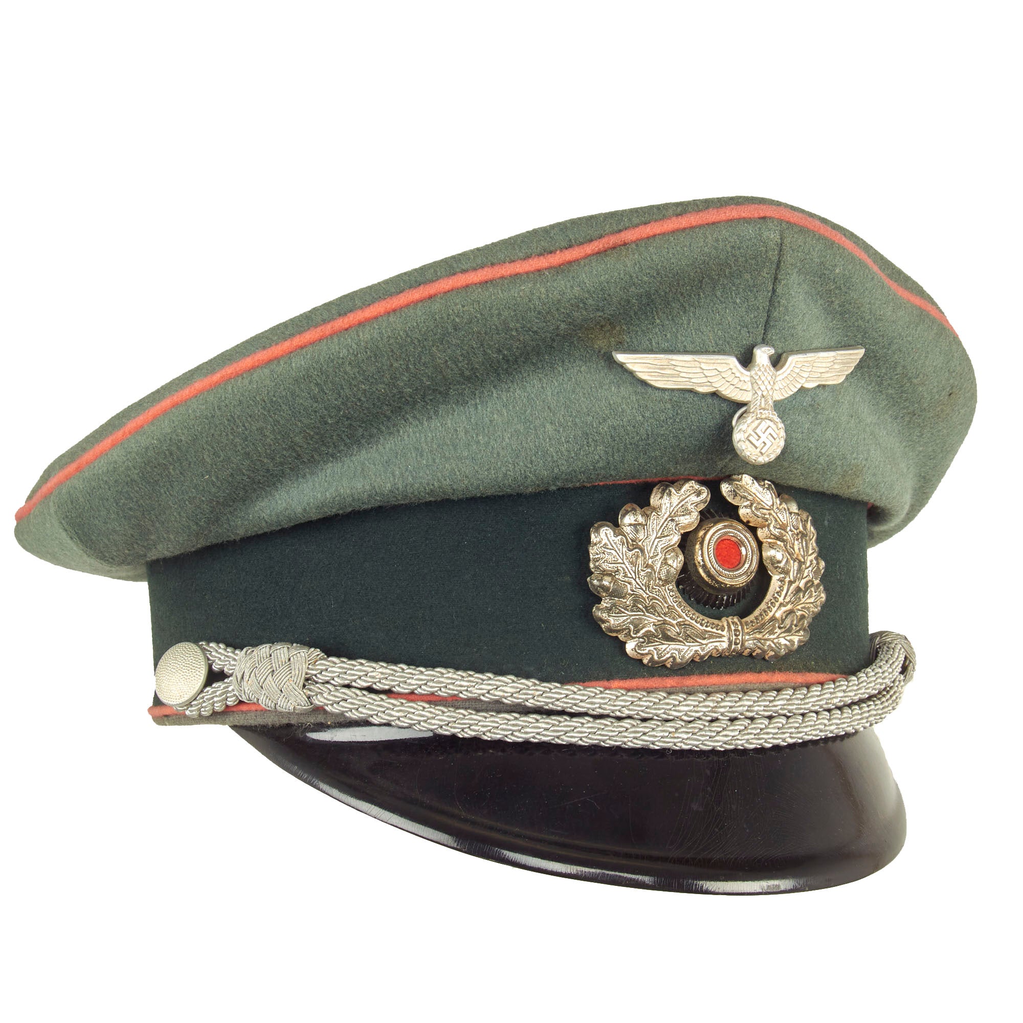 The visor cap (Schirmmütze) was an important part of the headgear worn by German uniformed military, civil, paramilitary and political organizations during the Third Reich. This was the standard cloth headgear worn as a part of the service uniform. Visor caps were worn outdoors as well as indoors, and were often required to be worn by all personnel on duty. Visor caps were made in versions specific to each organization and were often further differentiated through the use of insignia, colored piping, or style of chin cord, to indicate rank, role or branch. The insignia used on these caps ranged from simple stamped metal emblems, to elaborate hand embroidery. Visor caps were issued to enlisted soldiers and NCOs in the military and in some other organizations. Officers had to purchase their own hats, and lower ranks could choose to purchase caps that were of a higher quality than the rather basic, issue examples. The private purchase caps were generally made in very high quality, with fine materials. A wide variety of fabrics were used, from Trikot and doeskin, to heavy wool, or even lightweight white fabric for summer wear. In the military, issue of these caps was generally suspended shortly after the outbreak of the war, but they continued to be worn by some troops until the end of the war.