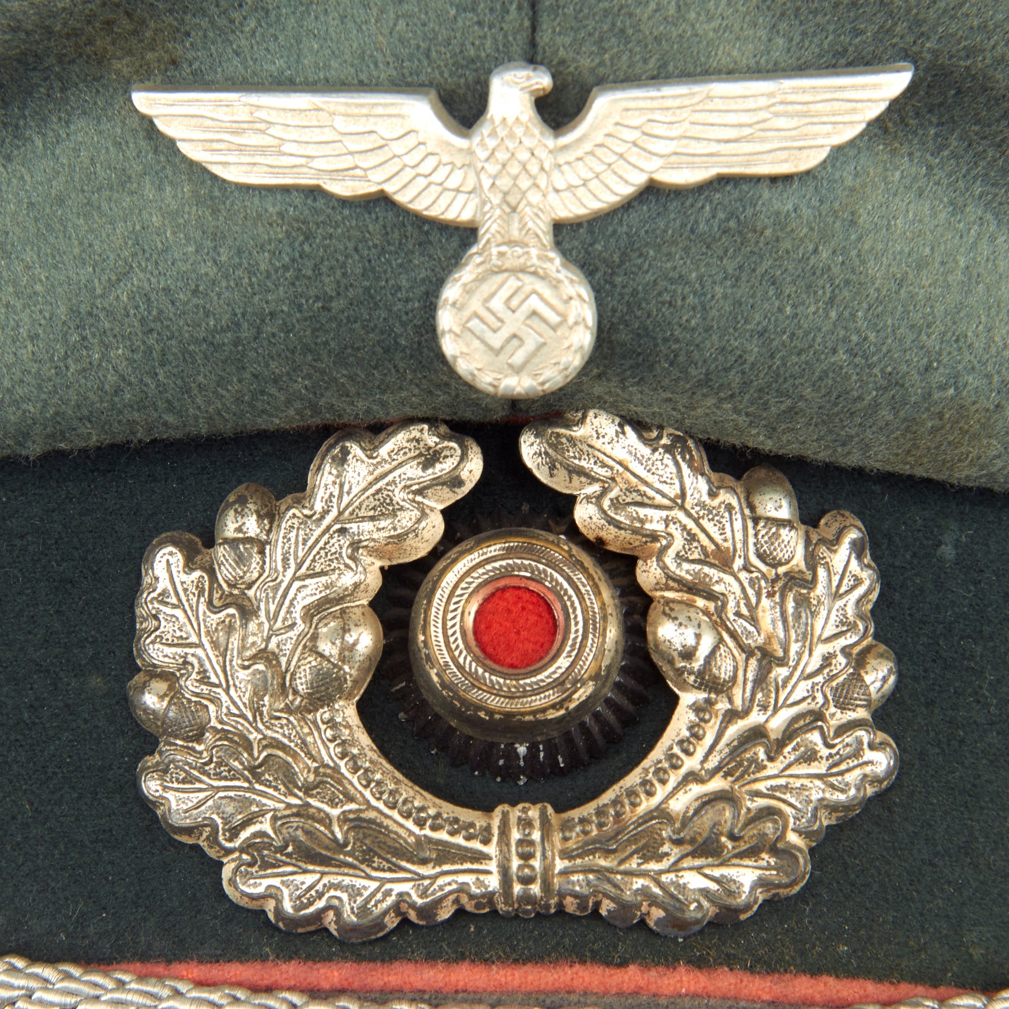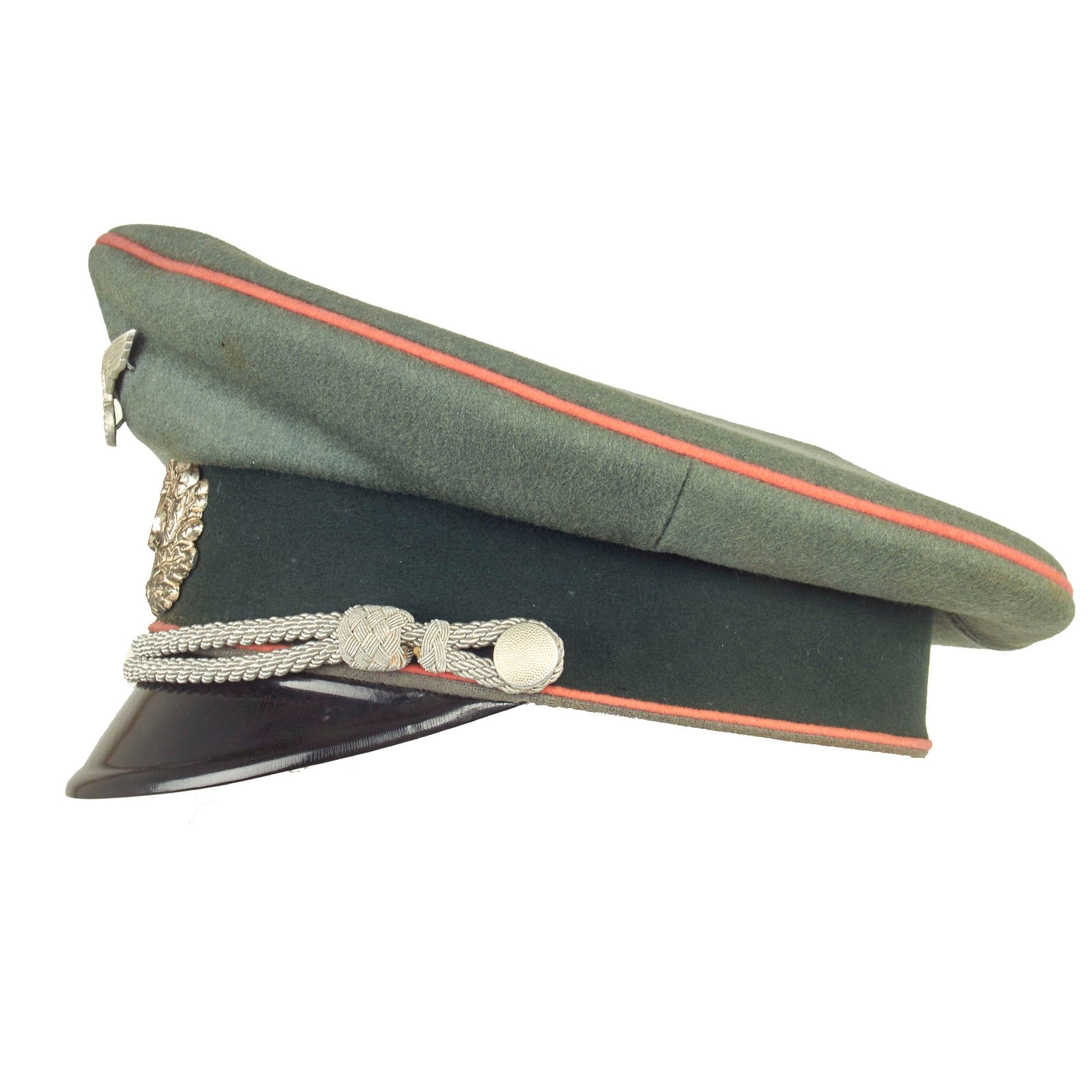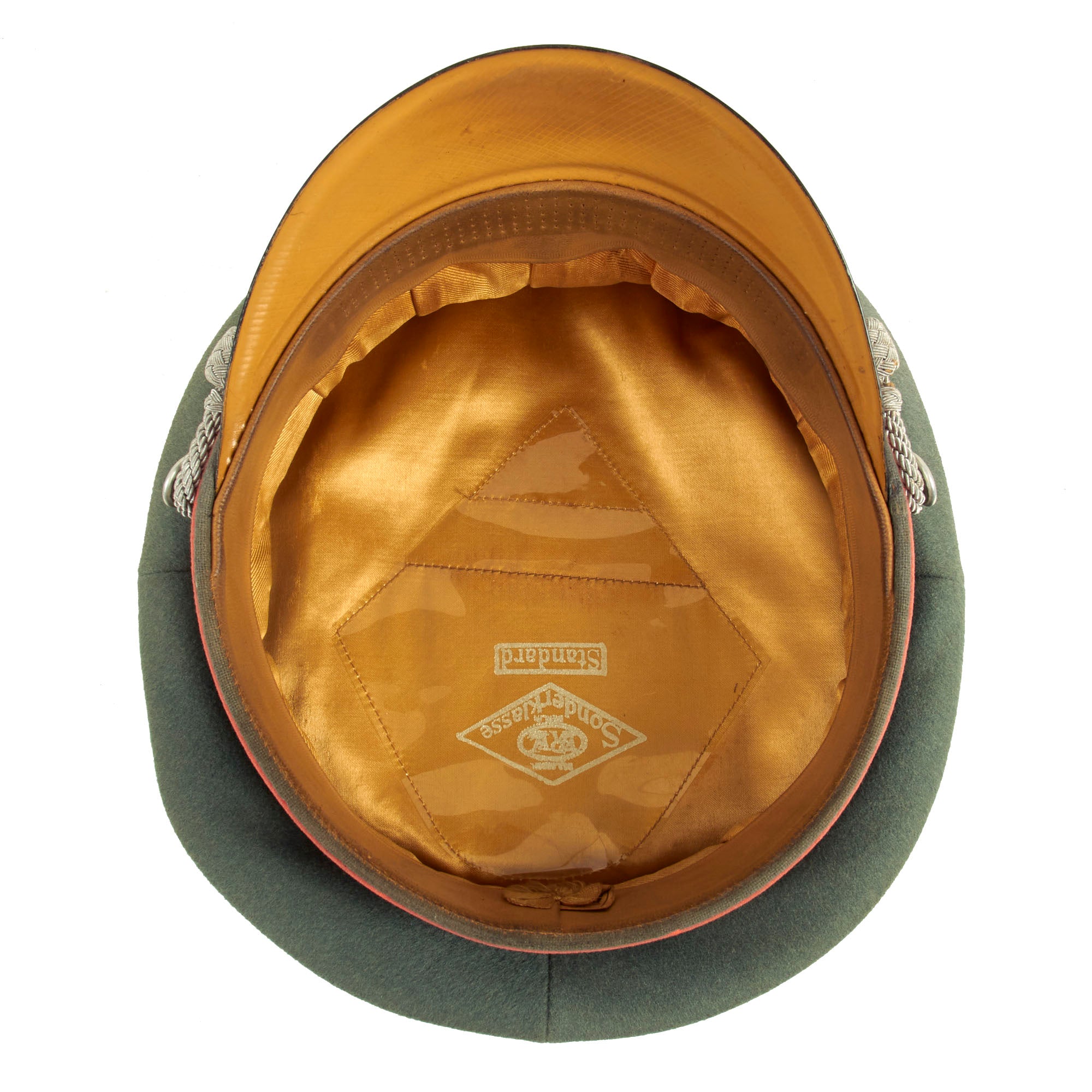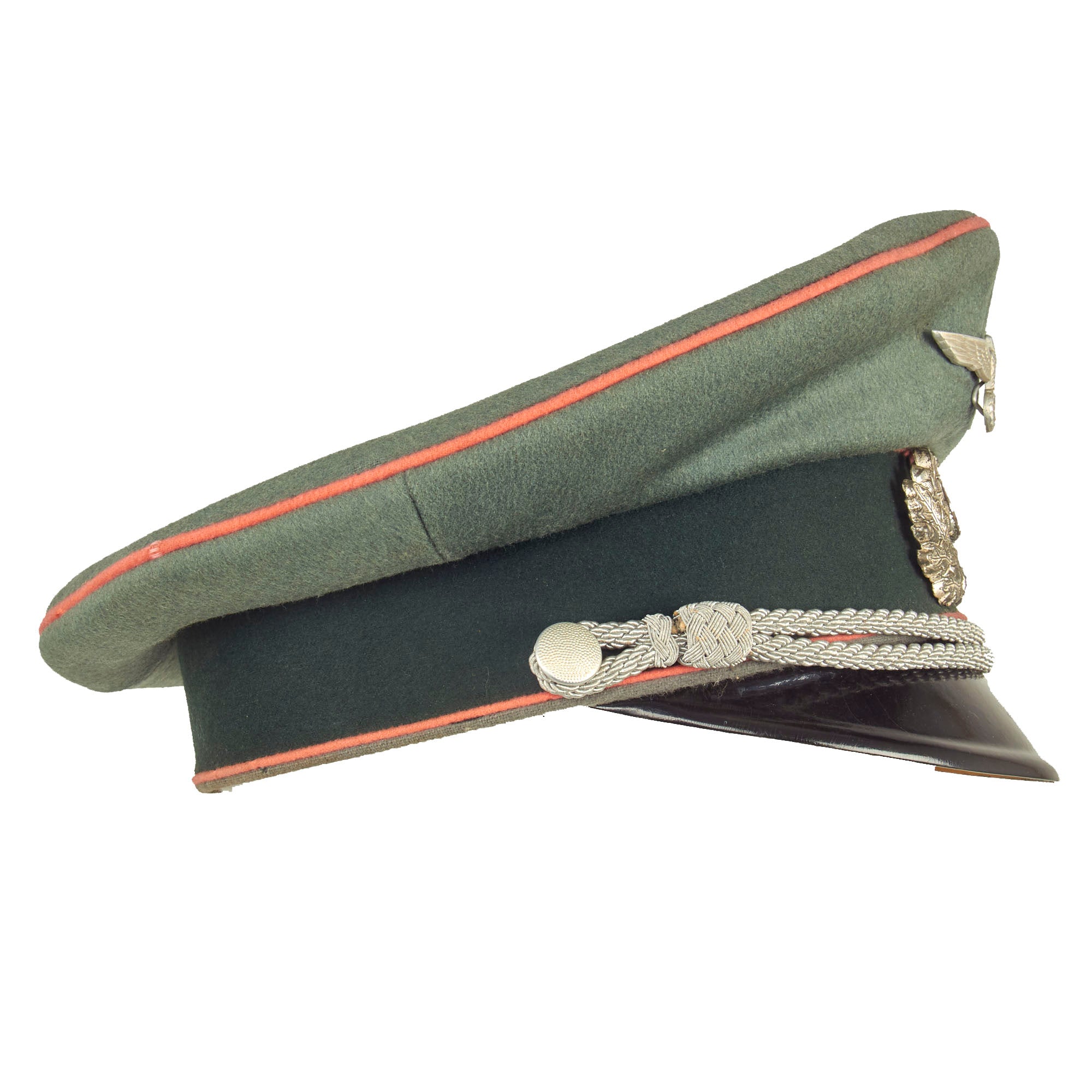 The visor cap (Schirmmütze) was an important part of the headgear worn by German uniformed military, civil, paramilitary and political organizations during the Third Reich. This was the standard cloth headgear worn as a part of the service uniform. Visor caps were worn outdoors as well as indoors, and were often required to be worn by all personnel on duty. Visor caps were made in versions specific to each organization and were often further differentiated through the use of insignia, colored piping, or style of chin cord, to indicate rank, role or branch. The insignia used on these caps ranged from simple stamped metal emblems, to elaborate hand embroidery. Visor caps were issued to enlisted soldiers and NCOs in the military and in some other organizations. Officers had to purchase their own hats, and lower ranks could choose to purchase caps that were of a higher quality than the rather basic, issue examples. The private purchase caps were generally made in very high quality, with fine materials. A wide variety of fabrics were used, from Trikot and doeskin, to heavy wool, or even lightweight white fabric for summer wear. In the military, issue of these caps was generally suspended shortly after the outbreak of the war, but they continued to be worn by some troops until the end of the war.