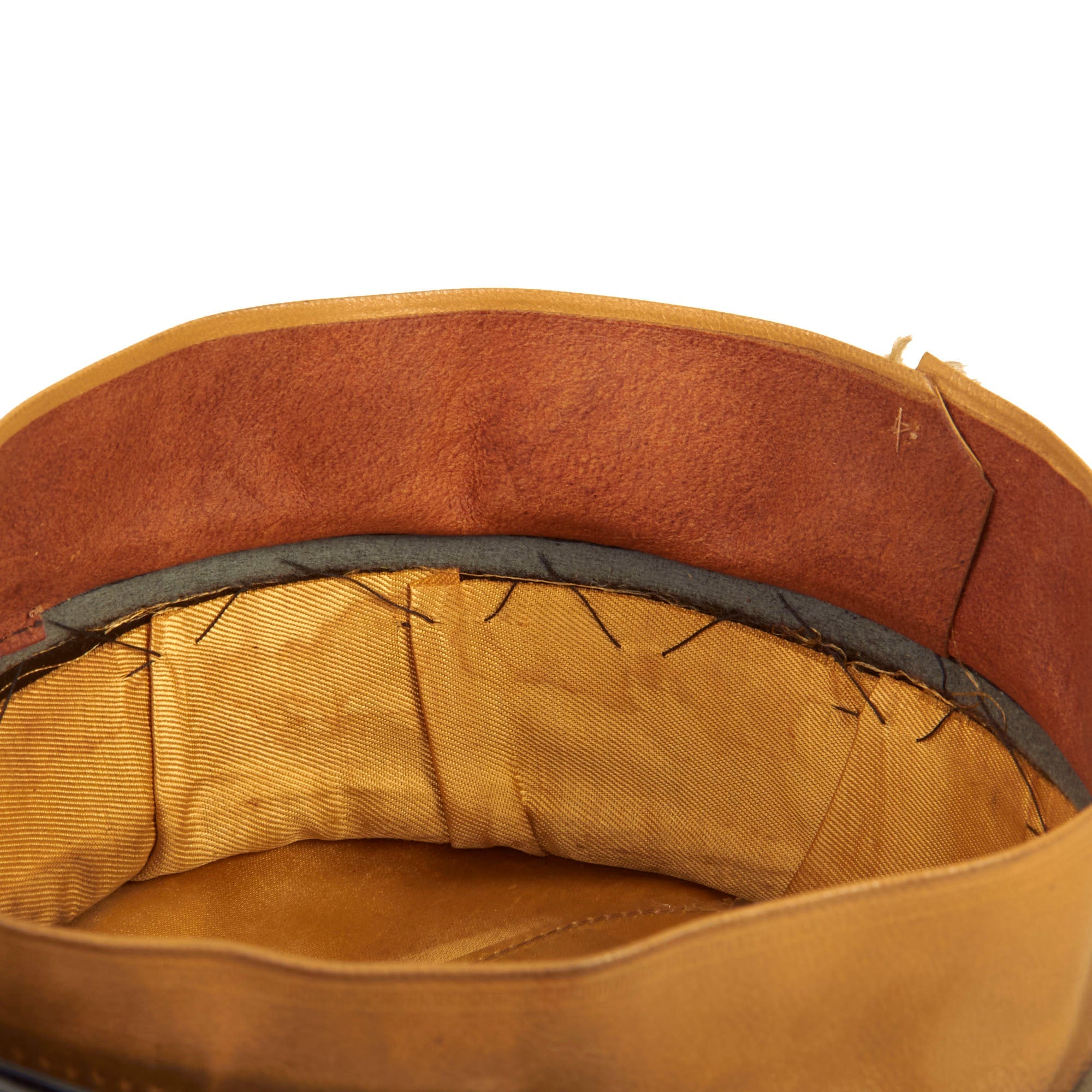 It is decorated with a well detailed aluminum eagle insignia on the peak and and an open silvered cast zinc oak leaf and acorn wreath surrounding an metal tri-color cockade on the band. The red felt insert inside the cockade is present and vibrant, however the wreath and cockade metal has lost some of the silvering. The chin strap is attached with the standard pebbled buttons on either side of the cap. The vulcanfibre visor has a smooth black leather-look upper, exhibiting only light wear along the edge, and is beige on the underside. It also has a lovely pattern of light crazing and checking on the black enamel finished top. The tan leather sweatband is still in very good condition, supple with no tears, showing moderate wear. There is a size 57 1/2 tag at the rear.