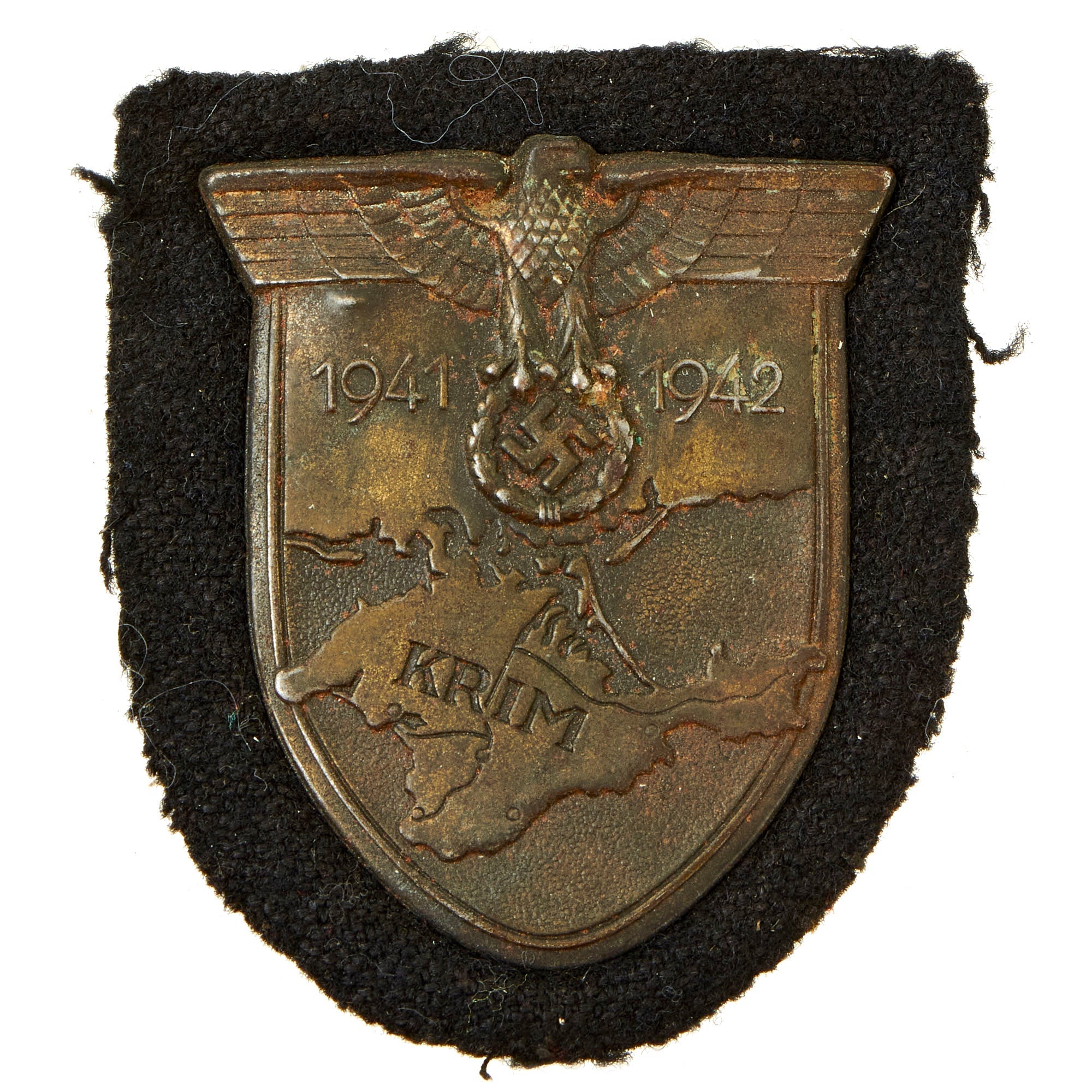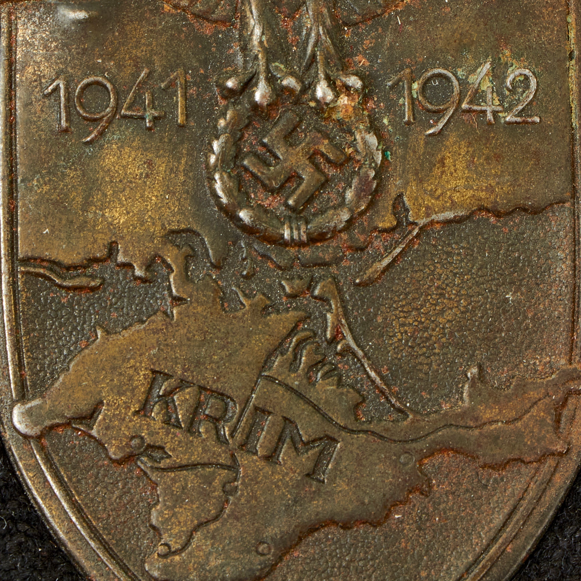 The shield is headed by the German eagle clutching a laurel wreath surrounding a swas. Flanking the eagle are the dates 1941 and 1942, which represent the start and end dates of the campaign. This sits on the backdrop of the Crimean peninsula, where the fighting took place, which has the word KRIM stamped across it.