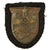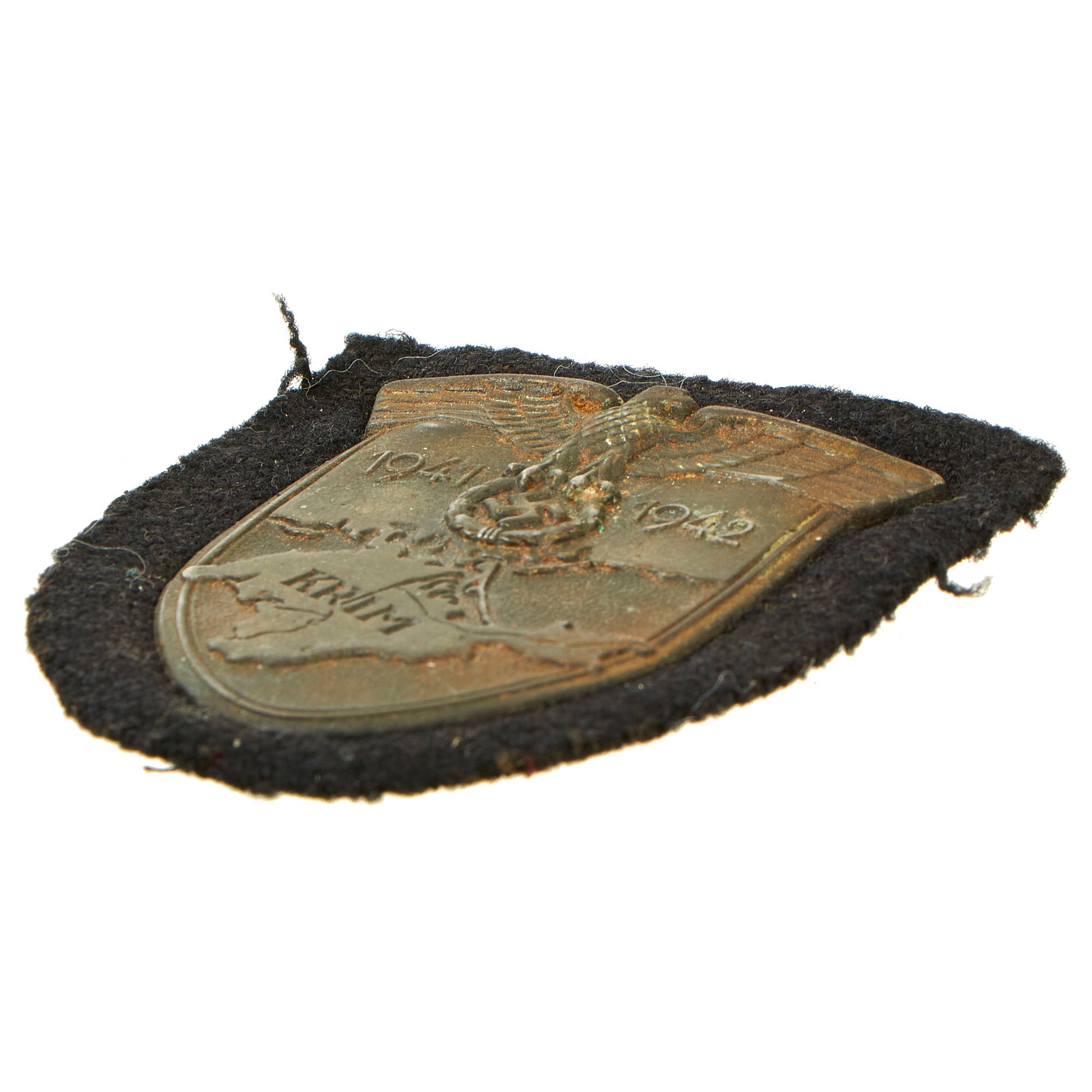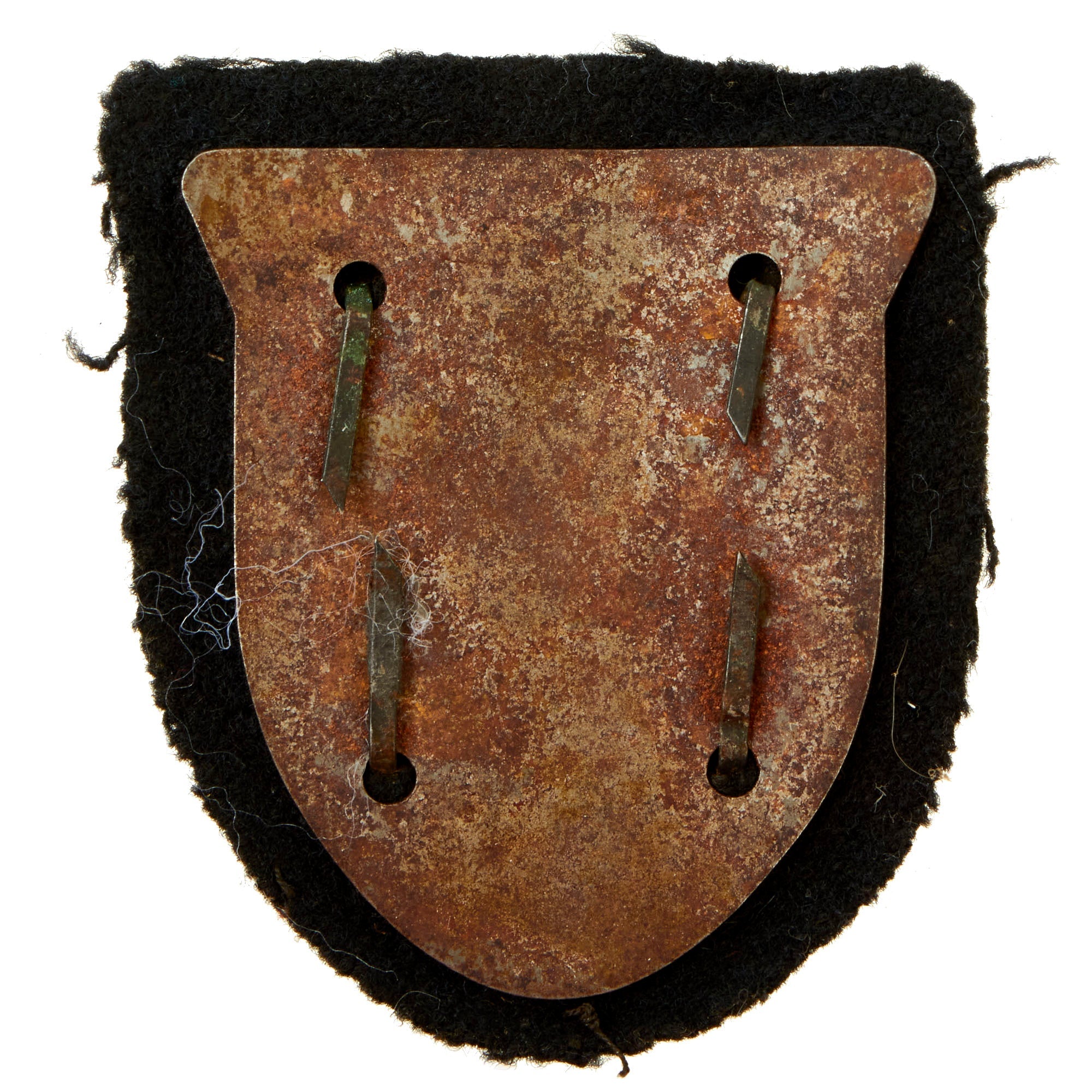 Original Item: Only One Available. This is a lovely example of the German WWII Crimea Shield award, still retaining the original metal backing plate, which holds a black wool backing from the German Panzerkorps in place. We have never had one of these before! The wool is in great shape, with just a bit of fading, and no mothing. All four clips on the back are still intact, and hold the steel backing plate in place, which does show some surface oxidation.