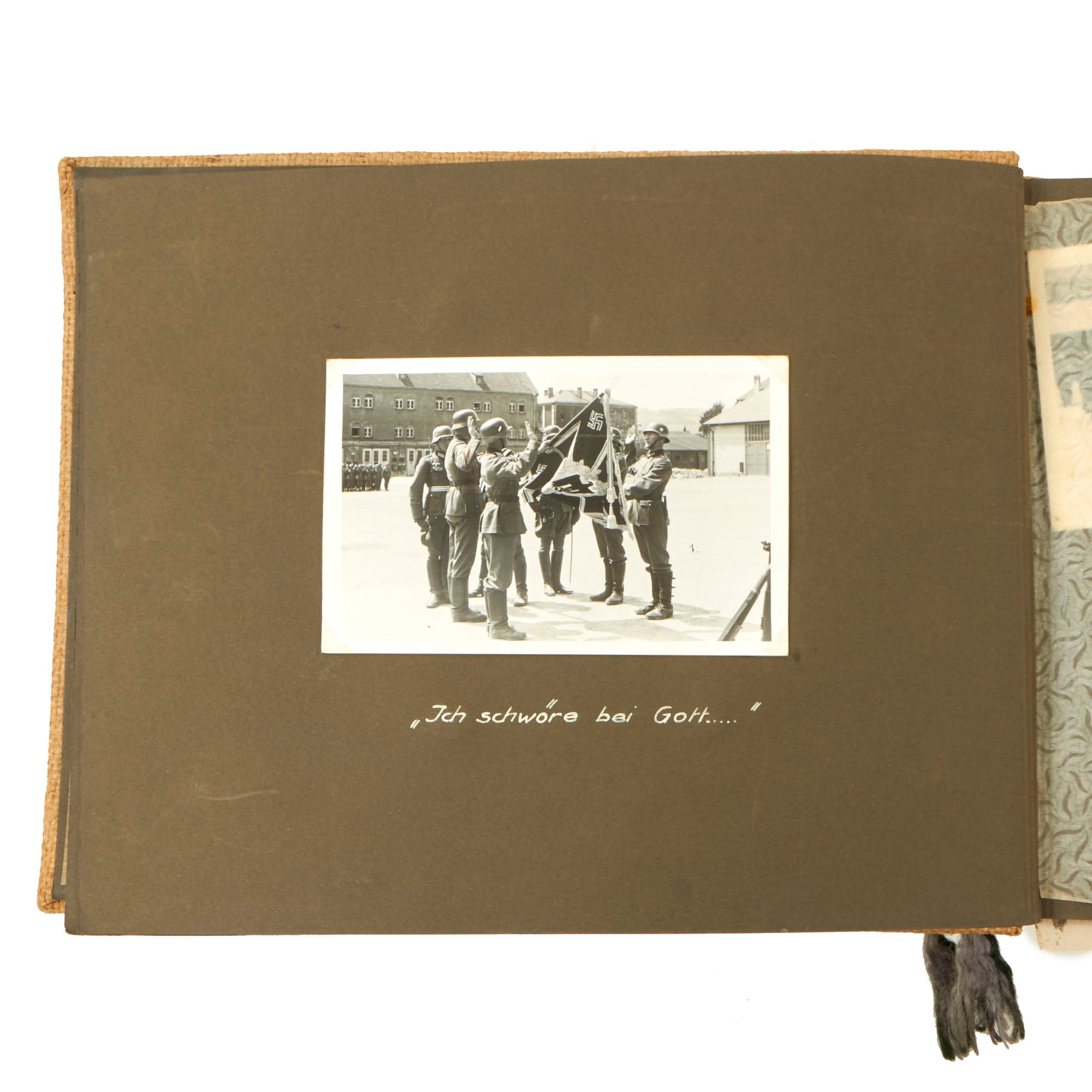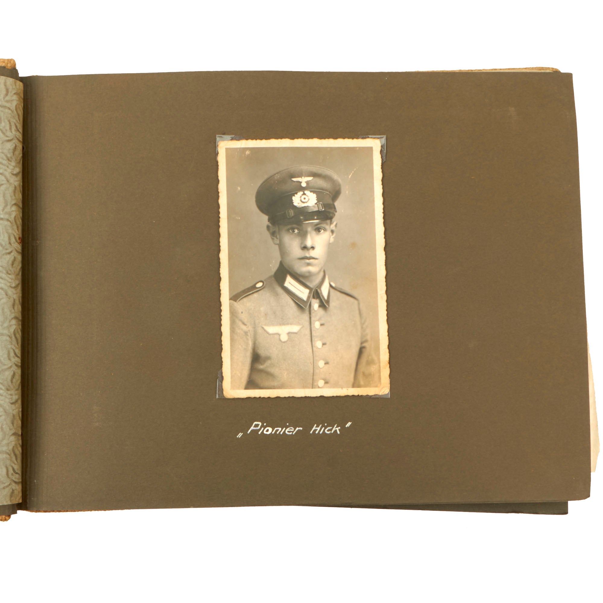 A total of 180 photographs fill the pages of this album, making it a treasure-trove of images taken from the viewpoint of a young, patriotic German soldier. These are contained on 24 pages, all of which have "Onion skin" separators. Opening the front cover shows the following message, made from cut out fabric letters glued to the page under a "Pioneer" logo:
