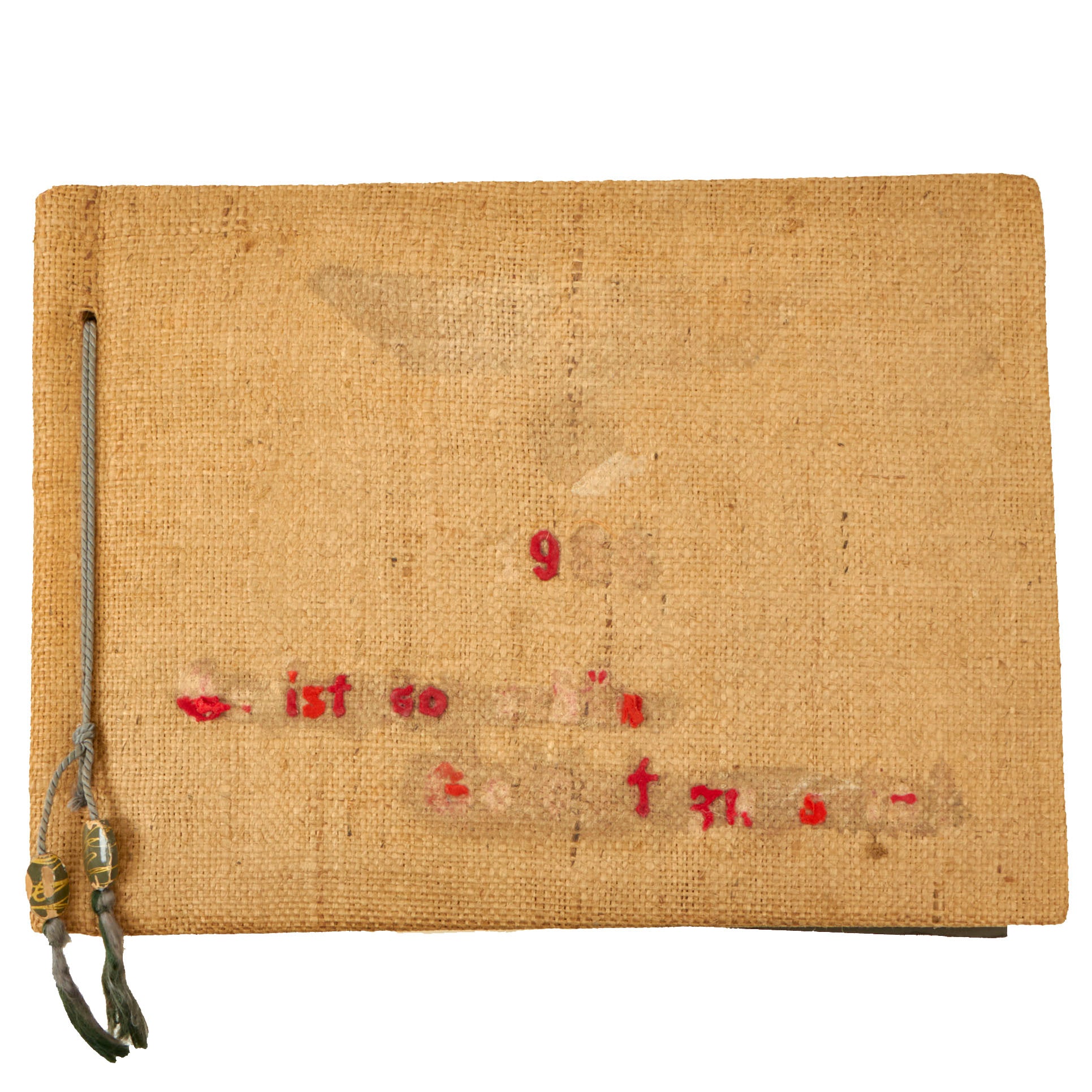 Original Item: One-of-a-kind-set. Here we have a wonderful Army Heer personal photo album, filled with what looks to be almost entirely personal photographs. It is covered with what looks to be burlap fabric, and it also looks like originally there was some type of label or message on the front in red felt, however almost all of this has peeled away, so we cannot read what it says. The album measures 12 3/4" x 9 1/2", and is bound with blue rayon cord through the binding. This really looks like it was made or customized using a commercially made album, and it is definitely unique in more ways than that!
