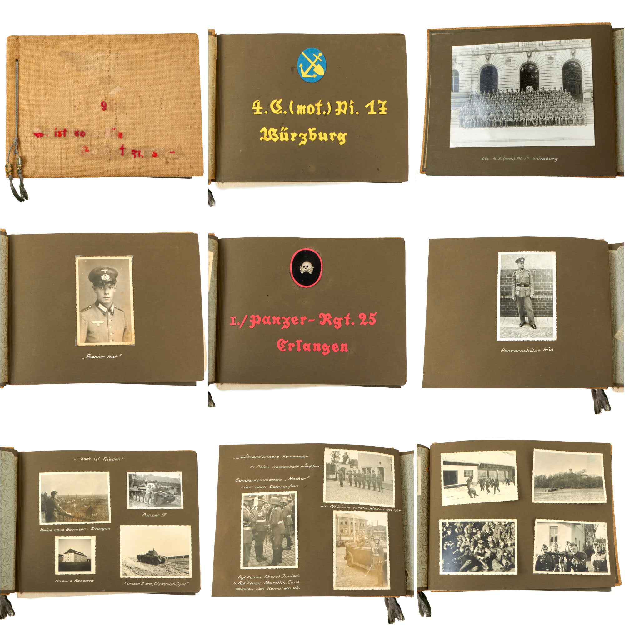 The reverse of this page shows another photo of Hick, however this time he is listed as Panzerschütze Hick, and the following pages show 56 photos, many of them showing armored vehicles. Many of these are also captioned, and we can see a Panzer II, a Panzer IV, and lots of other armored vehicles. There are even some photos of tanker troops wearing their iconic black uniforms and Panzer "berets"! There are also some personal and "at ease" photographs interspersed.