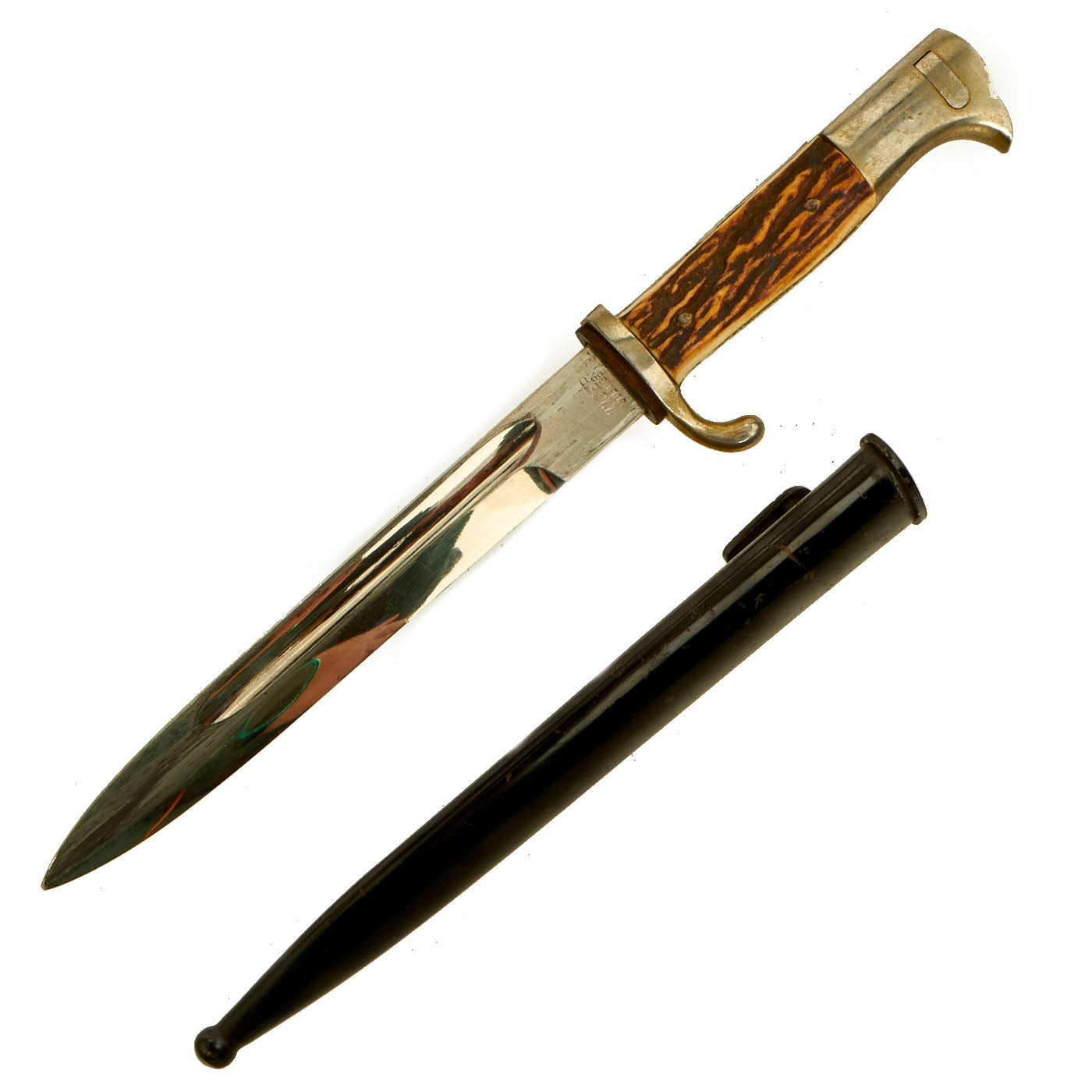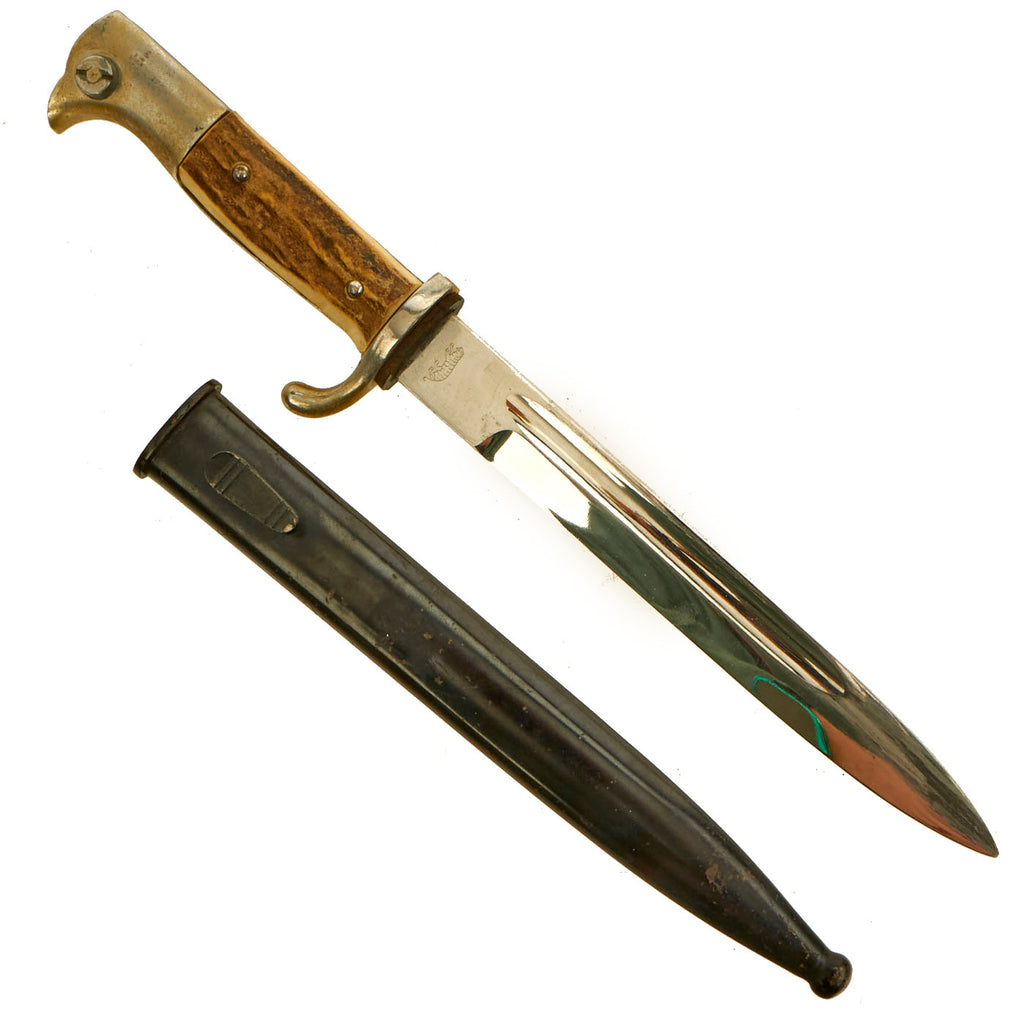 An great example of an German short 98k dress bayonet by a desirable maker with staghorn grips, complete with scabbard. Ready to display!