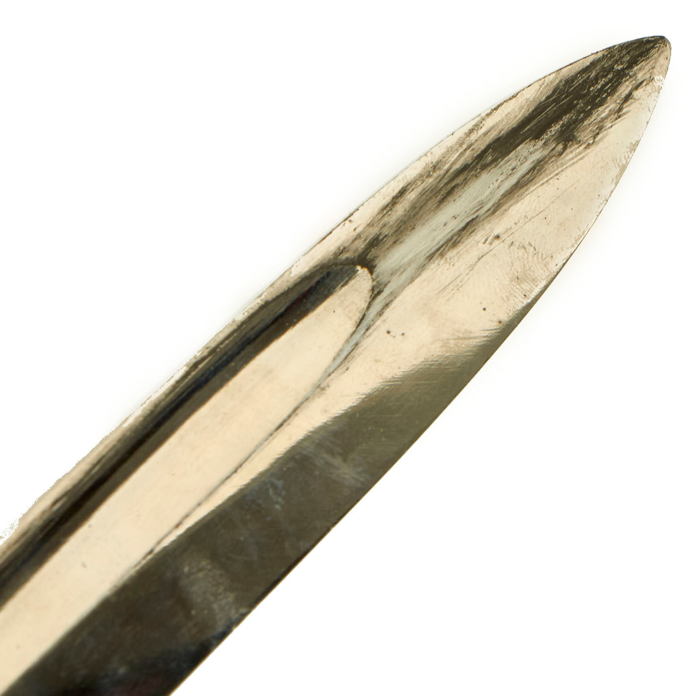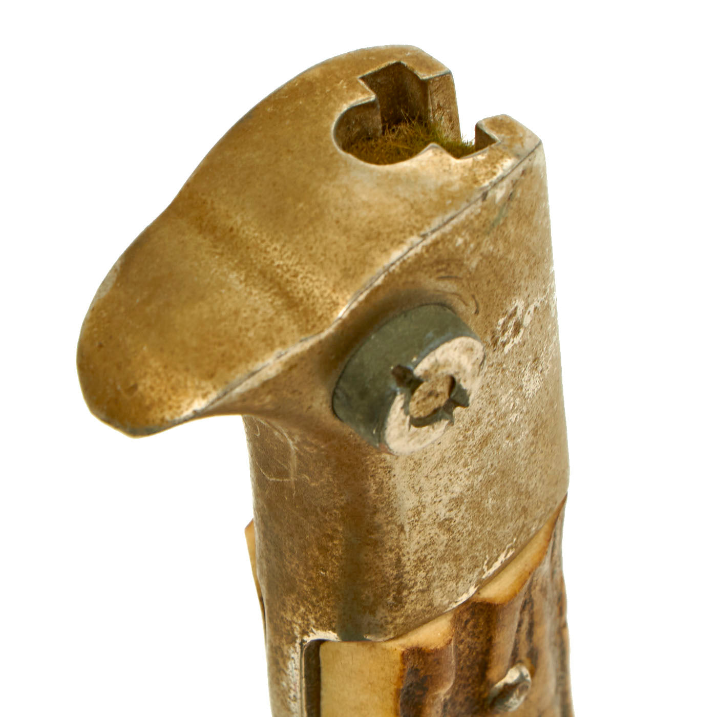 The blade on this example is nickel-plated, as were all dress bayonets, and there is only some light oxidation, as well as wear from the runners in the scabbard. It has not been sharpened, and still retains its blunt factory edge. The original leather blade buffer is in place, and is in excellent condition. The ricasso is marked with the "Left Facing Tiger" trademark of the Lauterjung & Co. firm, and the reverse side is marked with: