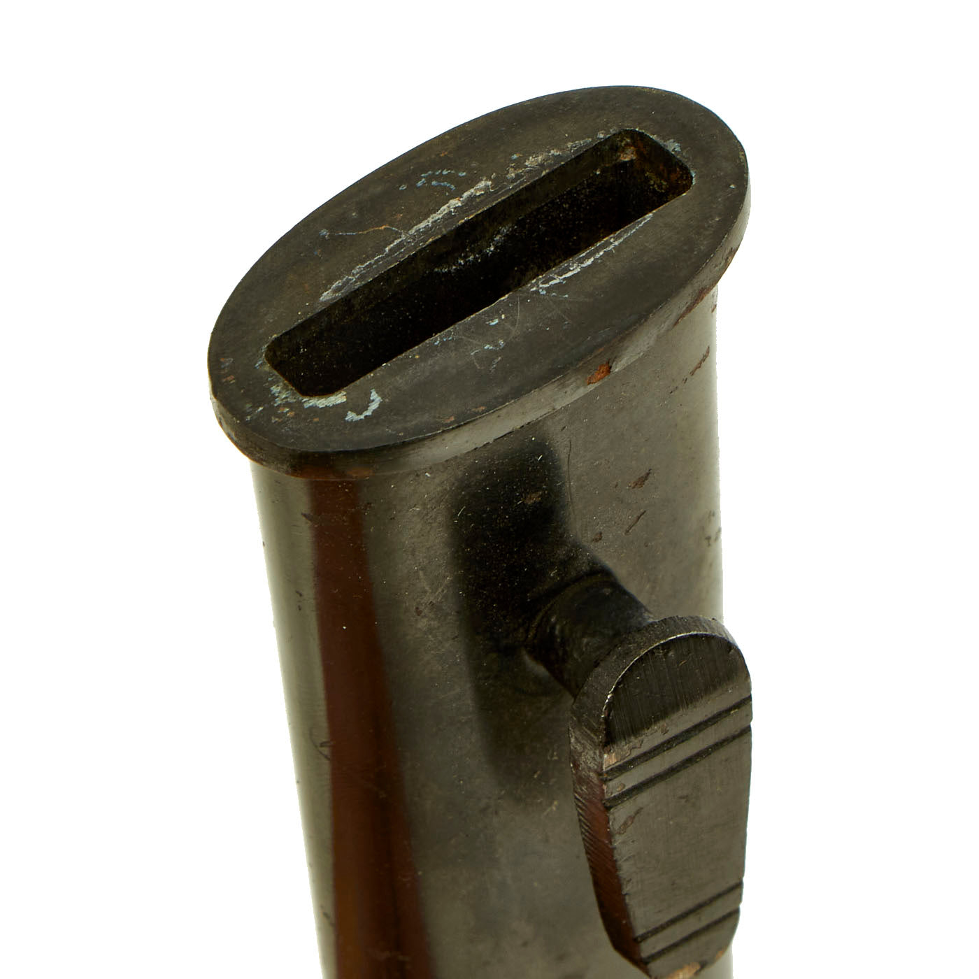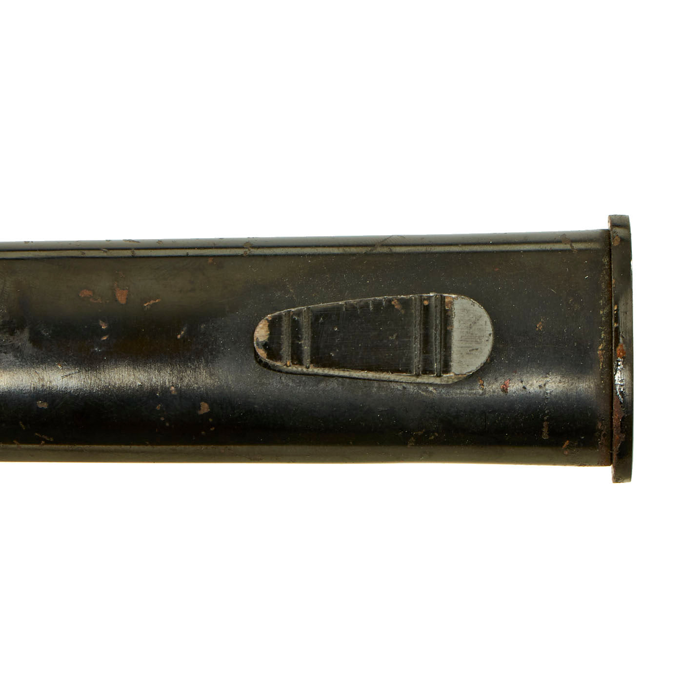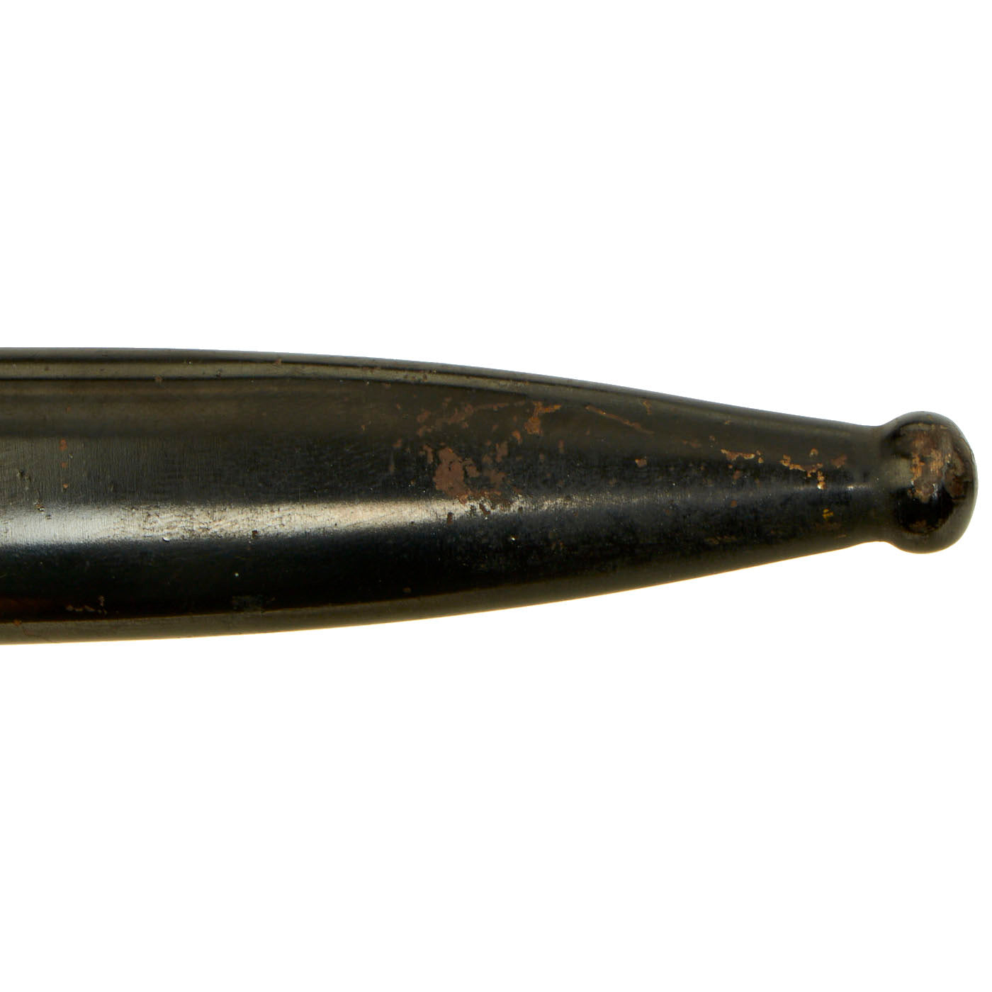 The scabbard is straight throughout and has black enamel paint. This paint is still in very good condition with only light scratching and chipping, with the usual crazing and checking from age.