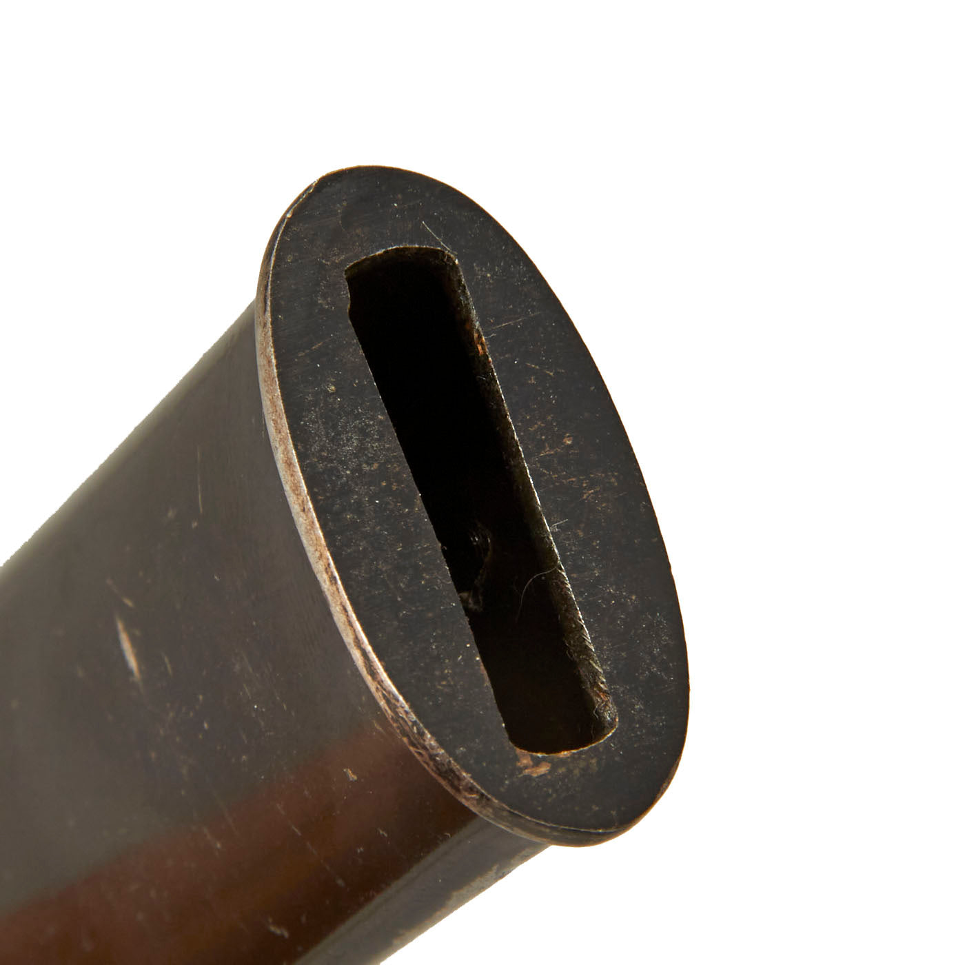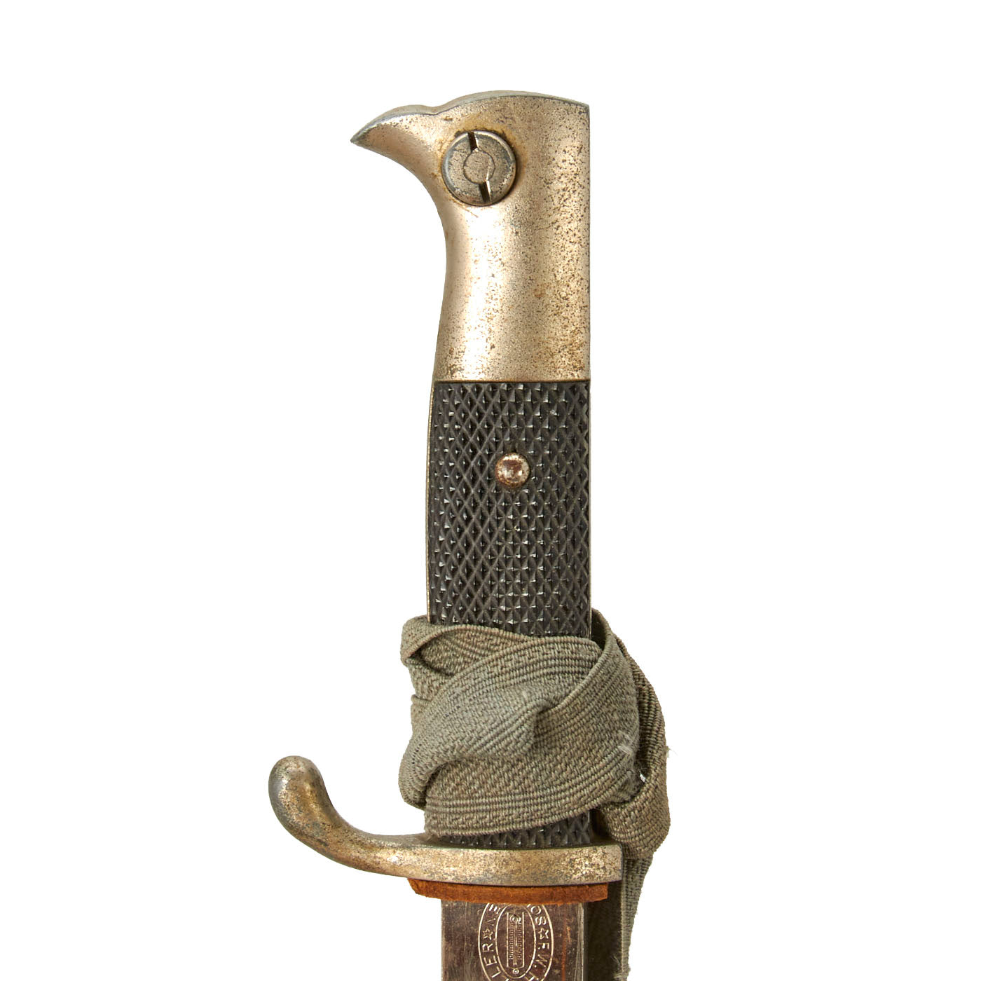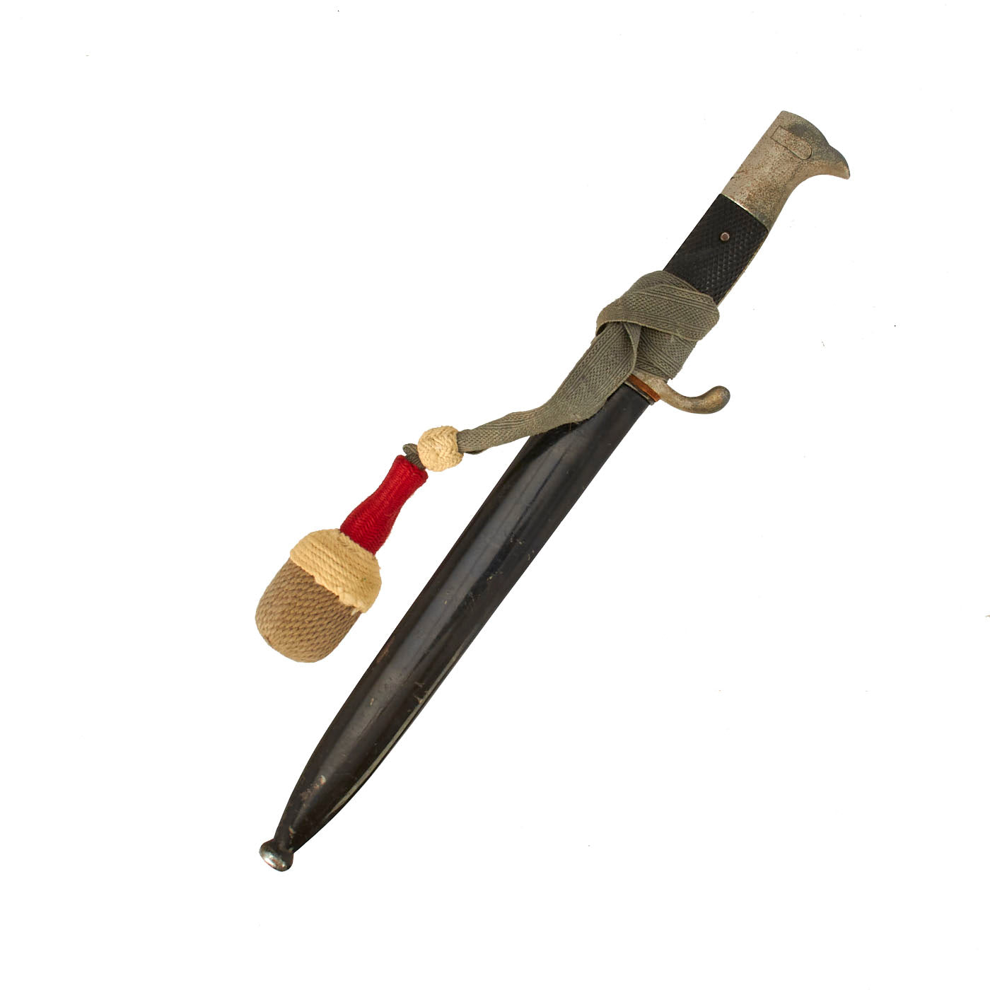Original Item: Only One Available. The K-98 dress bayonet was a dress version of the combat style, and was worn by enlisted and NCO personnel for dress and parade occasions. The bayonets were finished with a high-quality nickel plating, with stag or bakelite grip plates and black painted scabbard. The choice of blade length was left to the purchaser, being nickel-plated short (20cm) or long (25cm) version. There was usually a red or green colored felt insert in the rifle slot and the bayonet was suspended from a black or brown leather frog. Some had a functional bayonet latch, while it was ornamental on some. Often they would also have a sword knot, or troddle, and the color would indicate the branch or rank.
