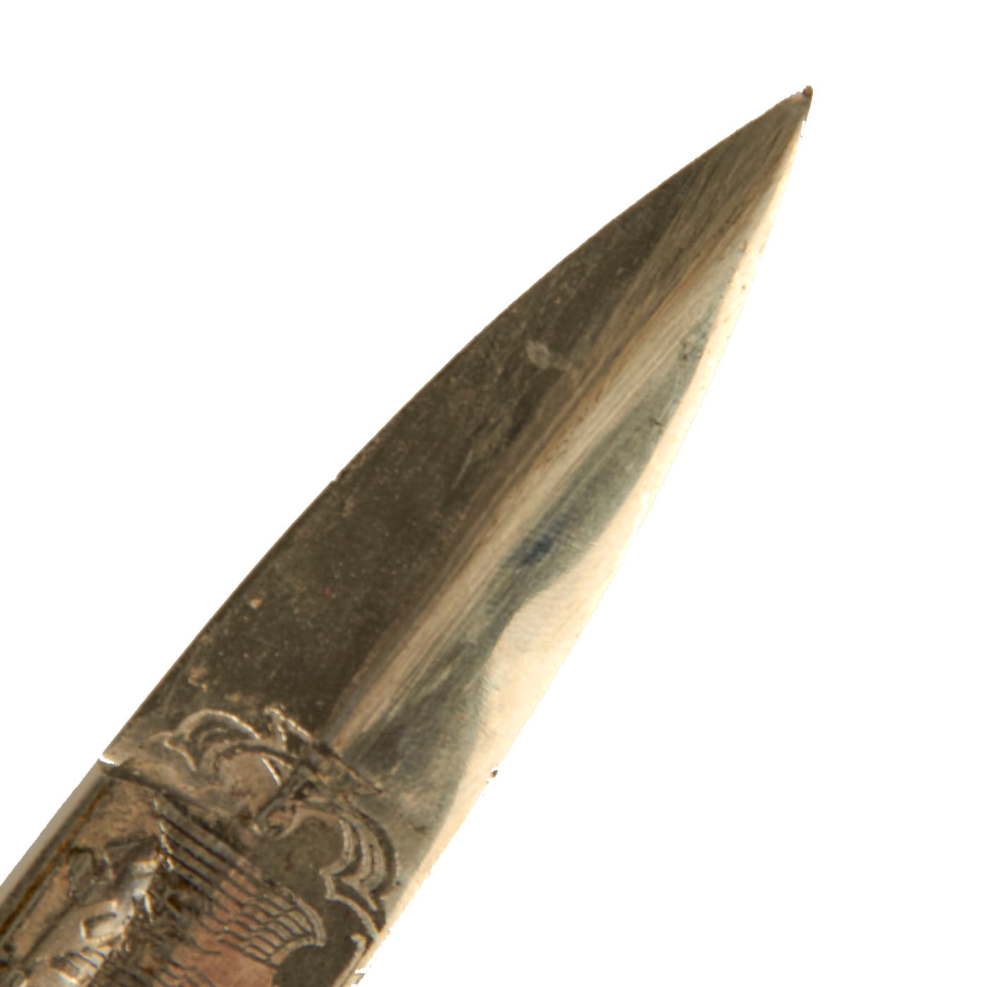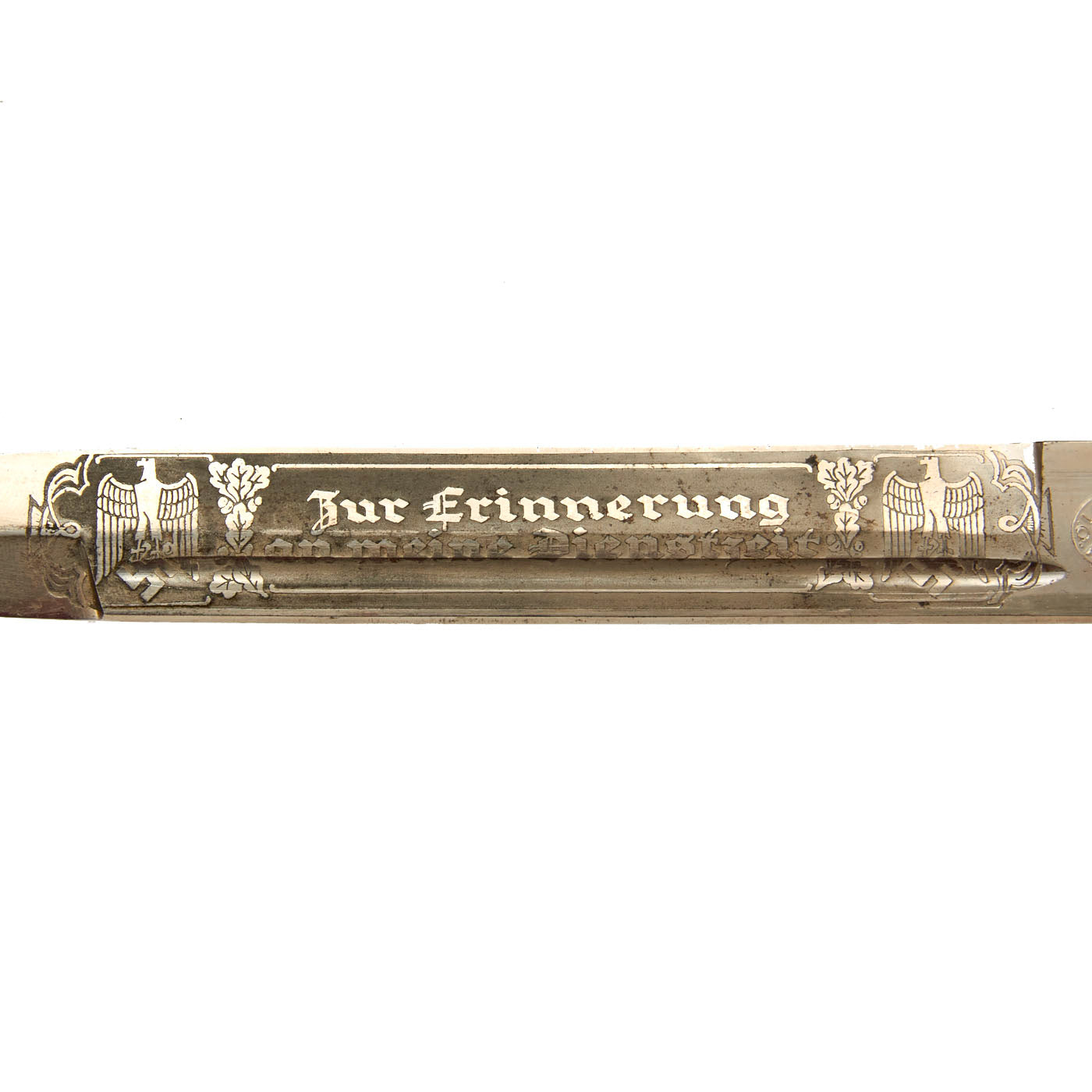 Measuring 13.5" (345 mm) with the scabbard on, this dress bayonet features a 7 3/4" (200 mm) nickel-plated steel blade with unsharpened edges, remaining bright and crisp. It is engraved Zur Erinnerung an meine Dienstzeit (In Memory of my Service Period) on the obverse of the blade, flanked by two Army (Heer) eagle insignias on the left and the right, the type and insignias each separated by clusters of oak leaves, with full length fullers on both sides.