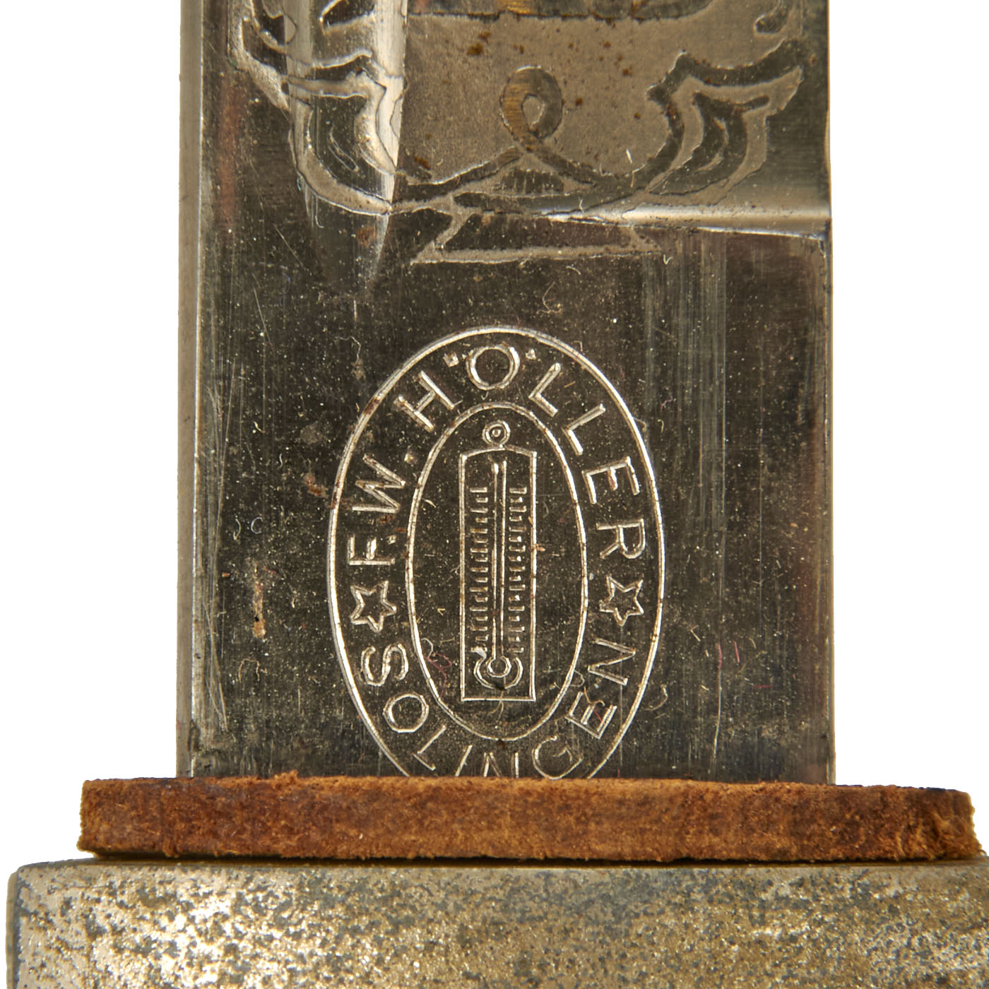 The ricasso is maker marked with a "losenge" style trademark logo that reads F. W. HÖLLER / SOLINGEN, surrounding the trademark Höller "Thermometer" emblem. This is a well-known maker from Solingen, the famous "City of Blades" in Western Germany, which produced many fine edged weapons.