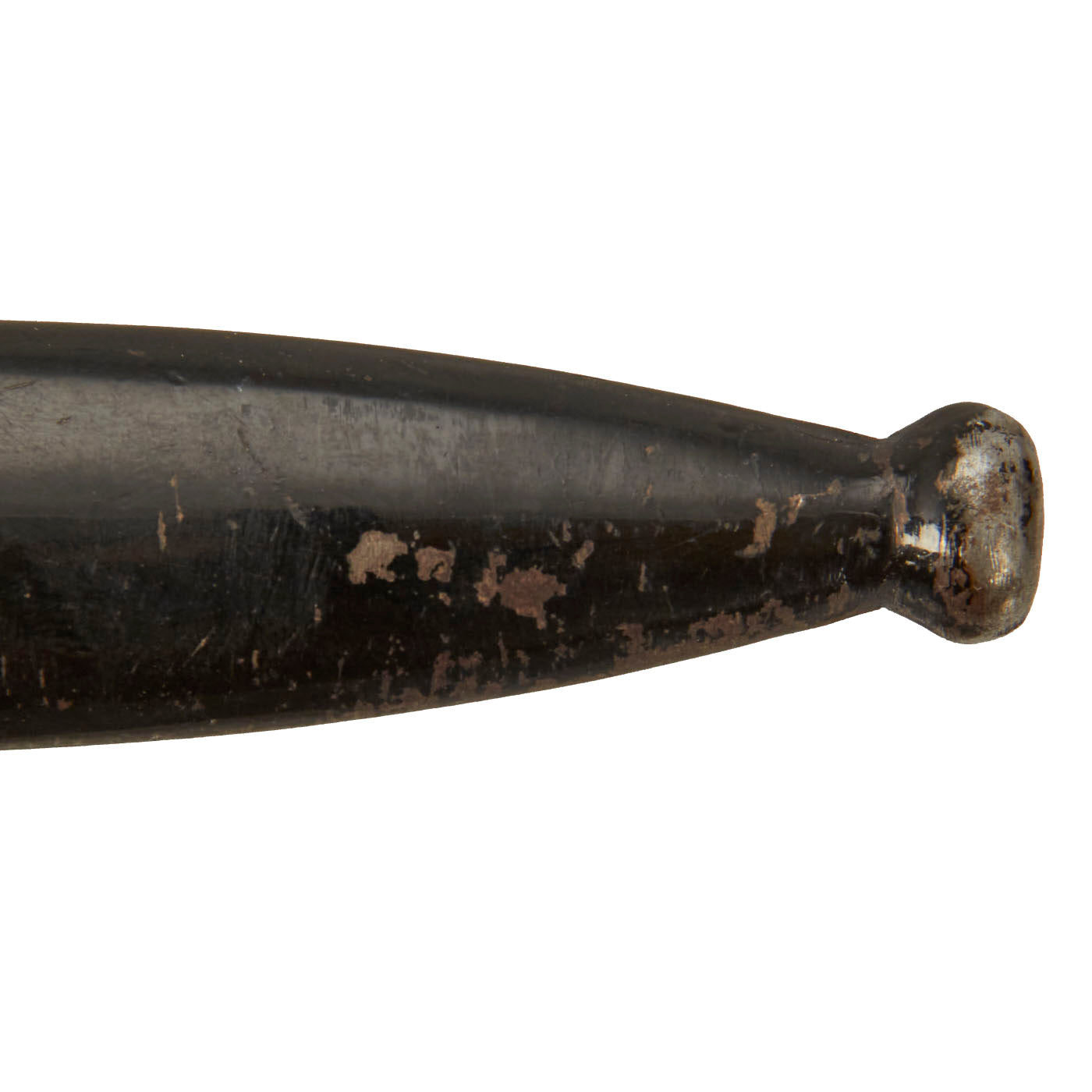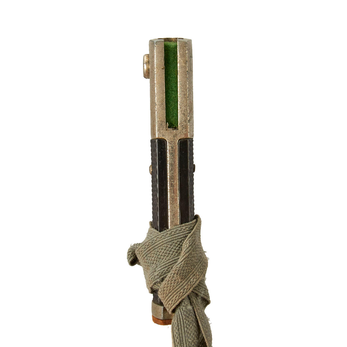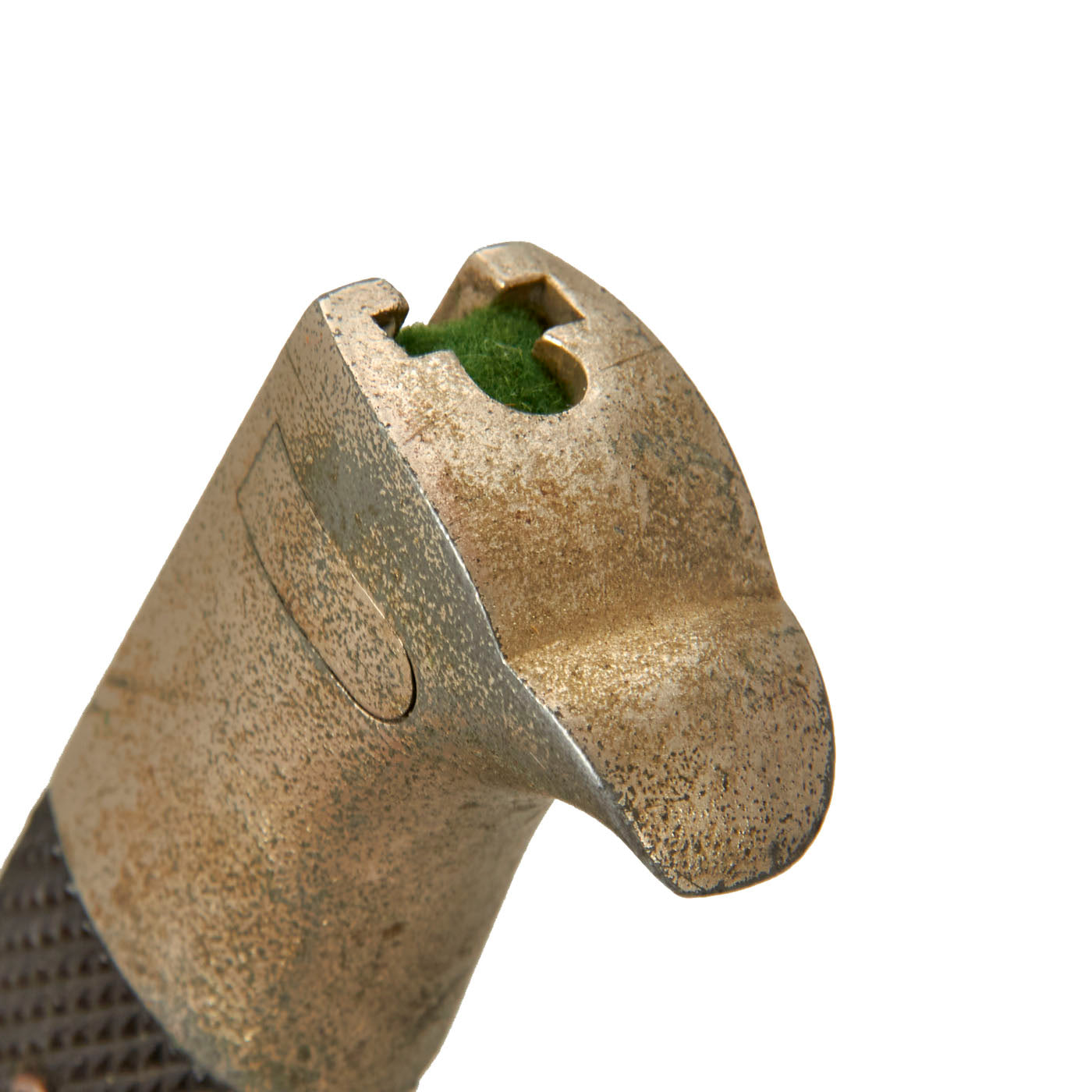 This very nice example is in very good condition, and comes complete with the scabbard troddel knot. The bayonet has a has a very nice custom etched nickel plated blade. It has has a nice alloy hilt, which still has some of the original nickel plating, but does show overall wear and oxidation as well. The mortise button and blade release are fully functional, with an intact green felt insert. The grip plates are both lovely checkered black bakelite, and both are in great condition. They are retained by plated steel rivets which have dressed heads on the obverse.